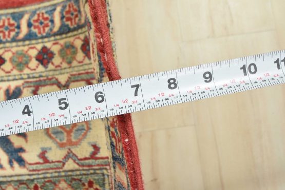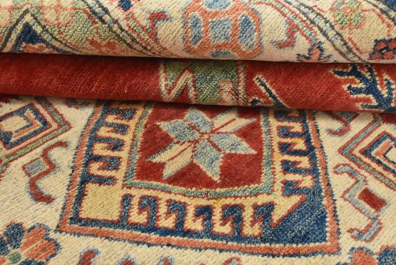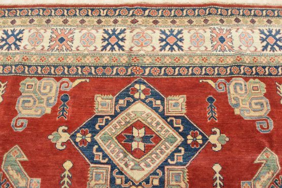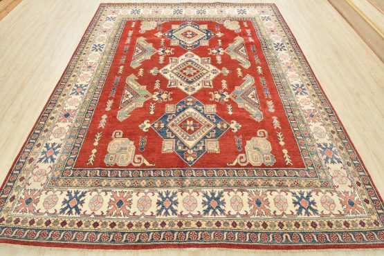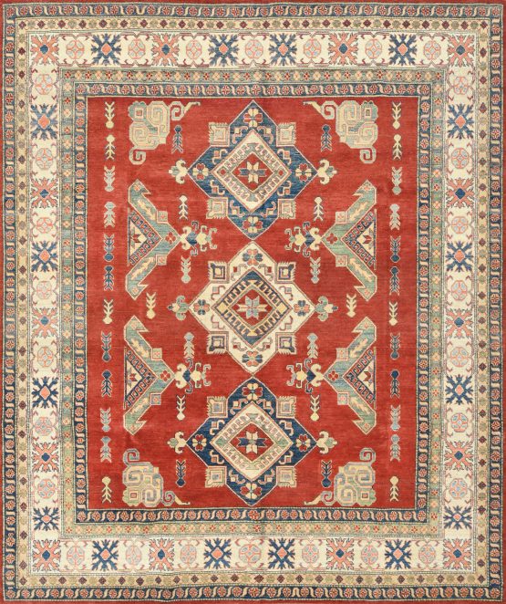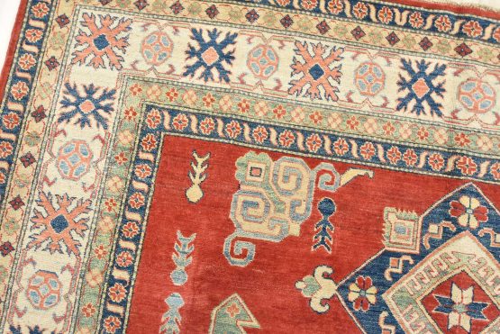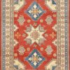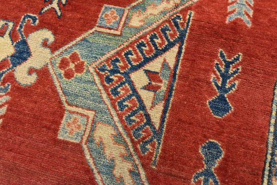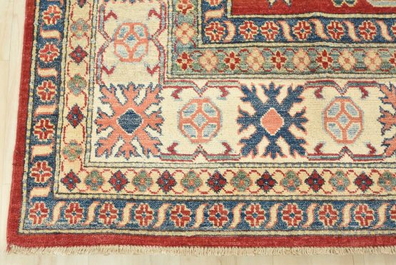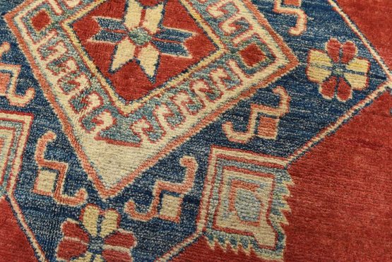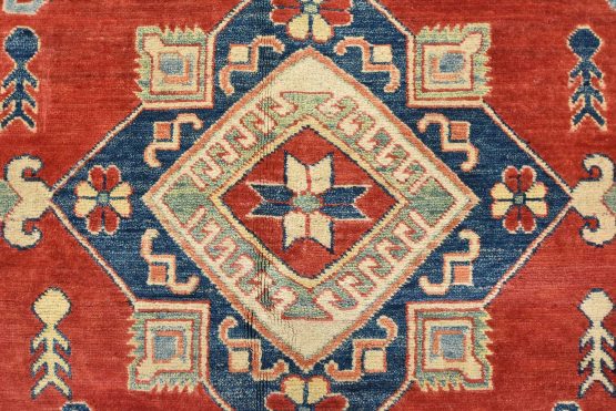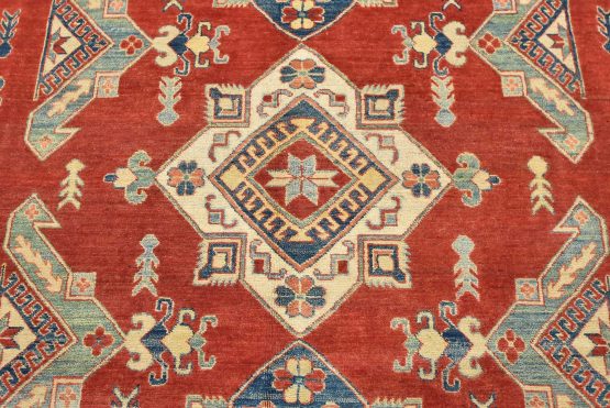A tribal Caucasian Kazak rug hand-knotted with an all-wool pile on a cotton foundation. This oriental rug features geometric medallions surrounded by geometric motifs set against a red background. It is new and in excellent condition.