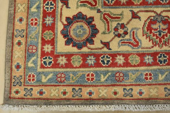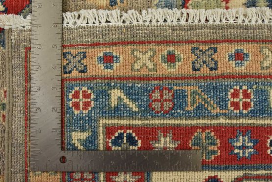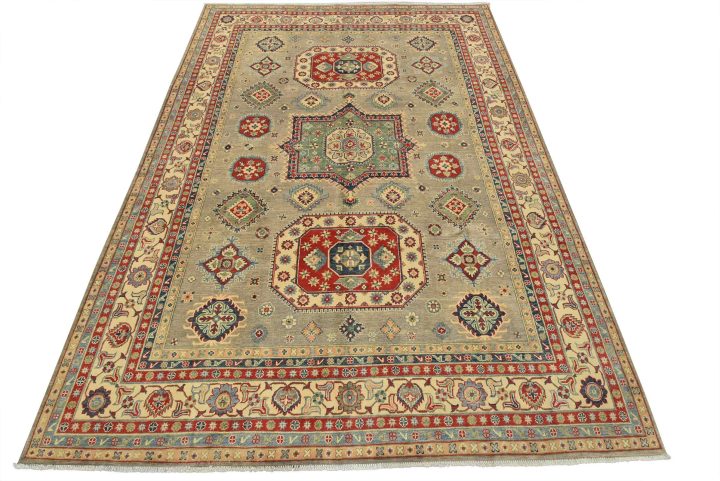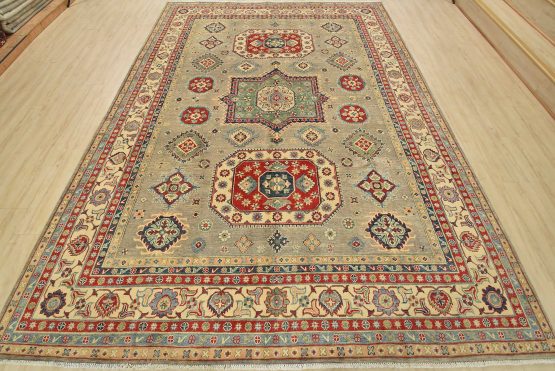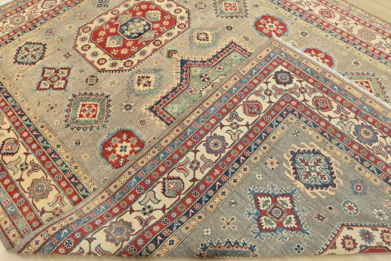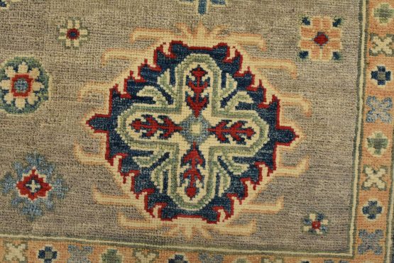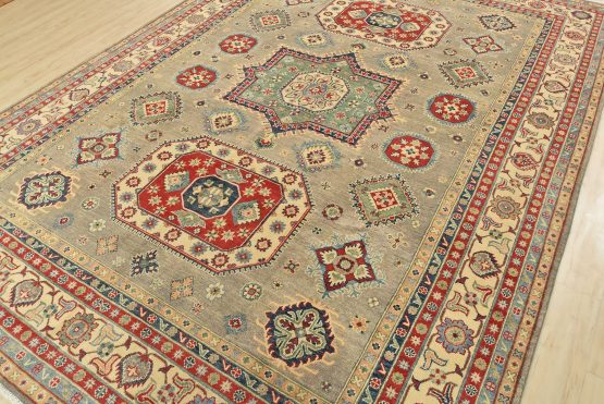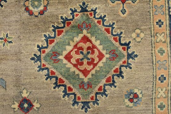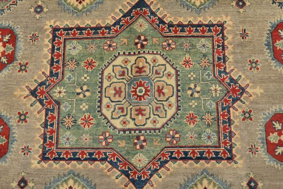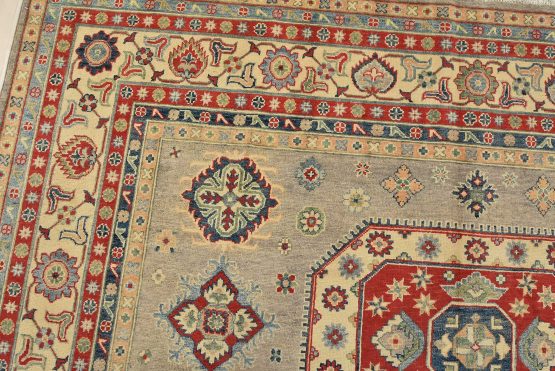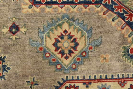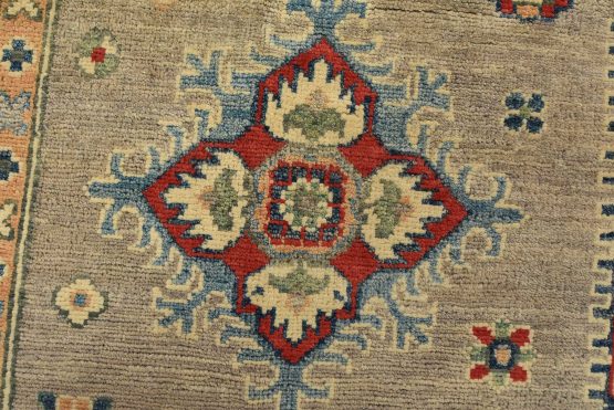 A traditional tribal Caucasian Kazak rug hand-knotted with an all-wool pile on a cotton foundation. This oriental rug features geometric medallions surrounded by geometric motifs set against a gray background. It is new and in excellent condition.