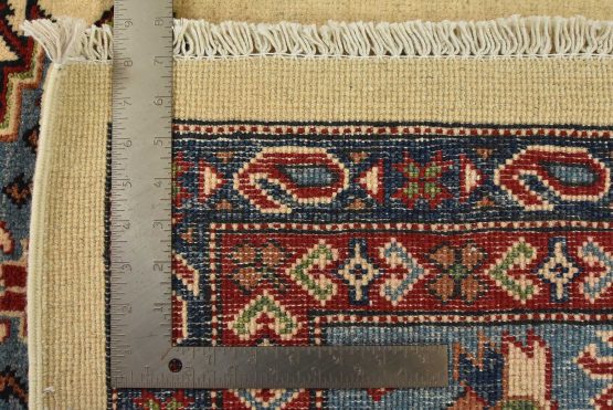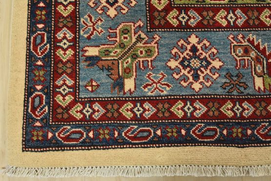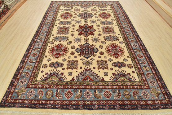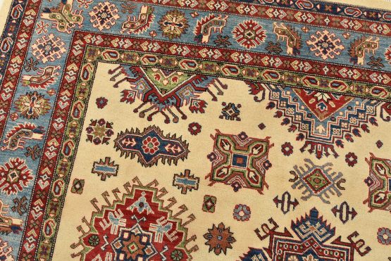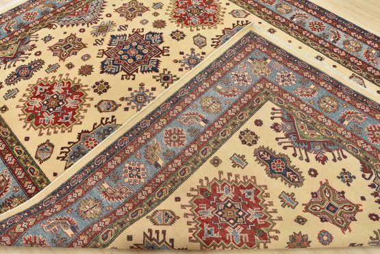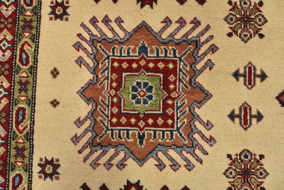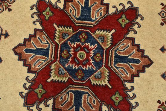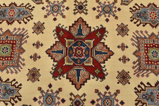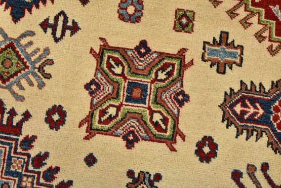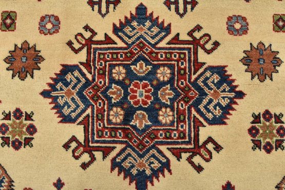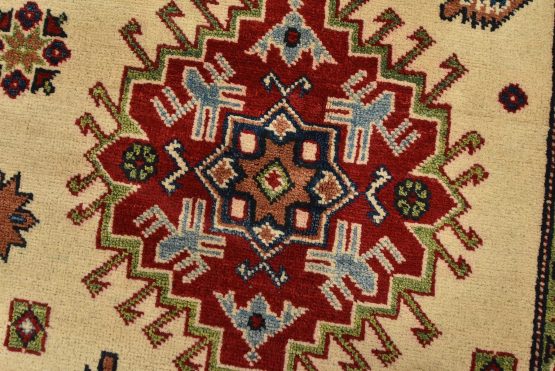 A tribal Caucasian Kazak rug hand-knotted with an all-wool pile on a cotton foundation. This oriental rug features geometric medallions surrounded by geometric motifs set against a beige background. It is new and in excellent condition.