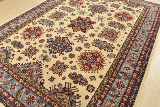 Original antique Kazak rugs from the Caucasus region inspire the creation of Kazak rugs. These rugs are woven with fine wool using traditional Kazak patterns and finished with a low-cut pile to give them an authentic vintage look.