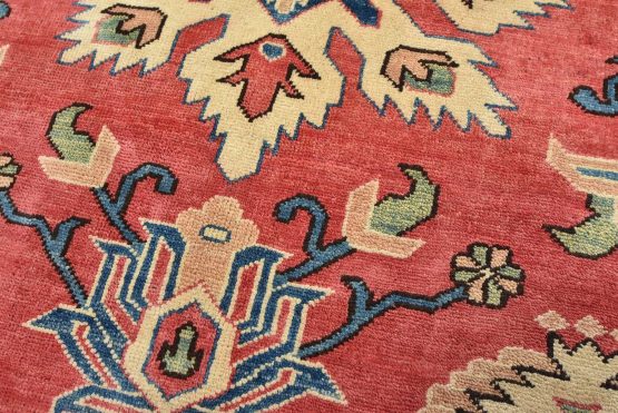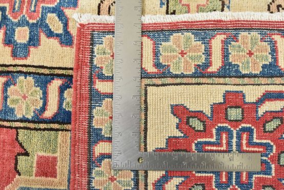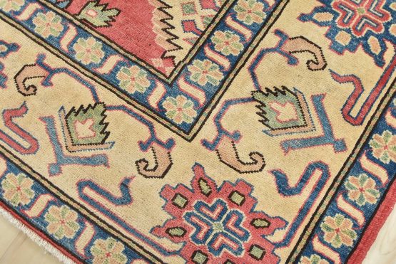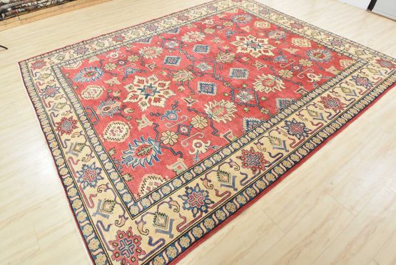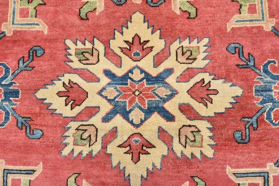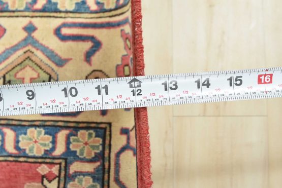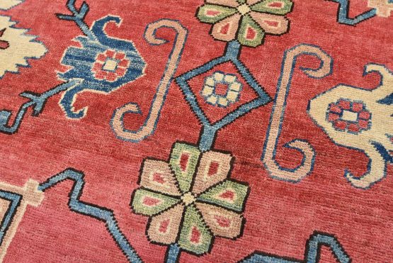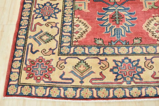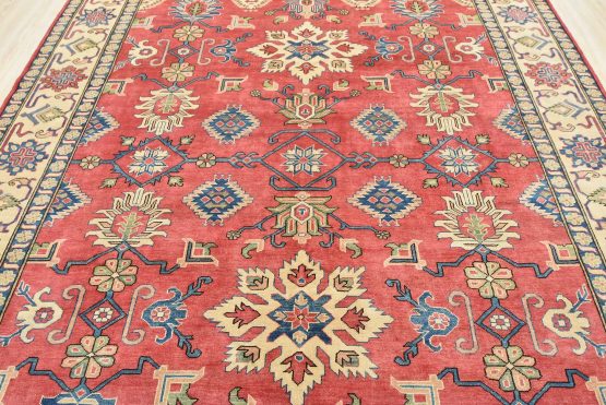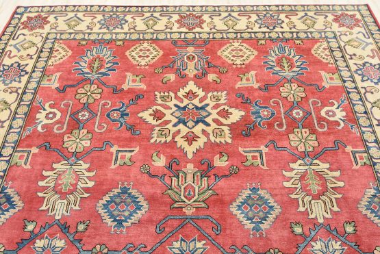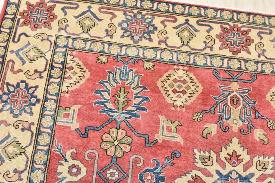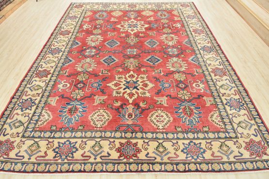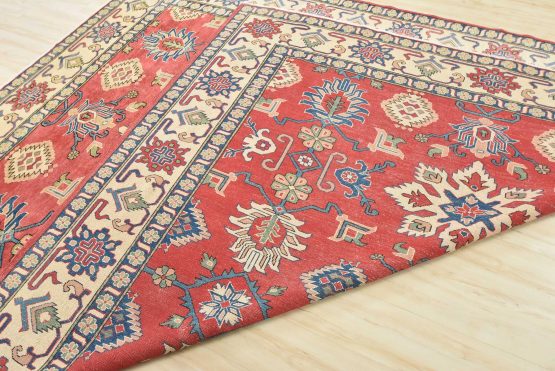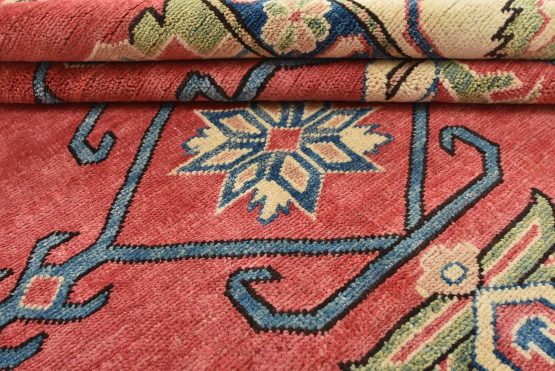 A traditional tribal Caucasian Kazak rug hand-knotted with an all-wool pile on a cotton foundation. This oriental rug features geometric medallions surrounded by botanical motifs in a geometric style, set against a red background. It is new and in excellent condition.