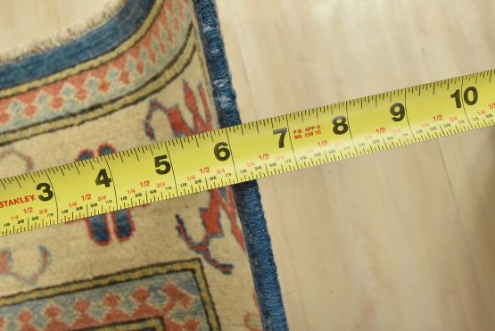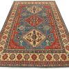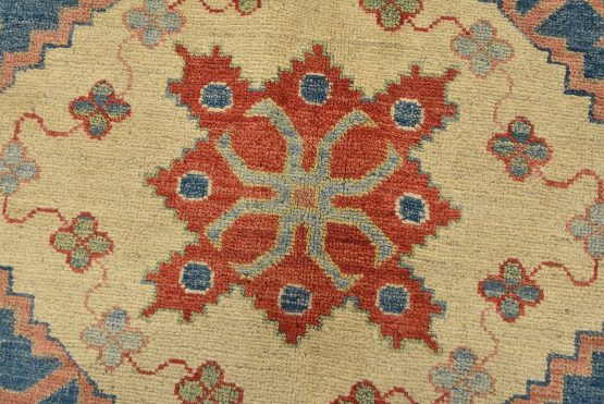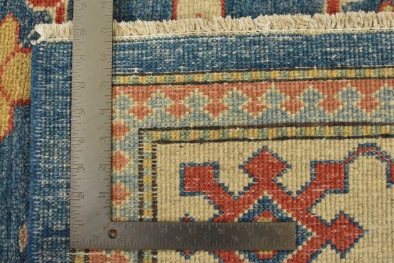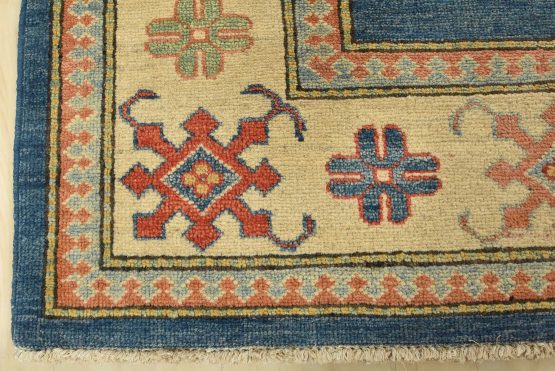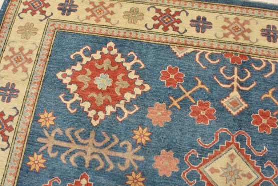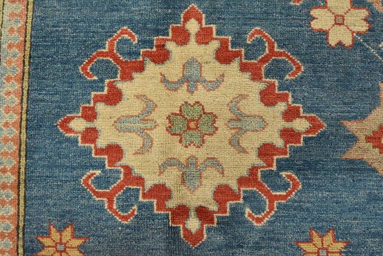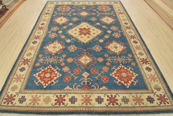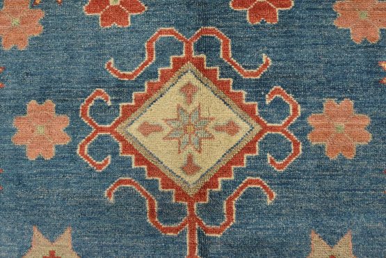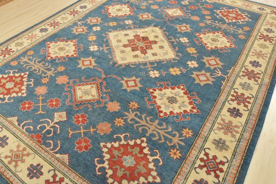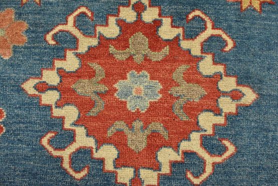 A traditional tribal Caucasian Kazak rug hand-knotted with an all-wool pile on a cotton foundation. This oriental rug features a central medallion surrounded by smaller geometric medallions with floral motifs set against a blue background. It is new and in excellent condition.