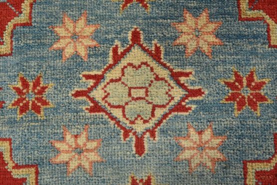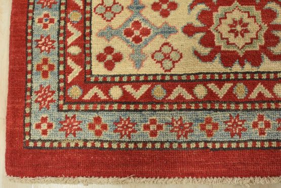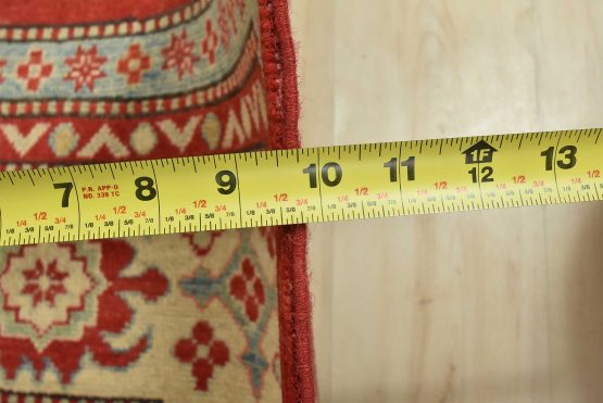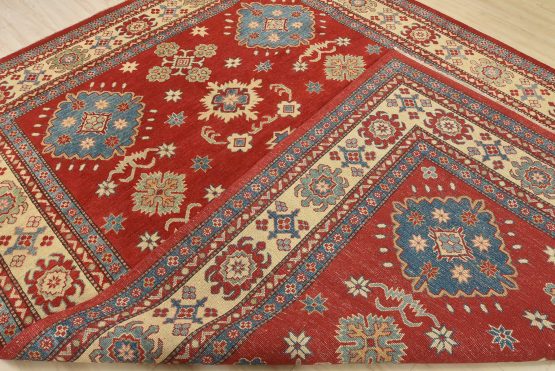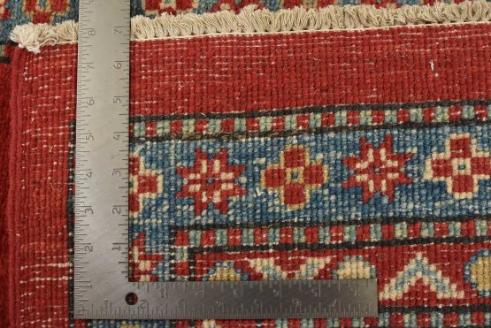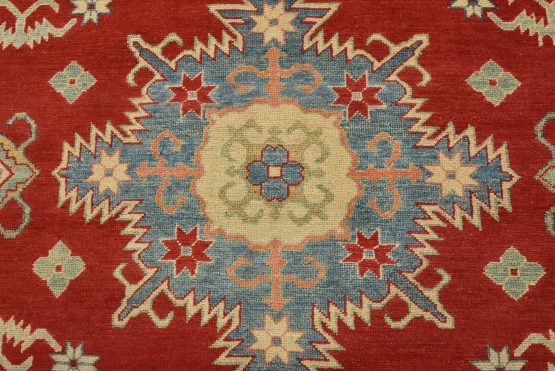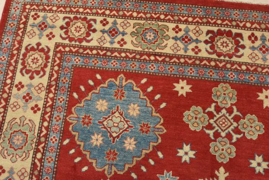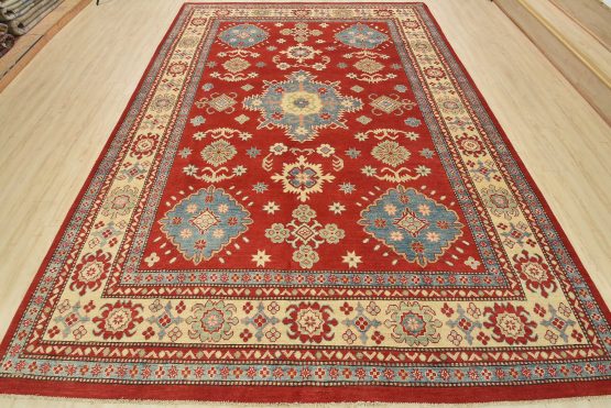 A traditional tribal Caucasian Kazak rug hand-knotted with an all-wool pile on a cotton foundation. This oriental rug features geometric medallions surrounded by geometric motifs set against a red background. It is new and in excellent condition.
