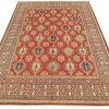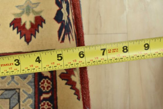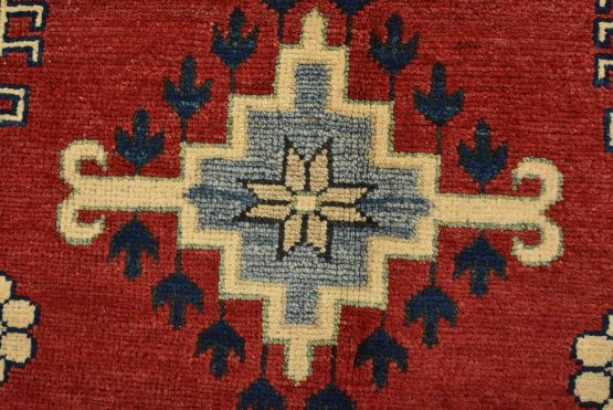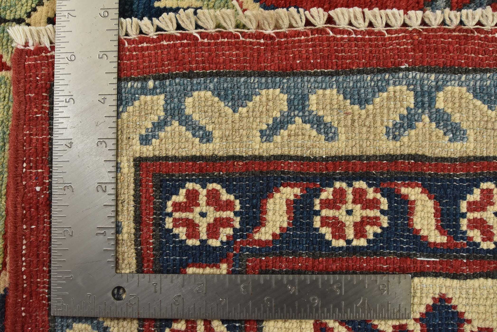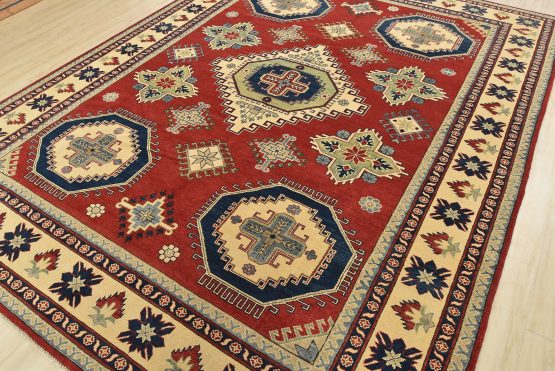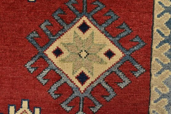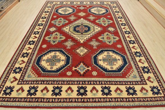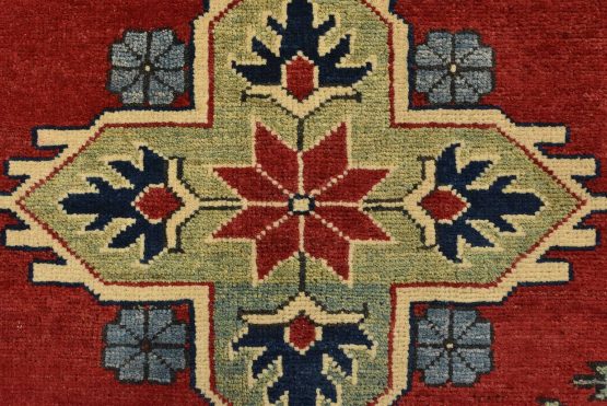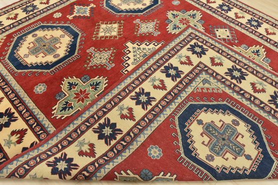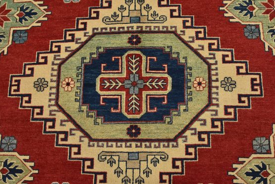 A tribal geometric Caucasian Kazak rug hand-knotted with an all-wool pile on a cotton foundation. This oriental rug features geometric medallions surrounded by geometric motifs set against a red background. It is new and in excellent condition.