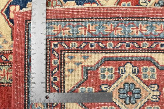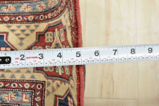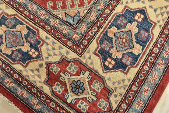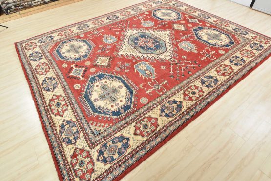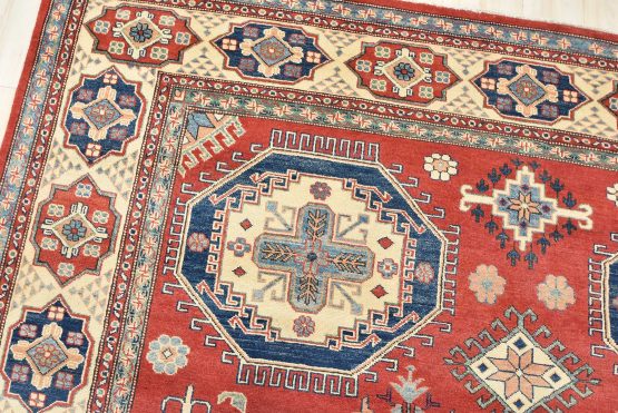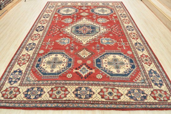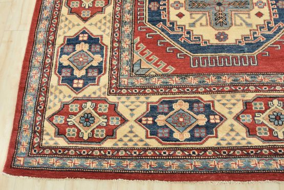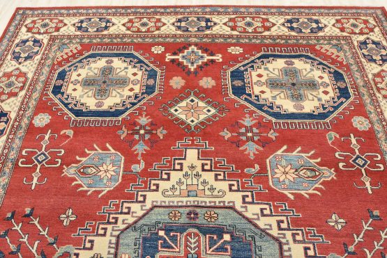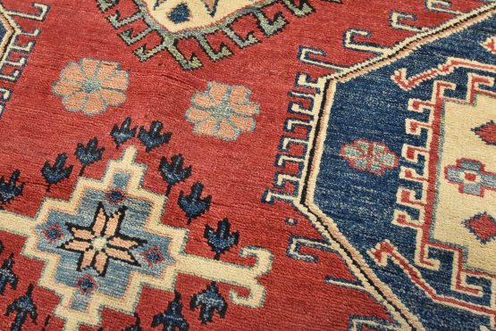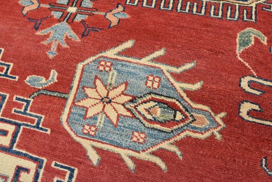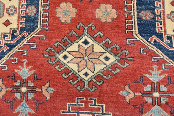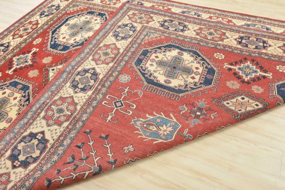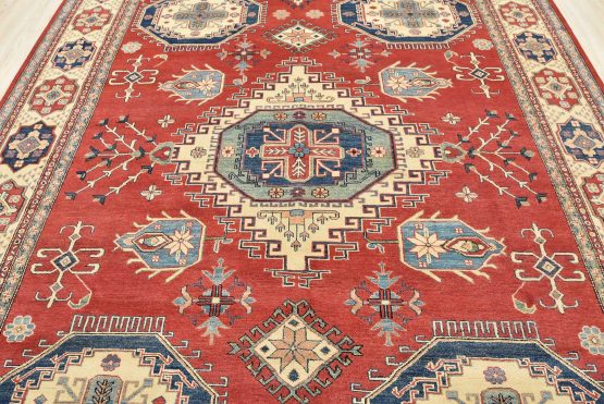 A tribal Caucasian Kazak rug hand-knotted with an all-wool pile on a cotton foundation. This oriental rug features geometric medallions surrounded by geometric motifs set against a red background. It is new and in excellent condition.