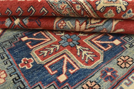 Original antique Kazak rugs from the Caucasus region inspire the creation of new Kazak rugs. These rugs are woven with fine wool using traditional Kazak patterns and finished with a low-cut pile, giving them an authentic vintage look.