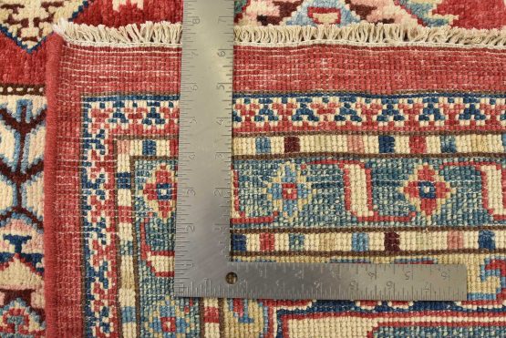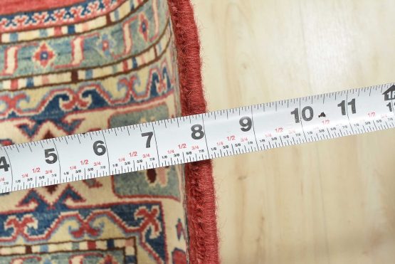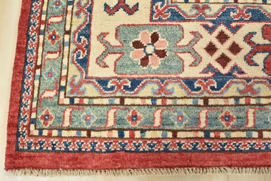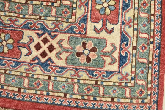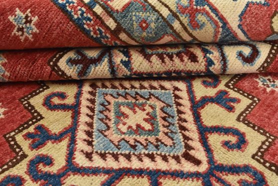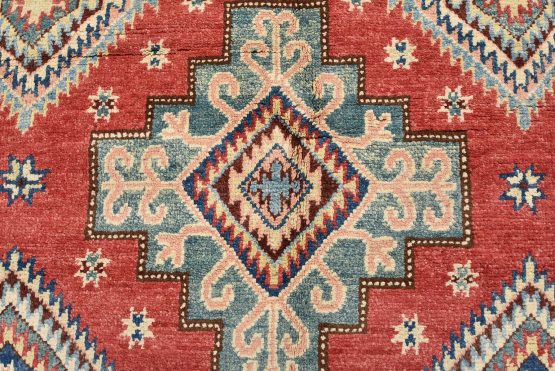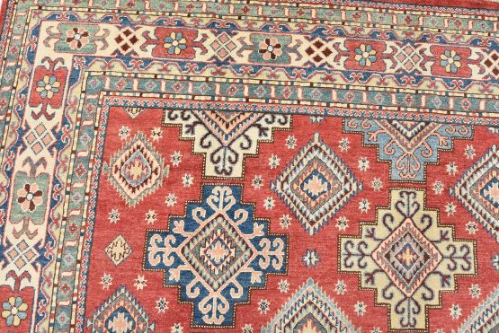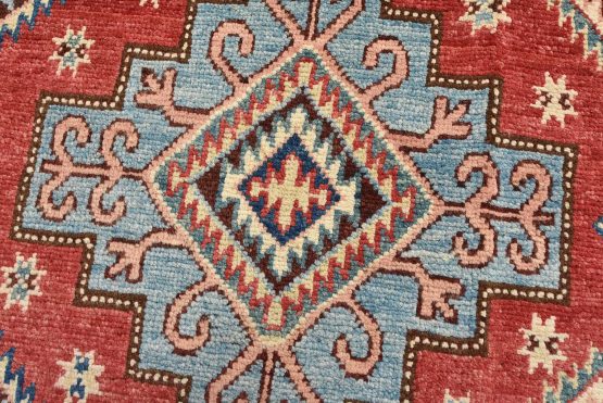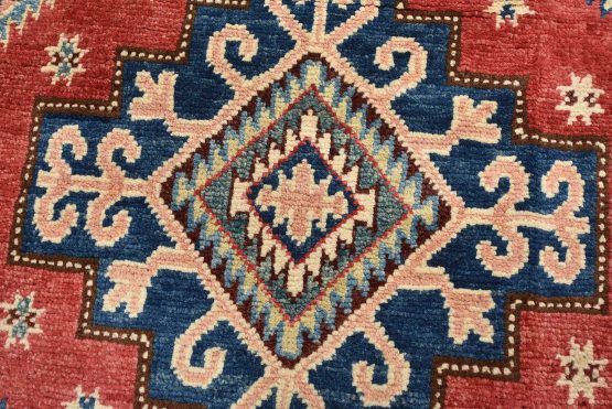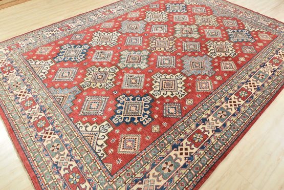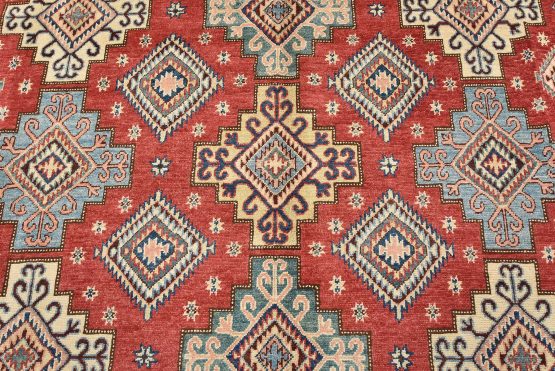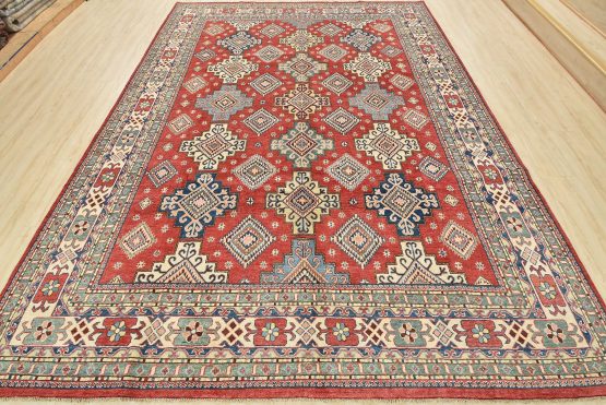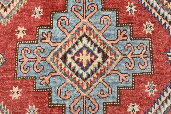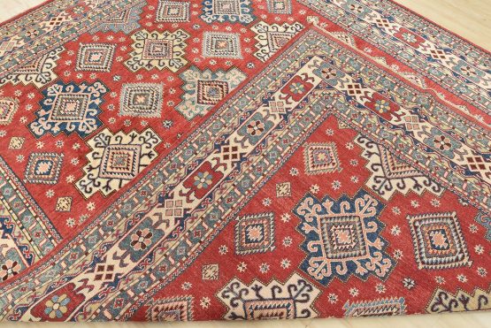 A tribal Caucasian Kazak rug hand-knotted with an all-wool pile on a cotton foundation. This oriental rug features an all-over pattern of geometric medallions set against a red background. It is new and in excellent condition.