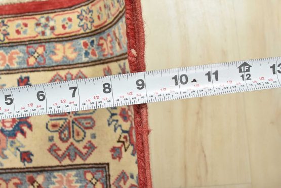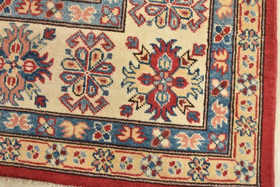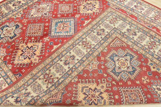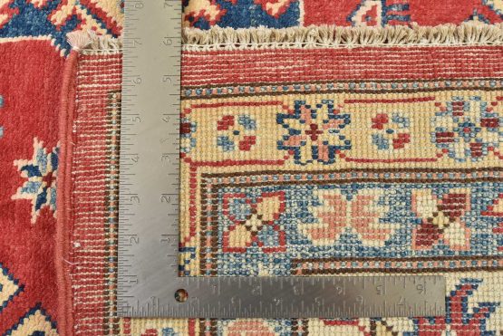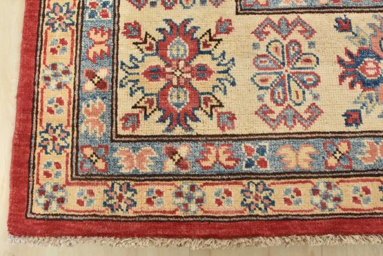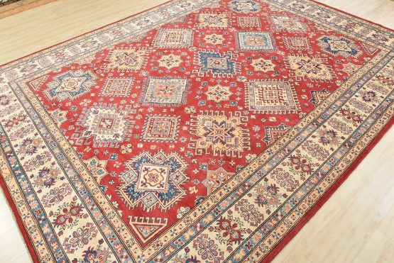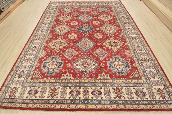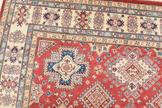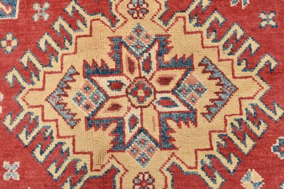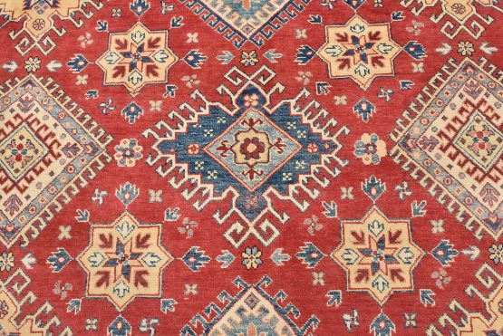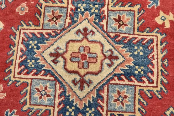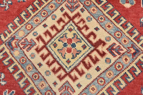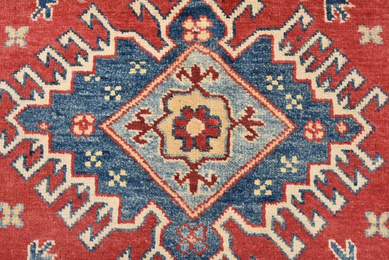 A tribal Caucasian Kazak rug hand-knotted with an all-wool pile on a cotton foundation. This oriental rug features rows of geometric medallions set against a red background. It is new and in excellent condition.
