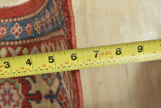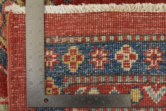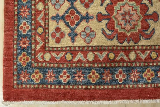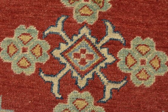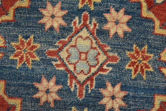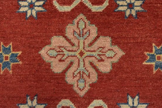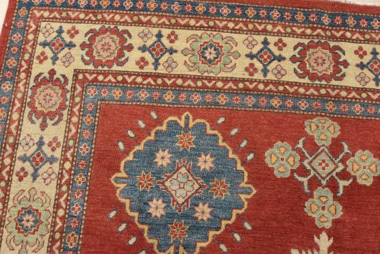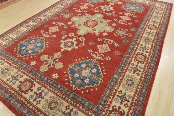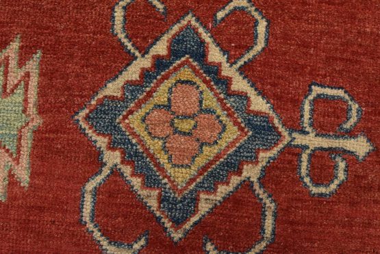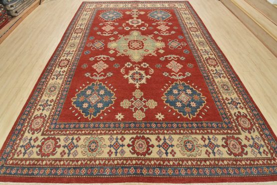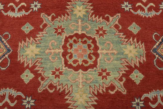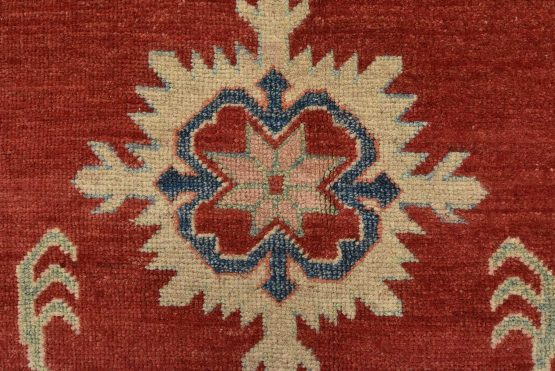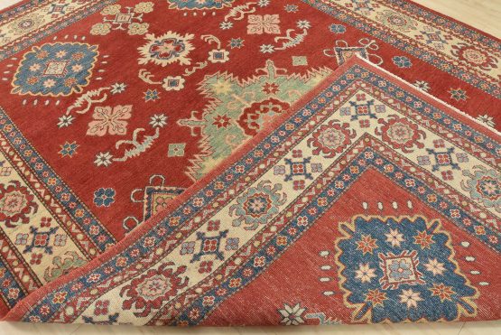 A traditional tribal Caucasian Kazak rug hand-knotted with an all-wool pile on a cotton foundation. This oriental rug features a central geometric medallion surrounded by smaller medallions and geometric botanical motifs set against a red background. It is new and in excellent condition.