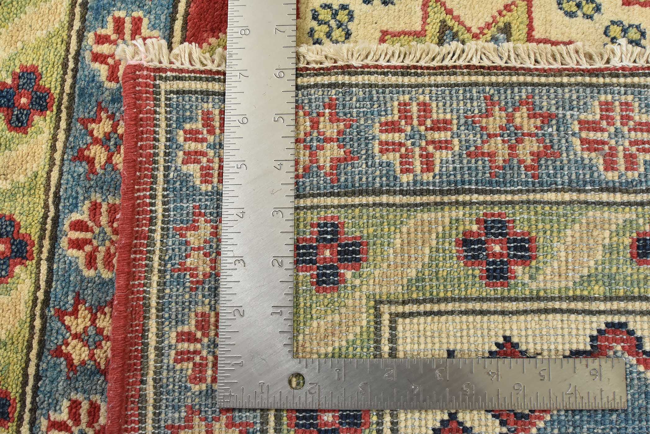 A tribal Caucasian Kazak rug hand-knotted with an all-wool pile on a cotton foundation. This oriental rug features a central geometric medallion surrounded by geometric motifs set against a red background. It is new and in excellent condition.