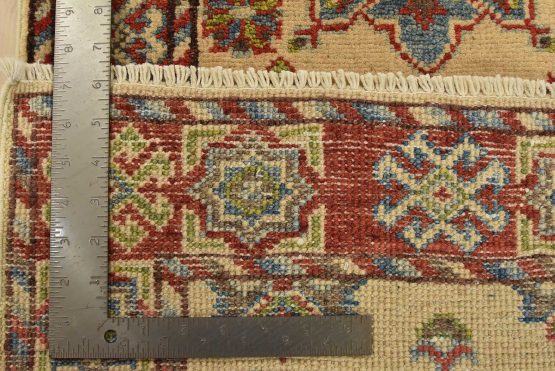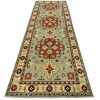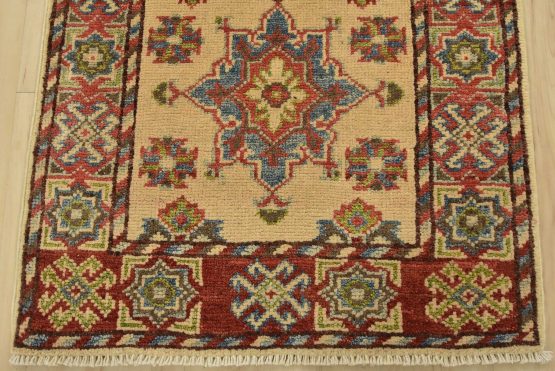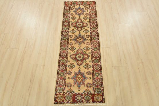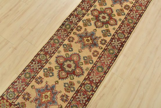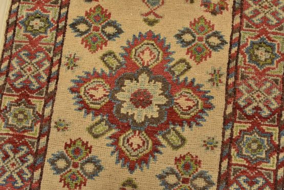 A tribal Caucasian Kazak runner hand-knotted with an all-wool pile on a cotton foundation. This oriental rug features a row of geometric medallions surrounded by small geometric motifs set against a beige background. It is new and in excellent condition.