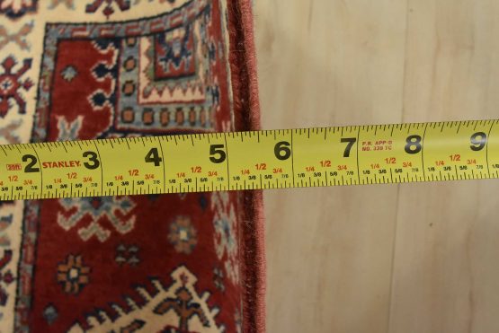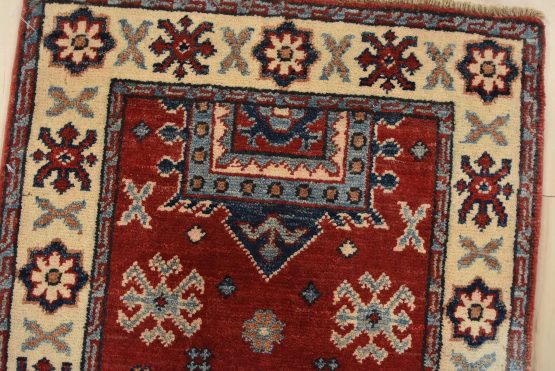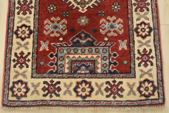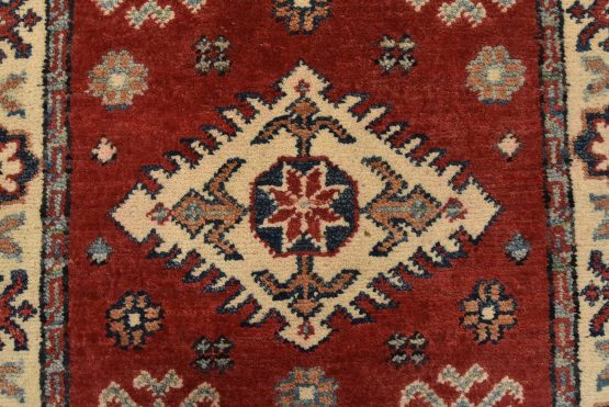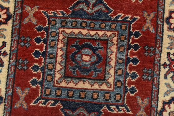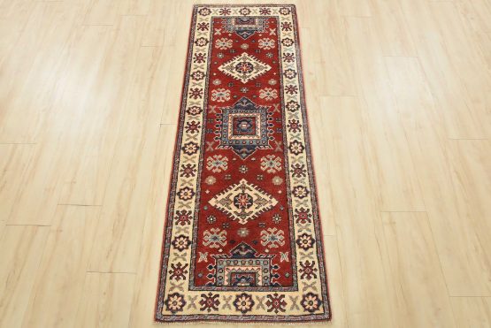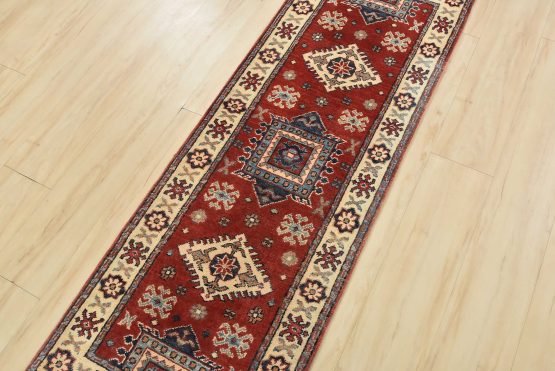 A tribal Caucasian Kazak runner hand-knotted with an all-wool pile on a cotton foundation. This oriental rug features a row of geometric medallions surrounded by small geometric motifs set against a red background. It is new and in excellent condition.