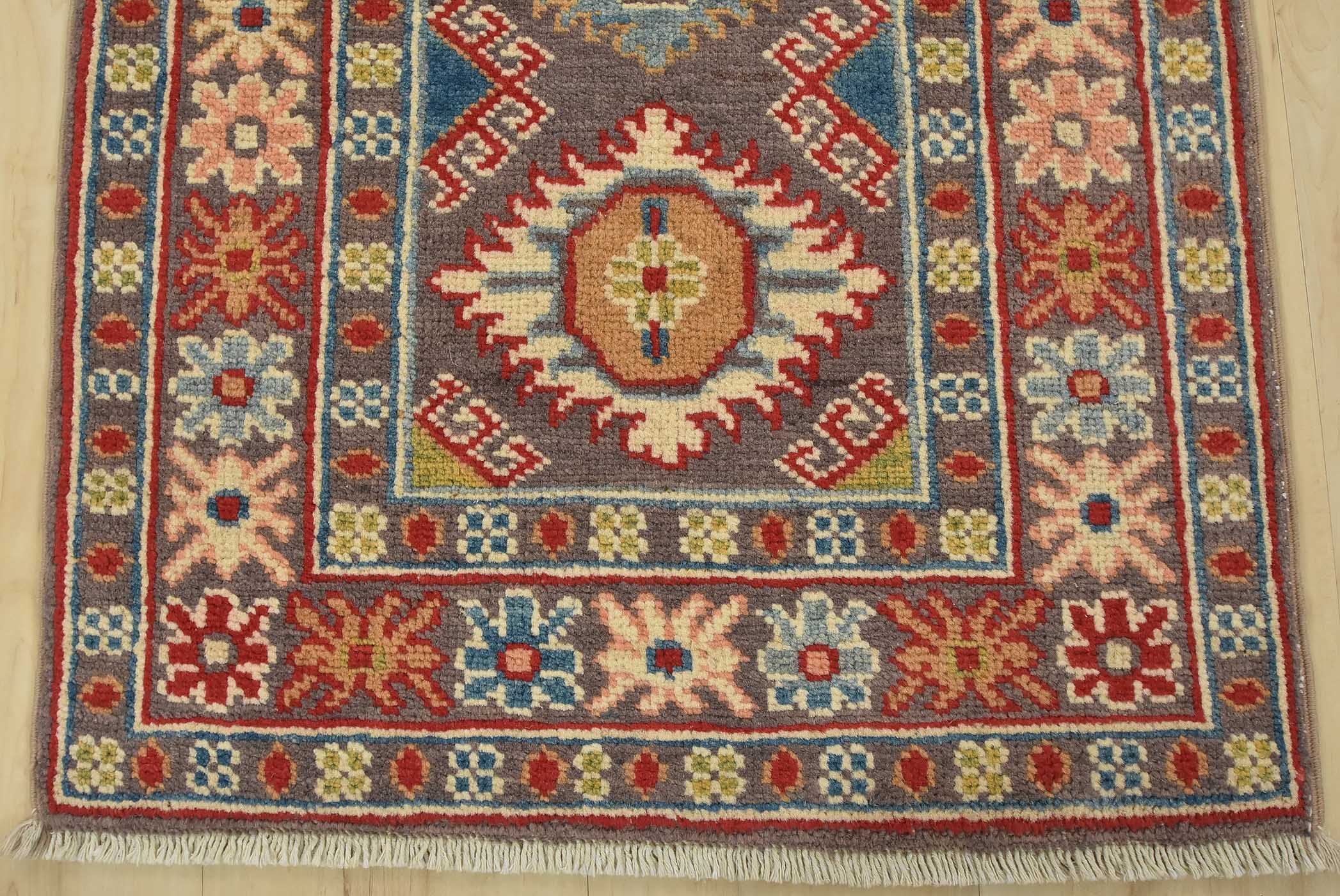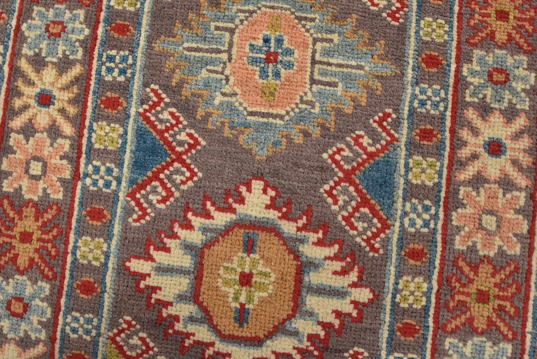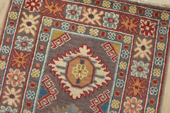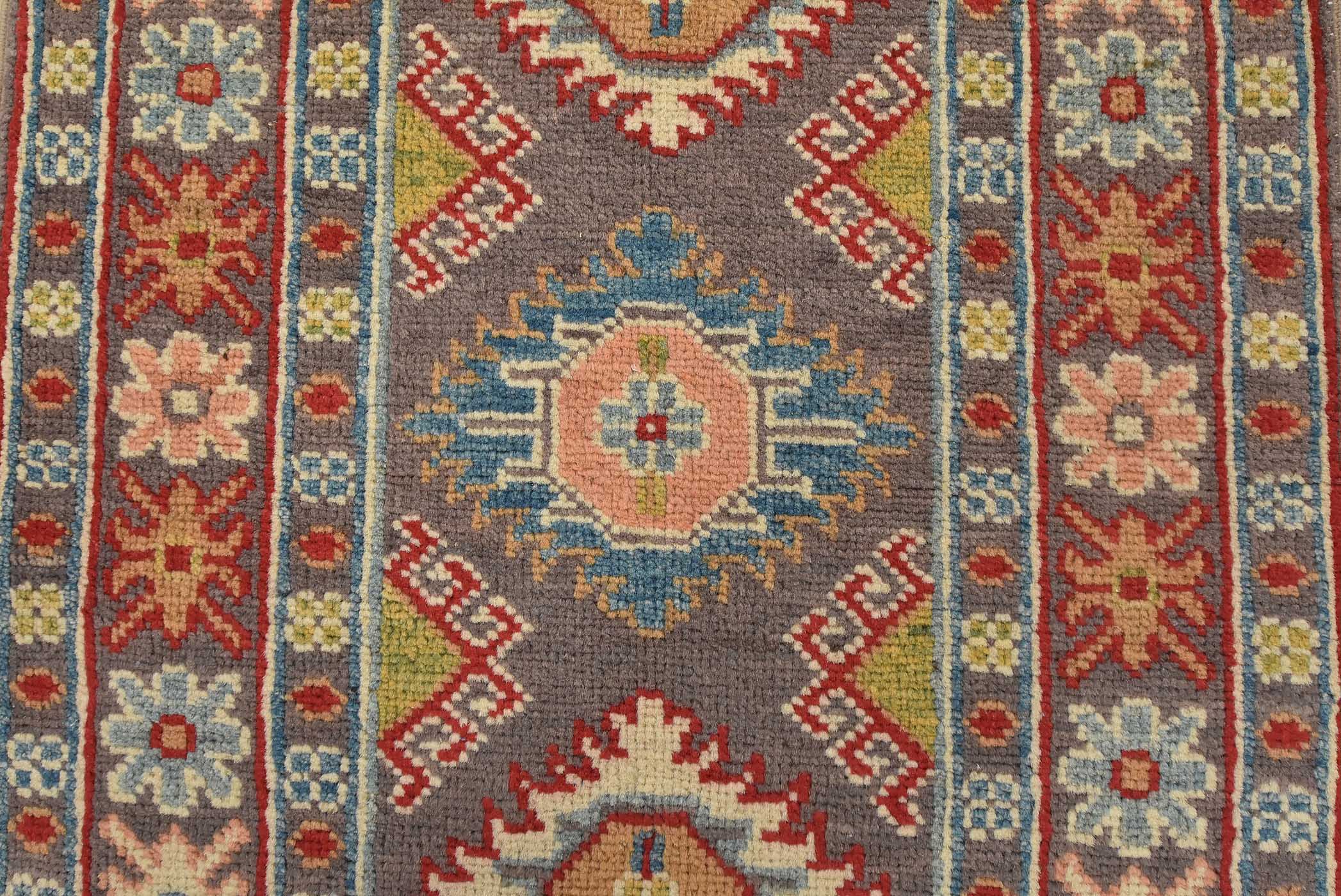 A tribal Caucasian Kazak runner hand-knotted with fine wool on a cotton foundation. This rug features a row of small geometric medallions set against a purple background. It is new and in excellent condition.