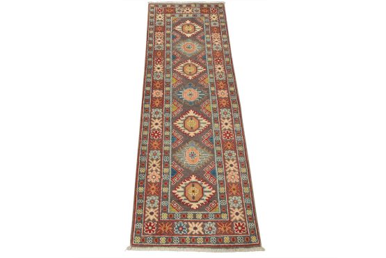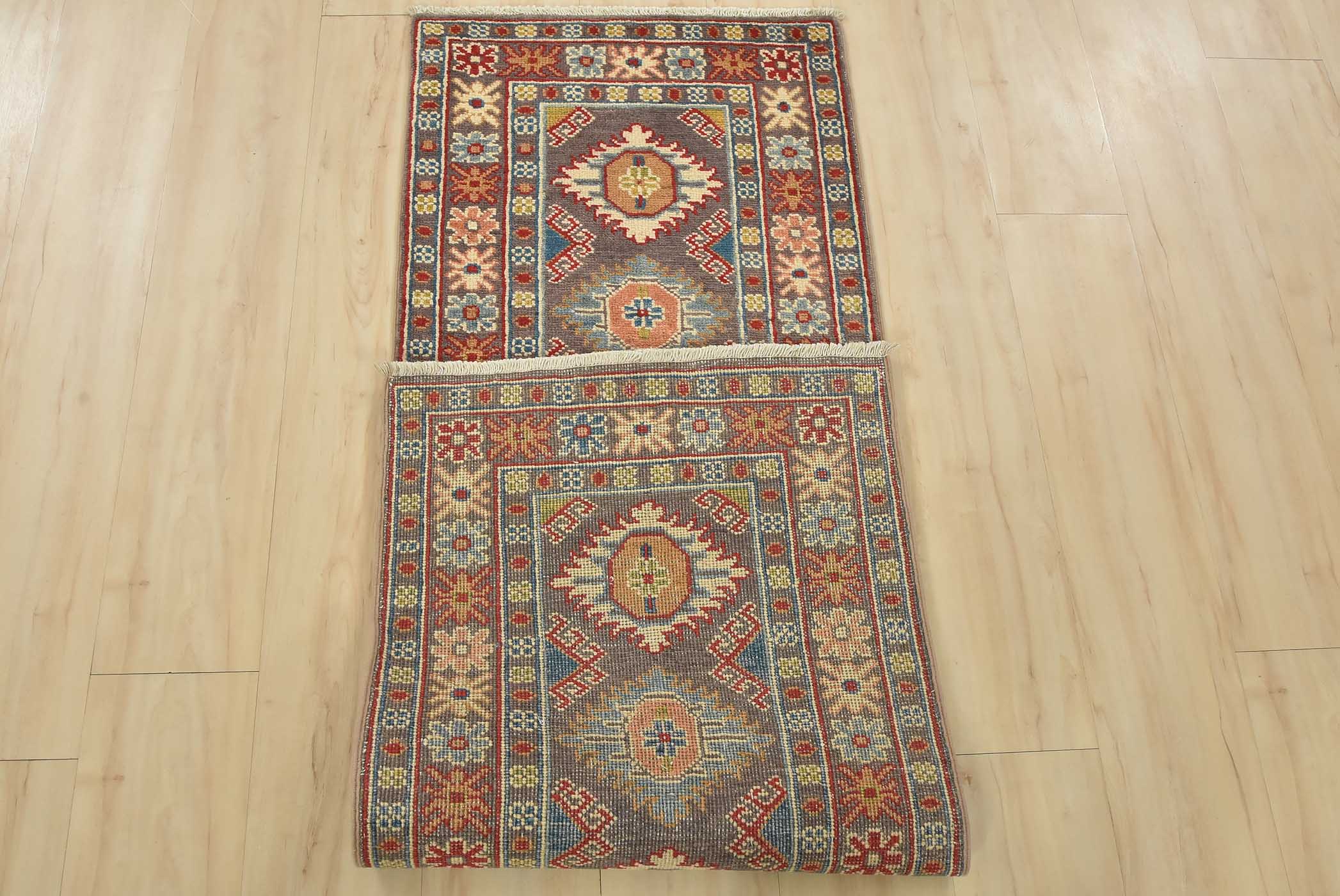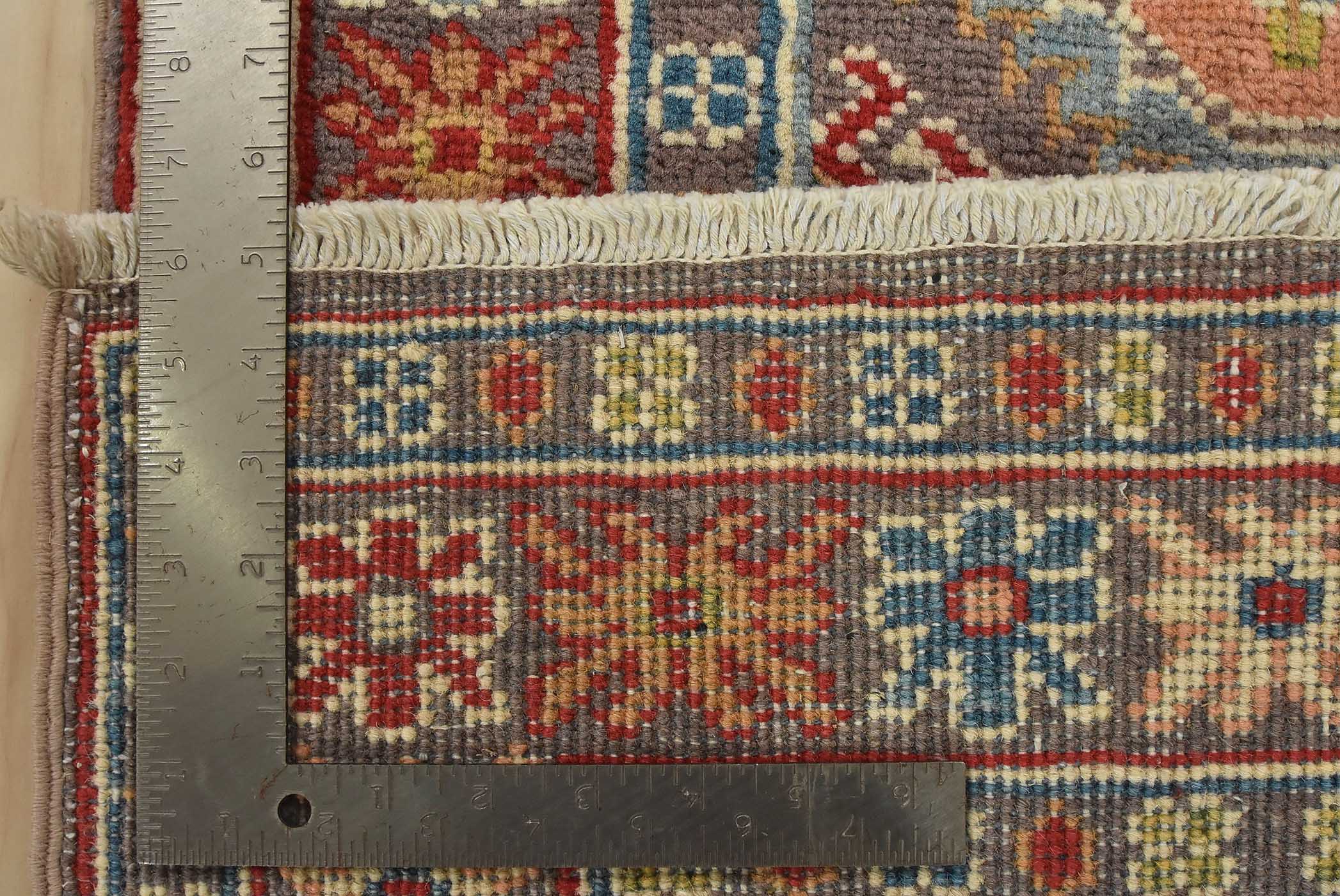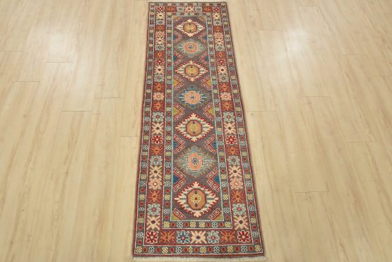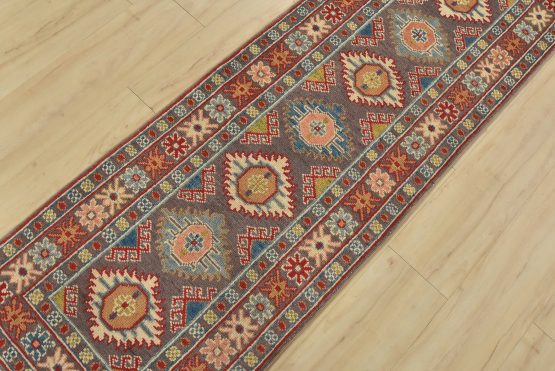 A tribal Caucasian Kazak runner hand-knotted with fine wool on a cotton foundation. This rug features a row of small geometric medallions set against a purple background. It is new and in excellent condition.