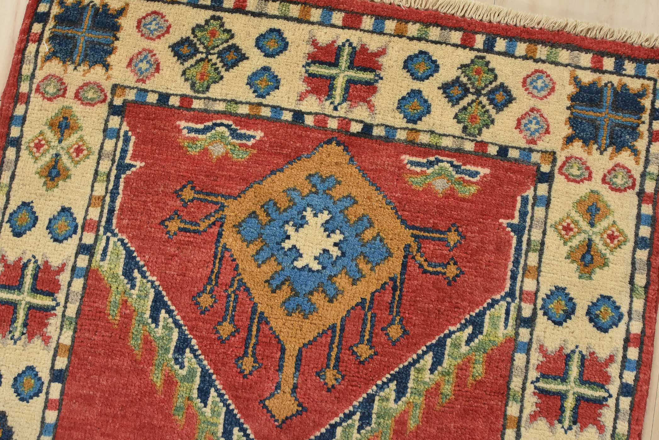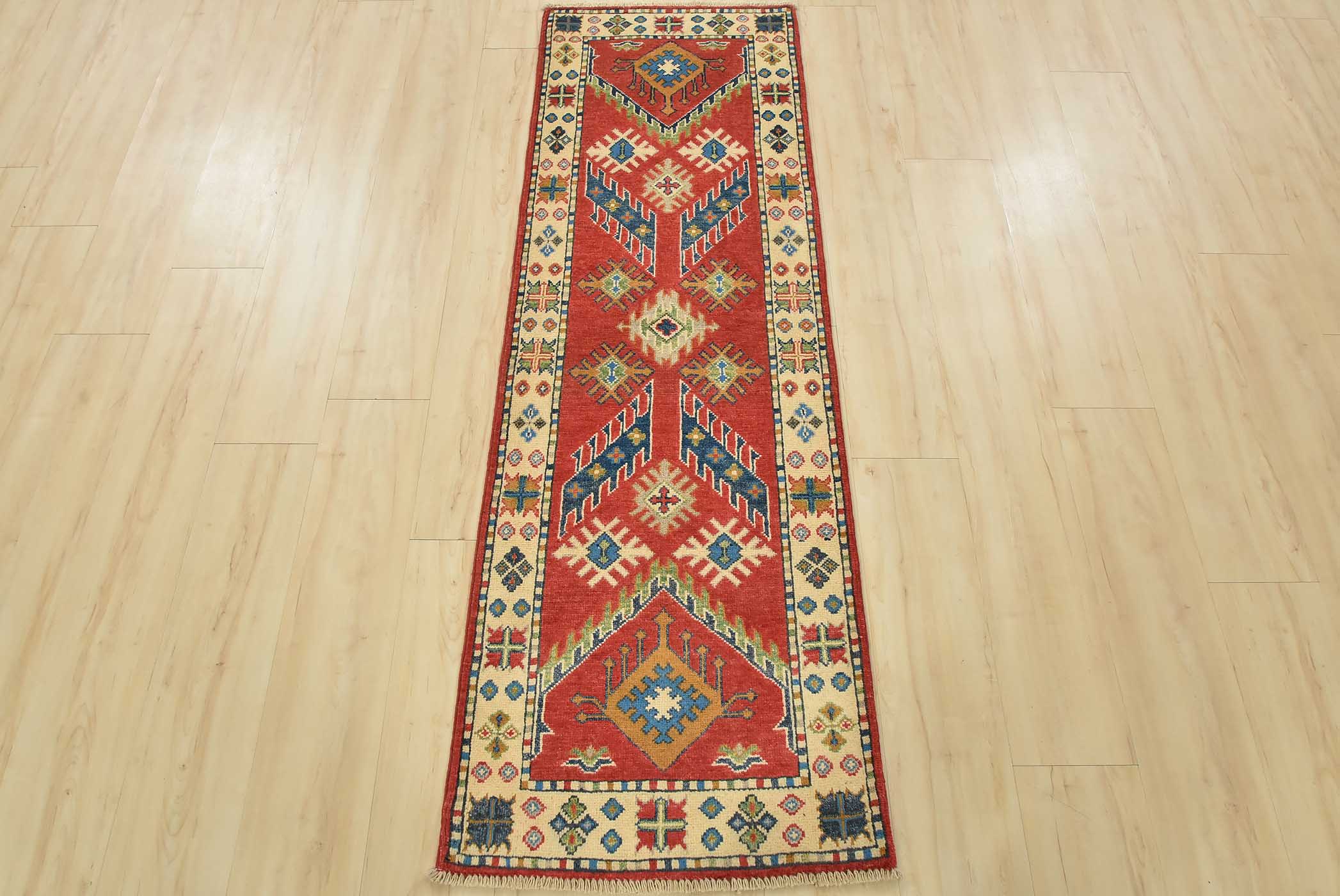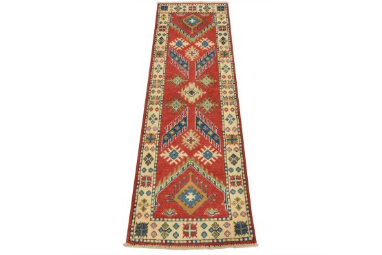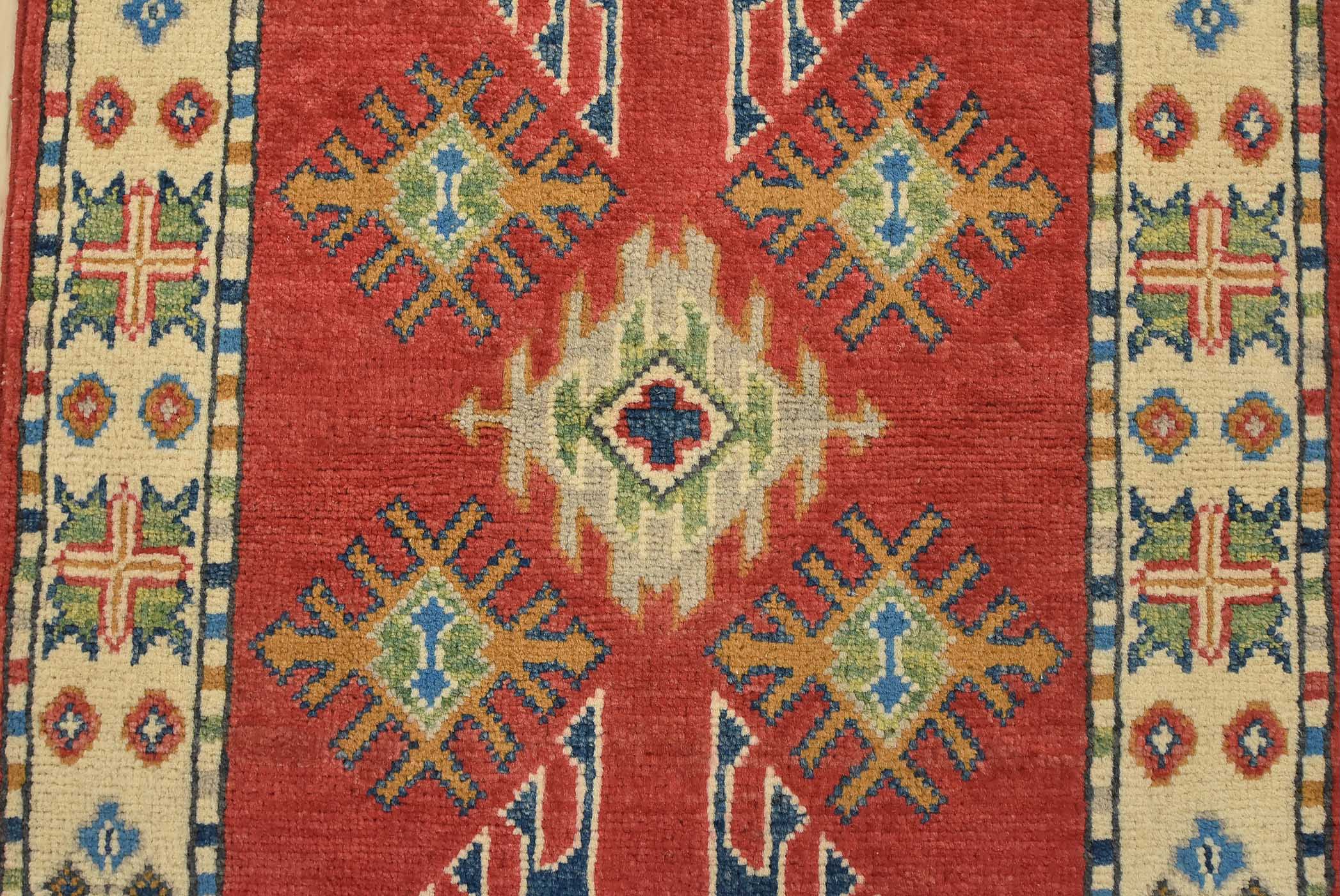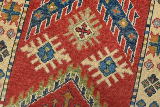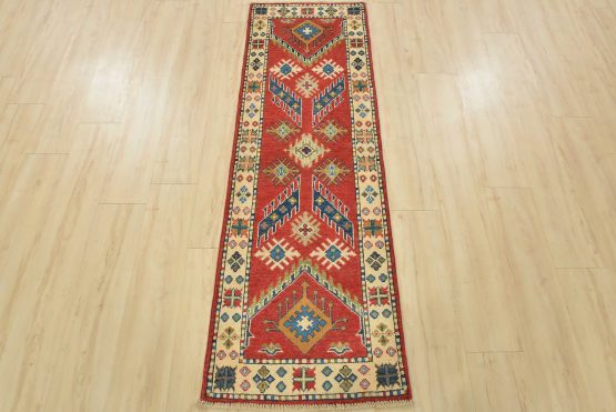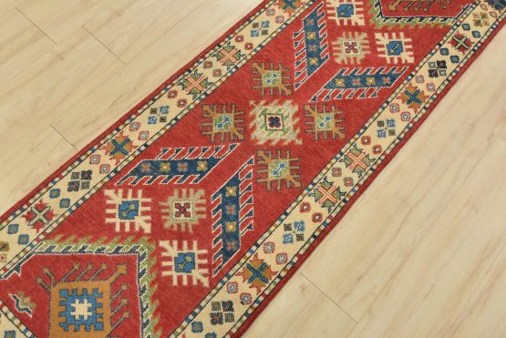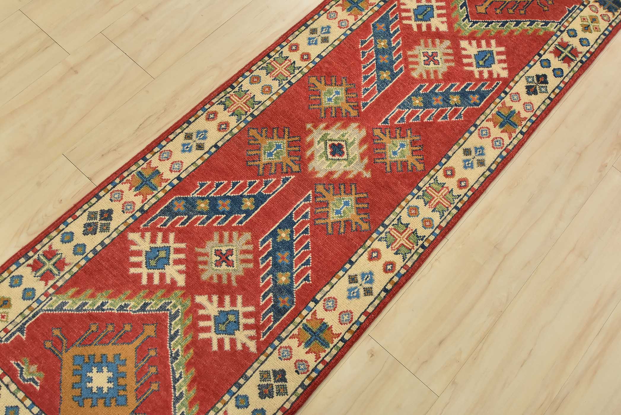 A tribal Caucasian Kazak runner hand-knotted with fine wool on a cotton foundation. This rug features geometric motifs set against a red background. It is new and in excellent condition.