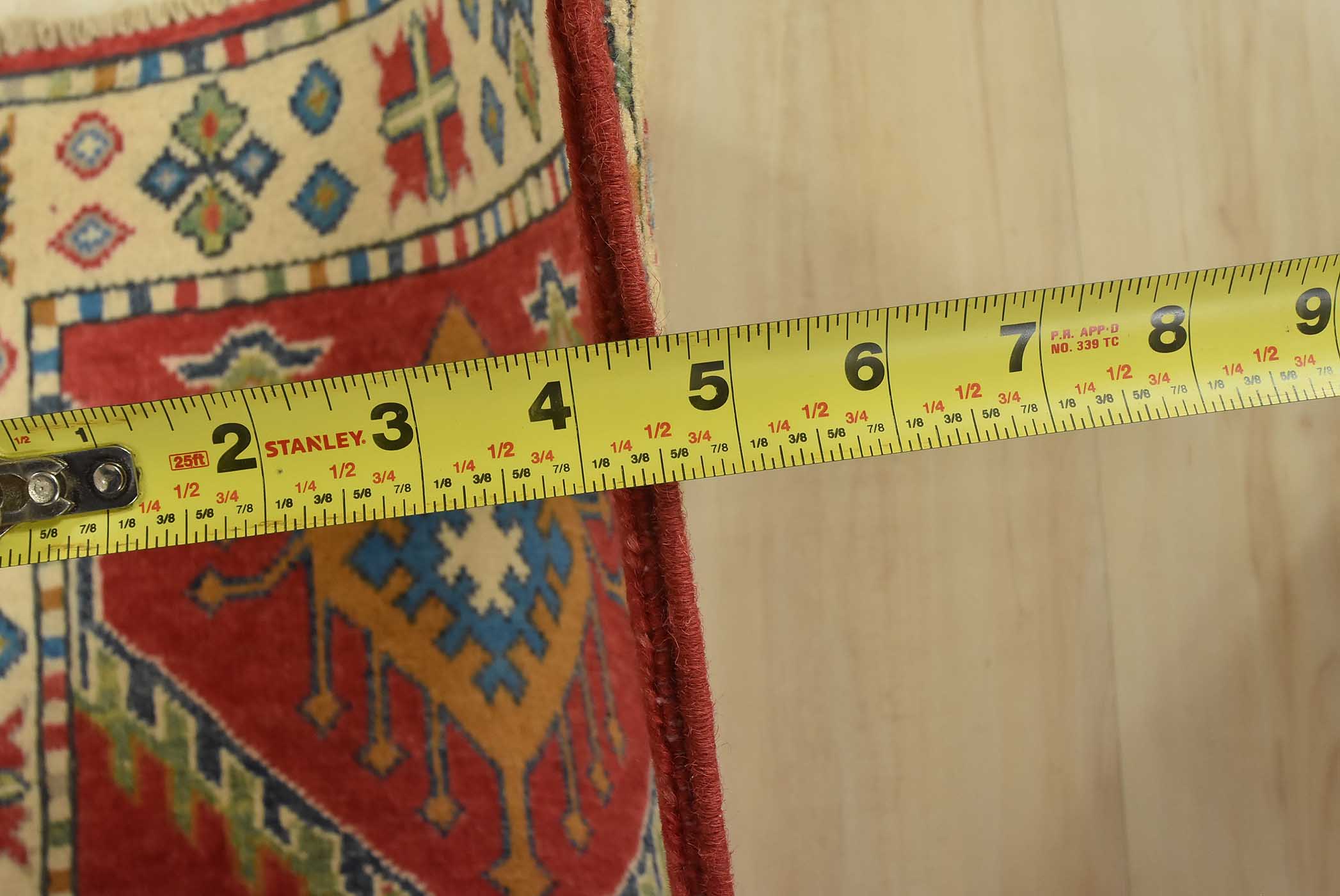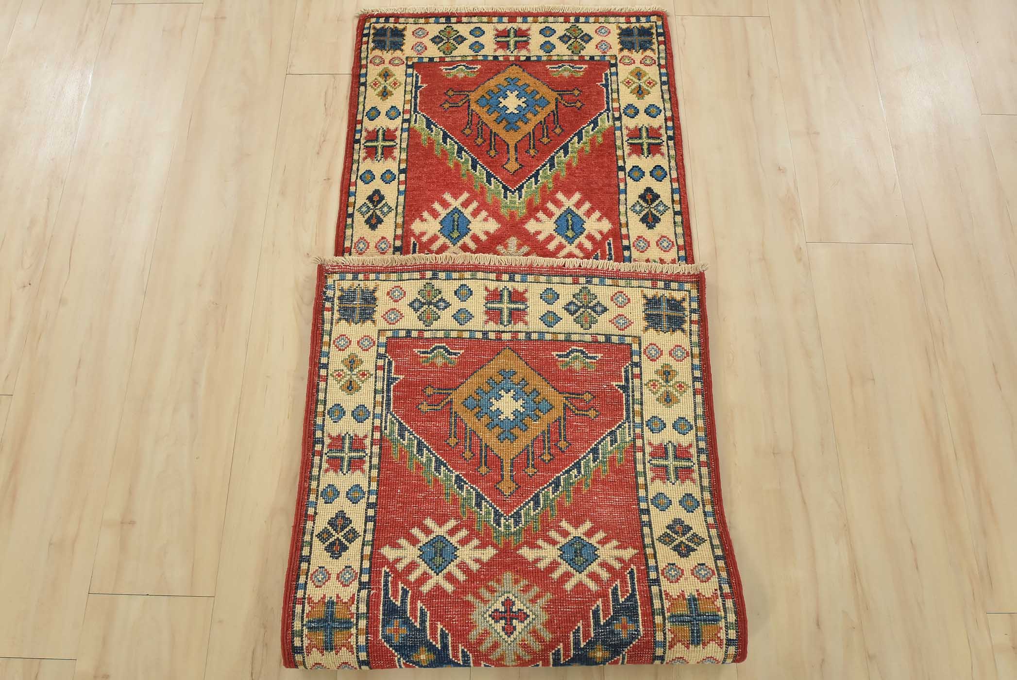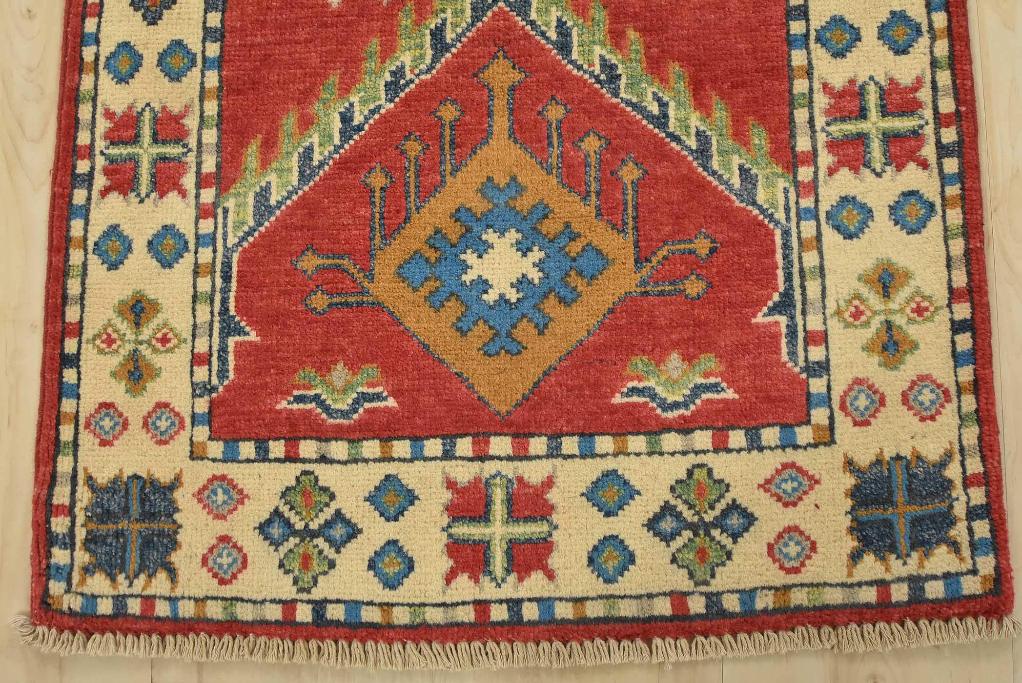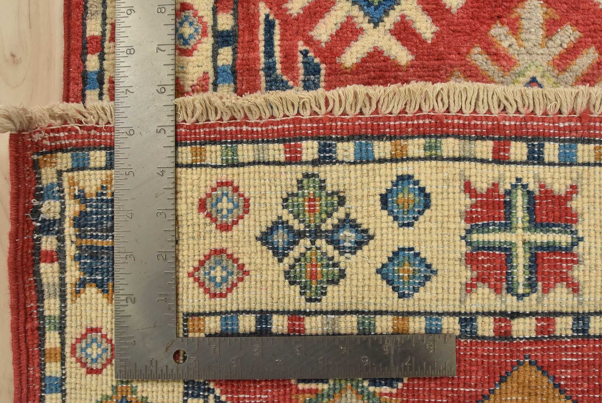 A tribal Caucasian Kazak runner hand-knotted with fine wool on a cotton foundation. This rug features geometric motifs set against a red background. It is new and in excellent condition.