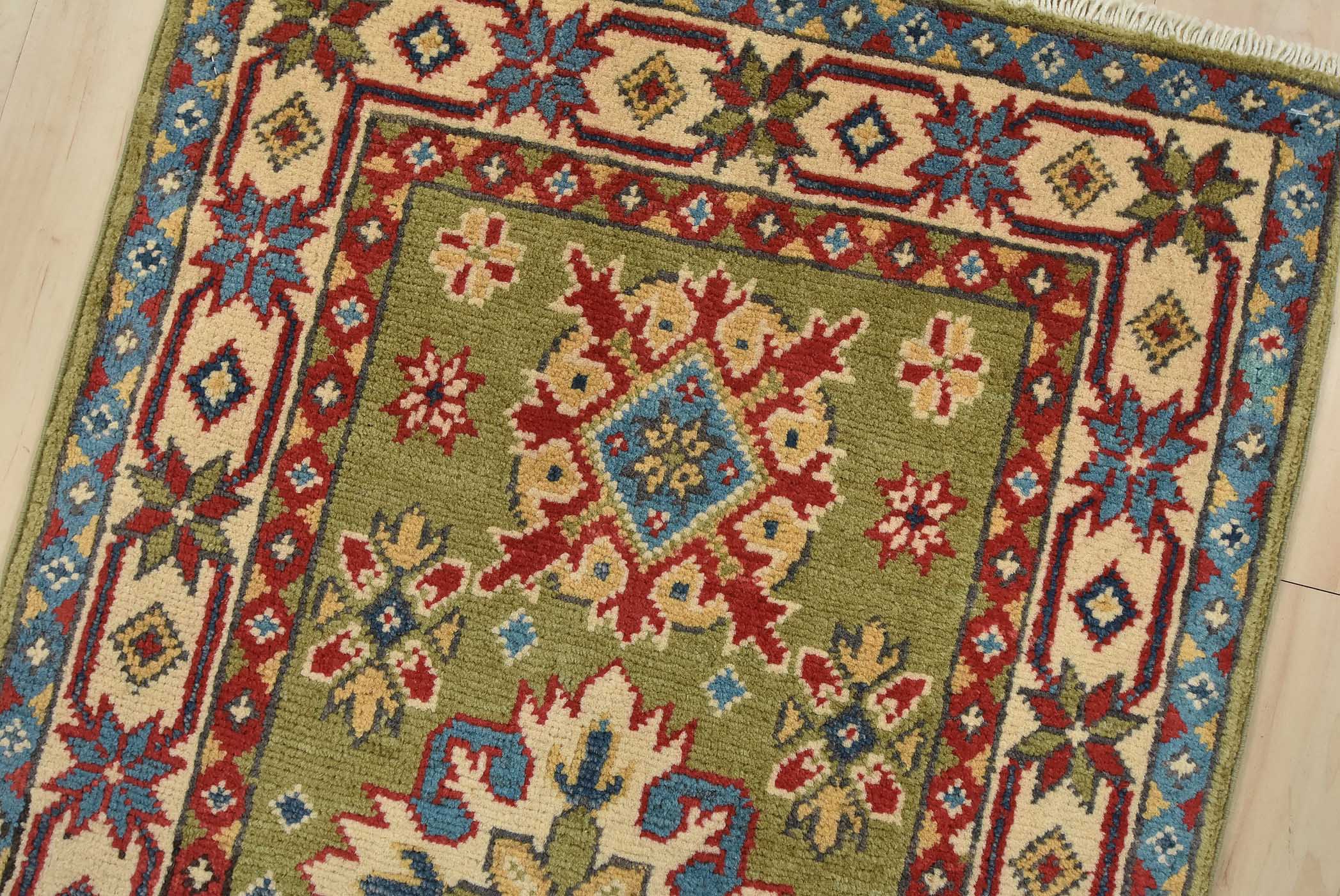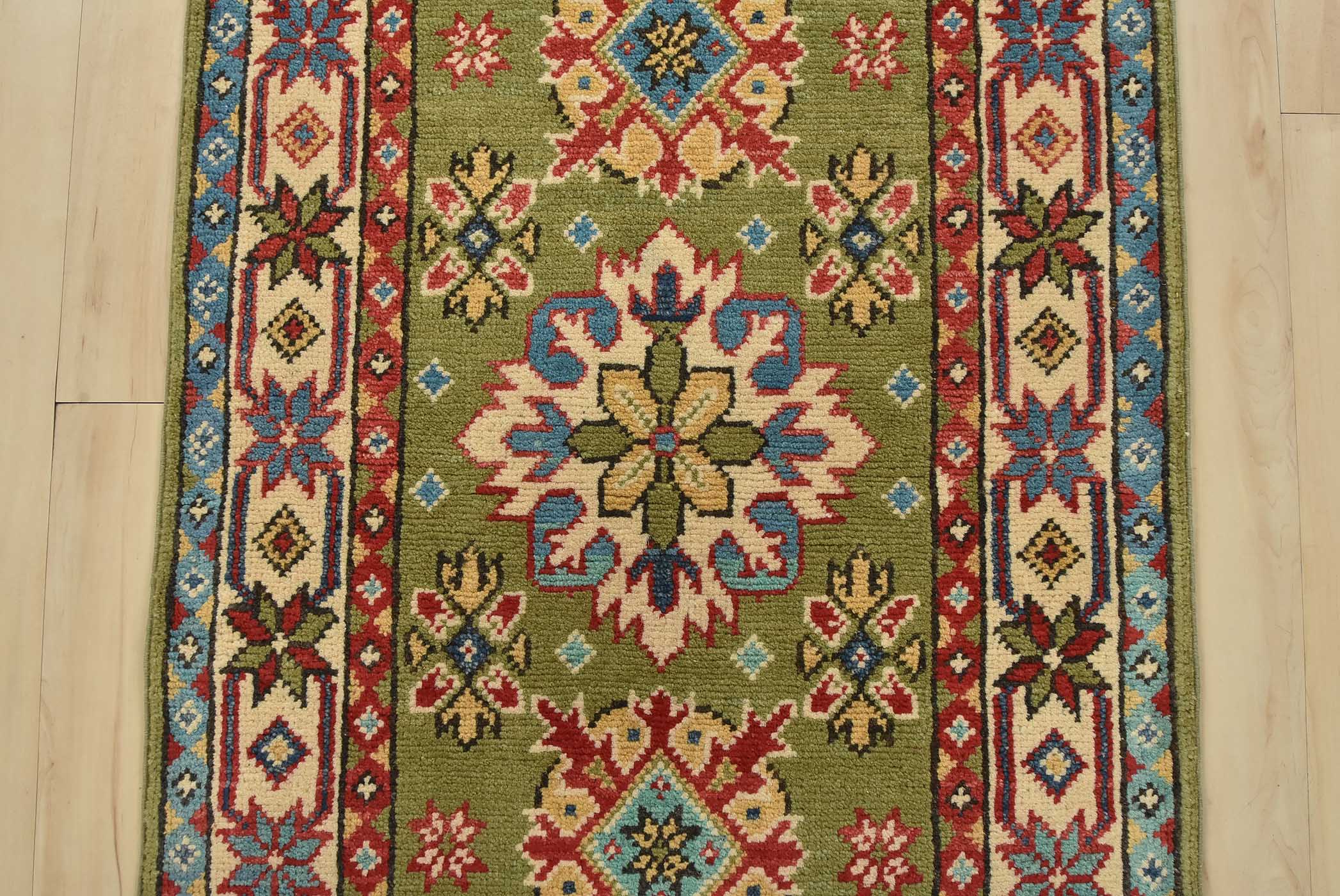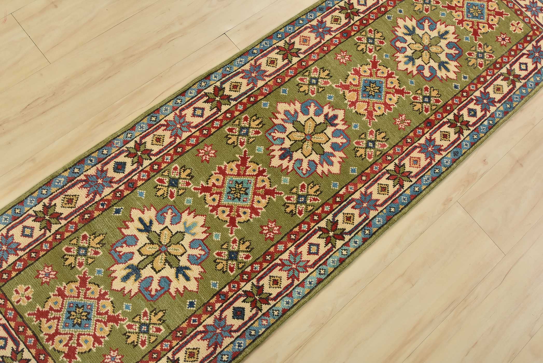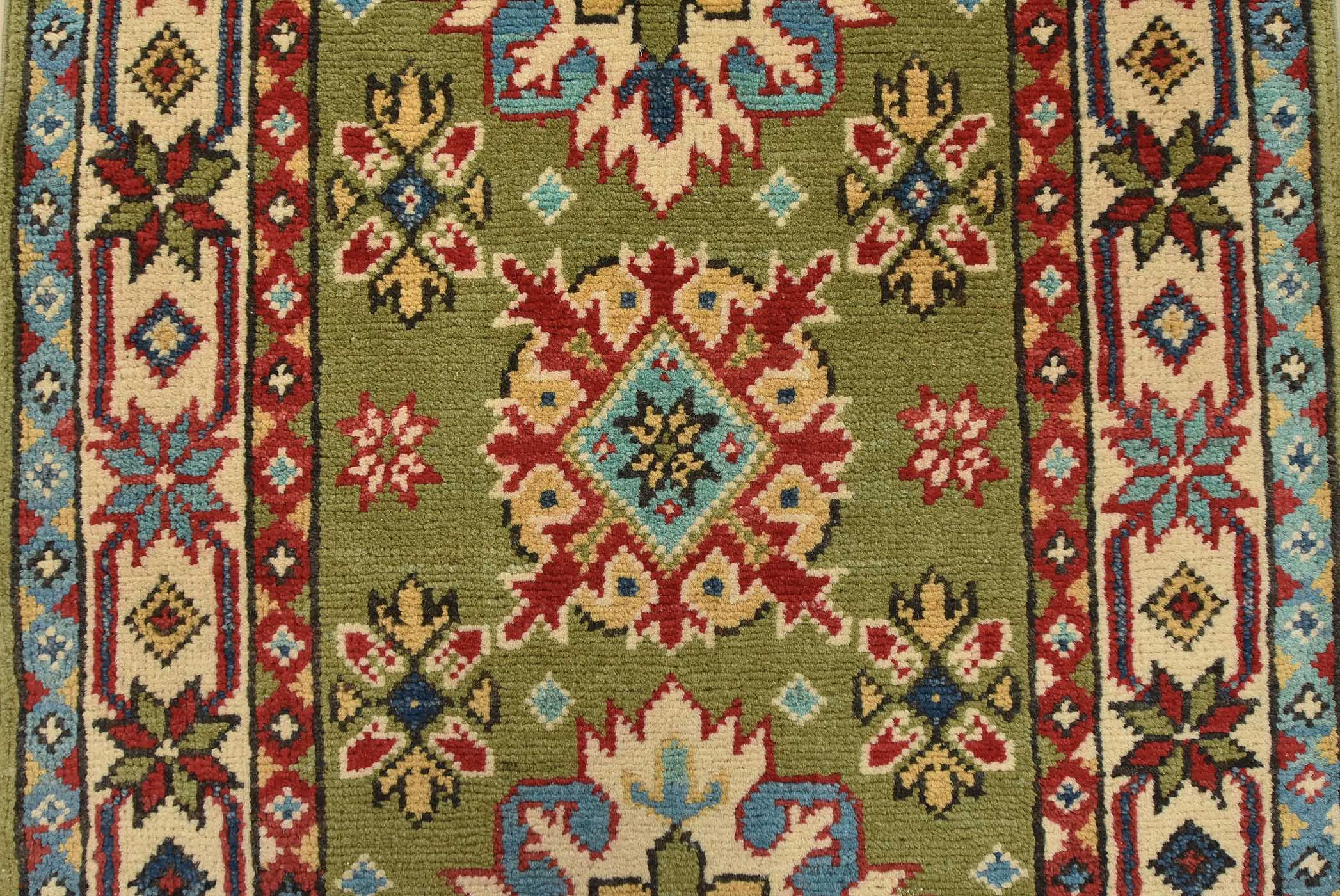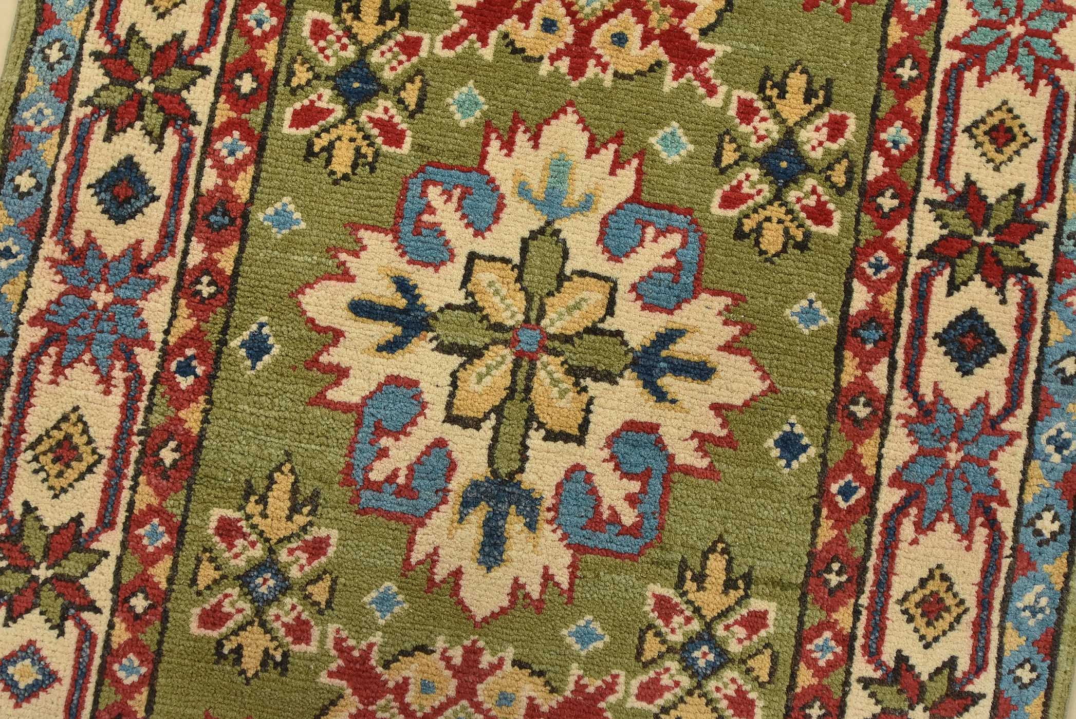 A tribal Caucasian Kazak runner hand-knotted with fine wool on a cotton foundation. This rug features geometric medallions surrounded by small geometric motifs set against a green background. It is new and in excellent condition.