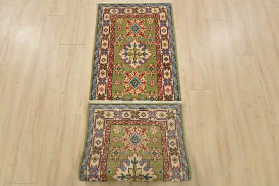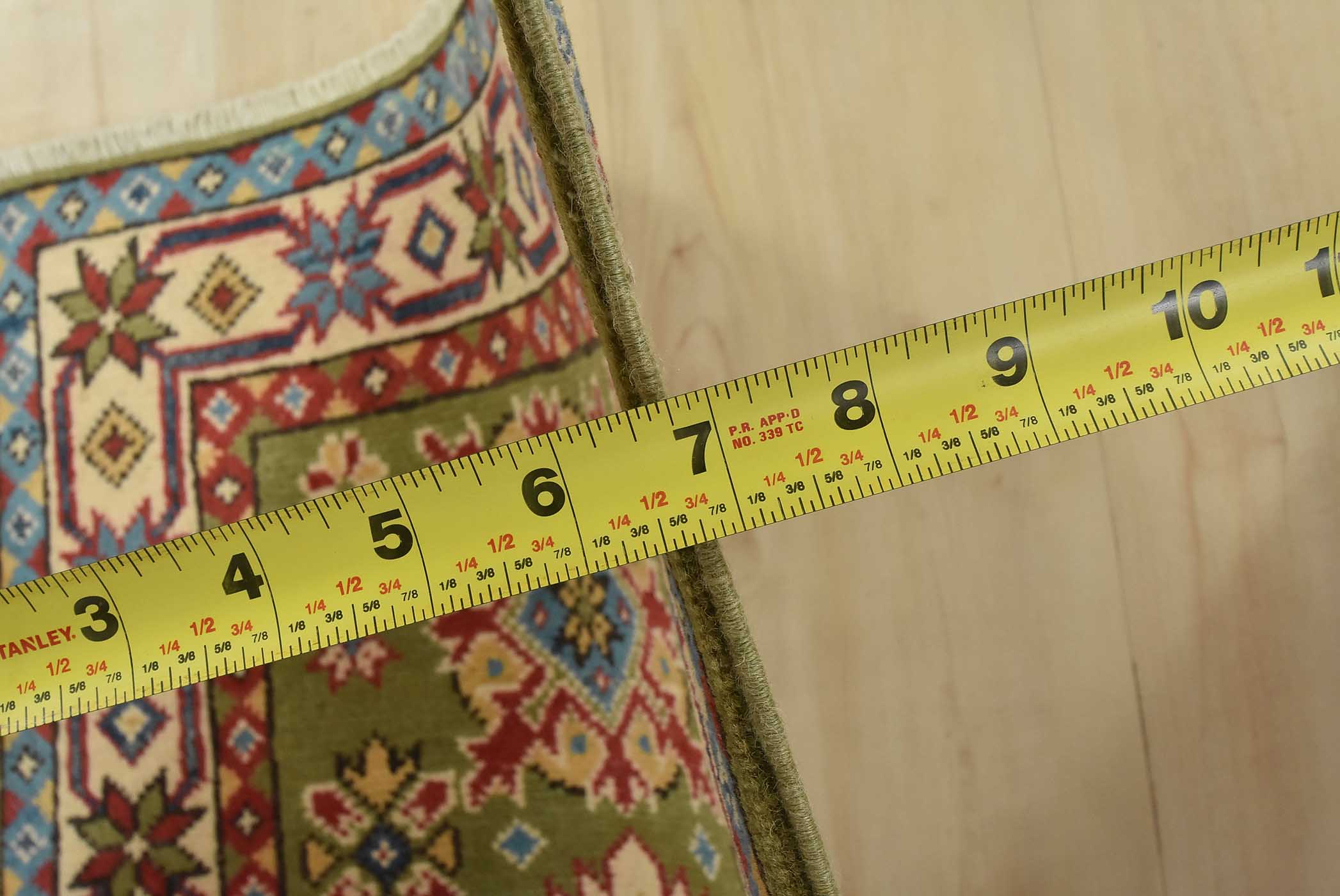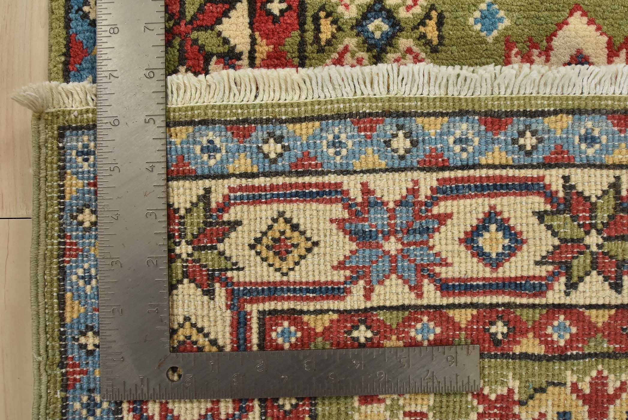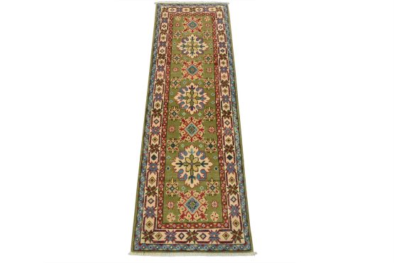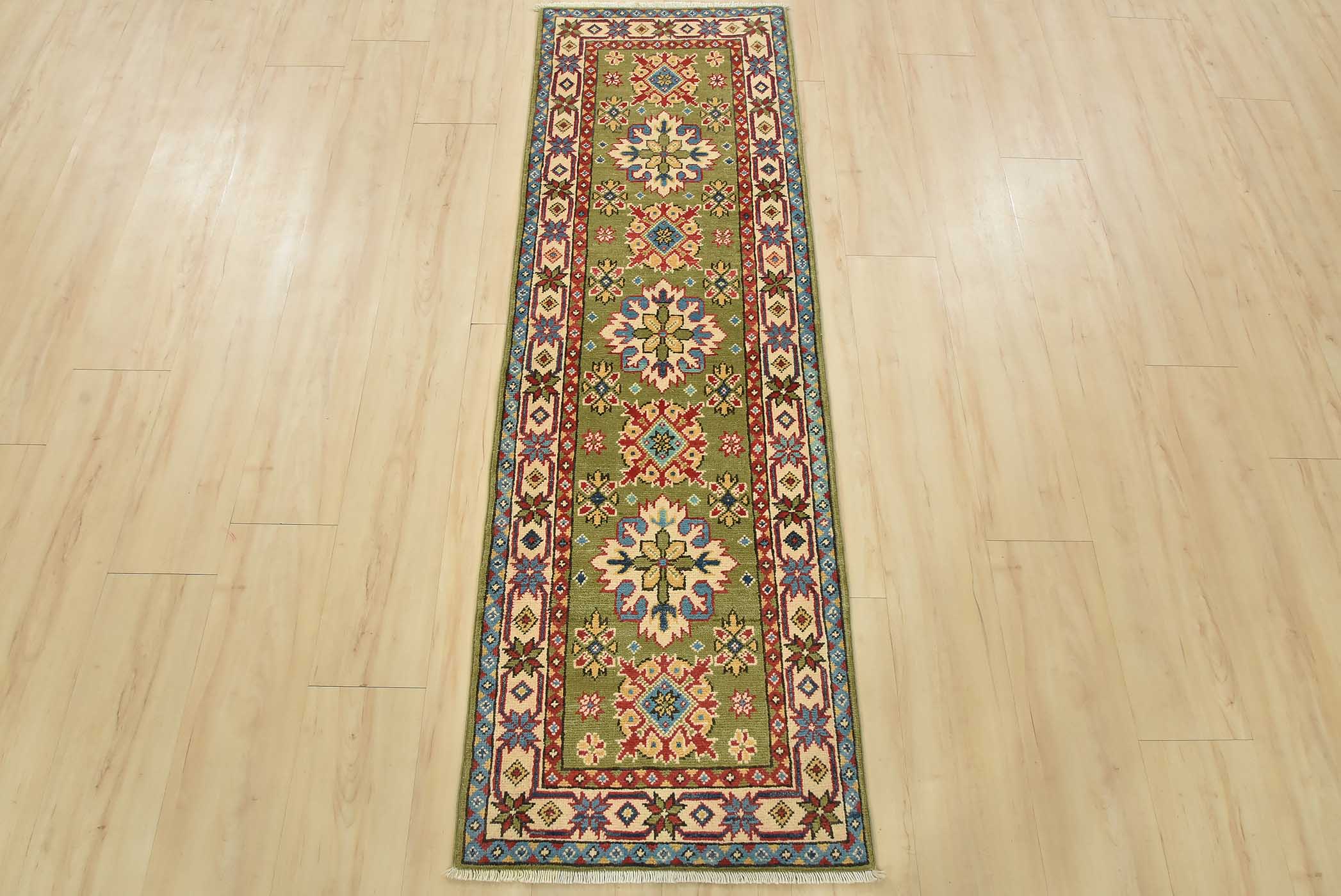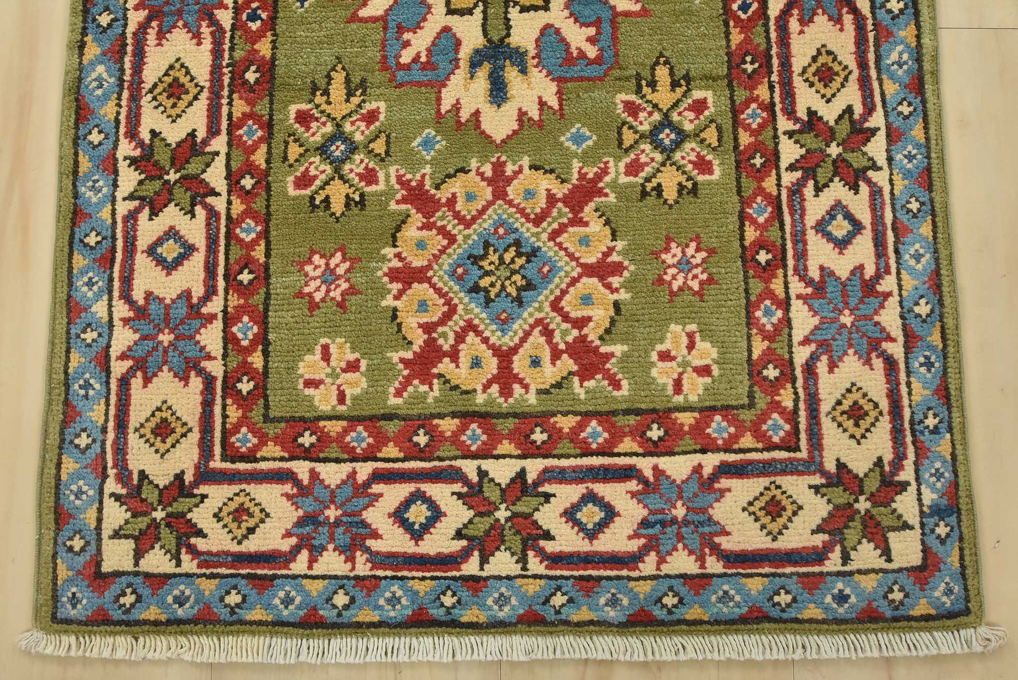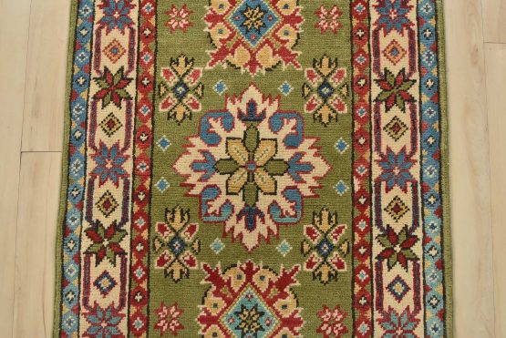 A tribal Caucasian Kazak runner hand-knotted with fine wool on a cotton foundation. This rug features geometric medallions surrounded by small geometric motifs set against a green background. It is new and in excellent condition.
