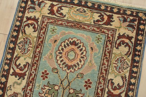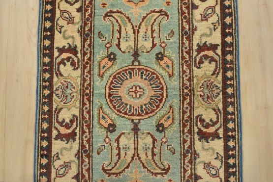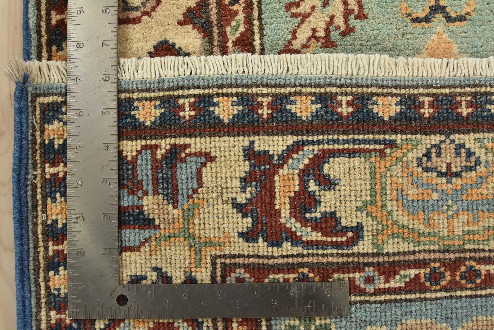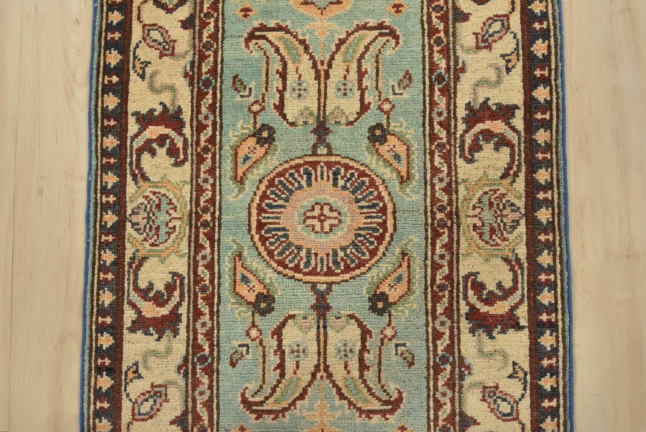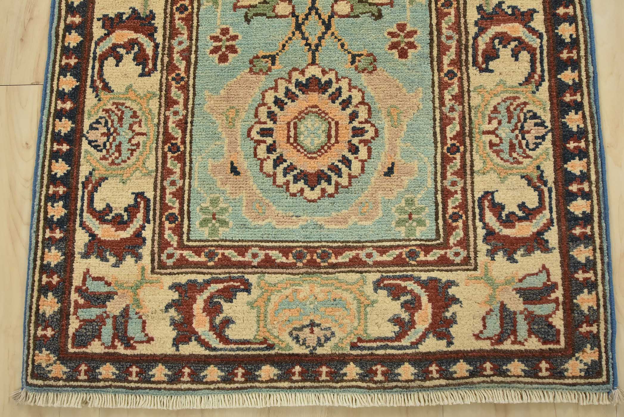 A traditional Caucasian Kazak runner hand-knotted with fine wool on a cotton foundation. This rug features botanical motifs set against a light blue background. It is new and in excellent condition.