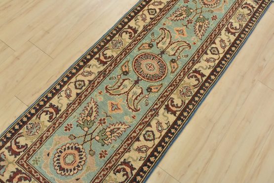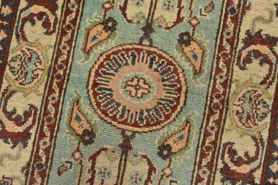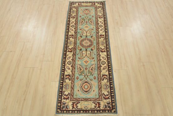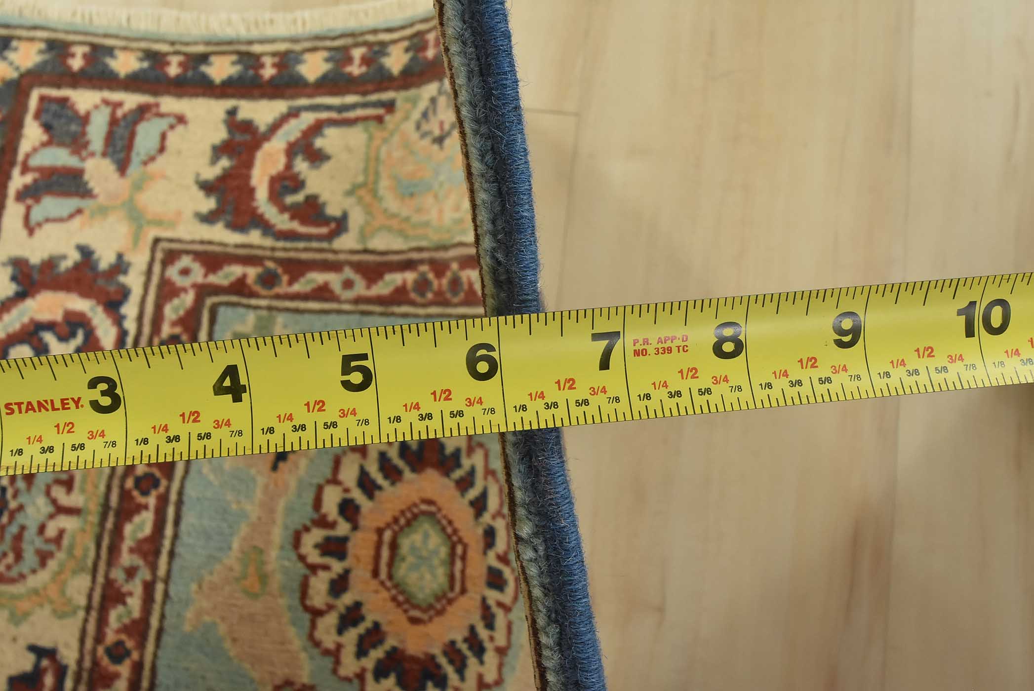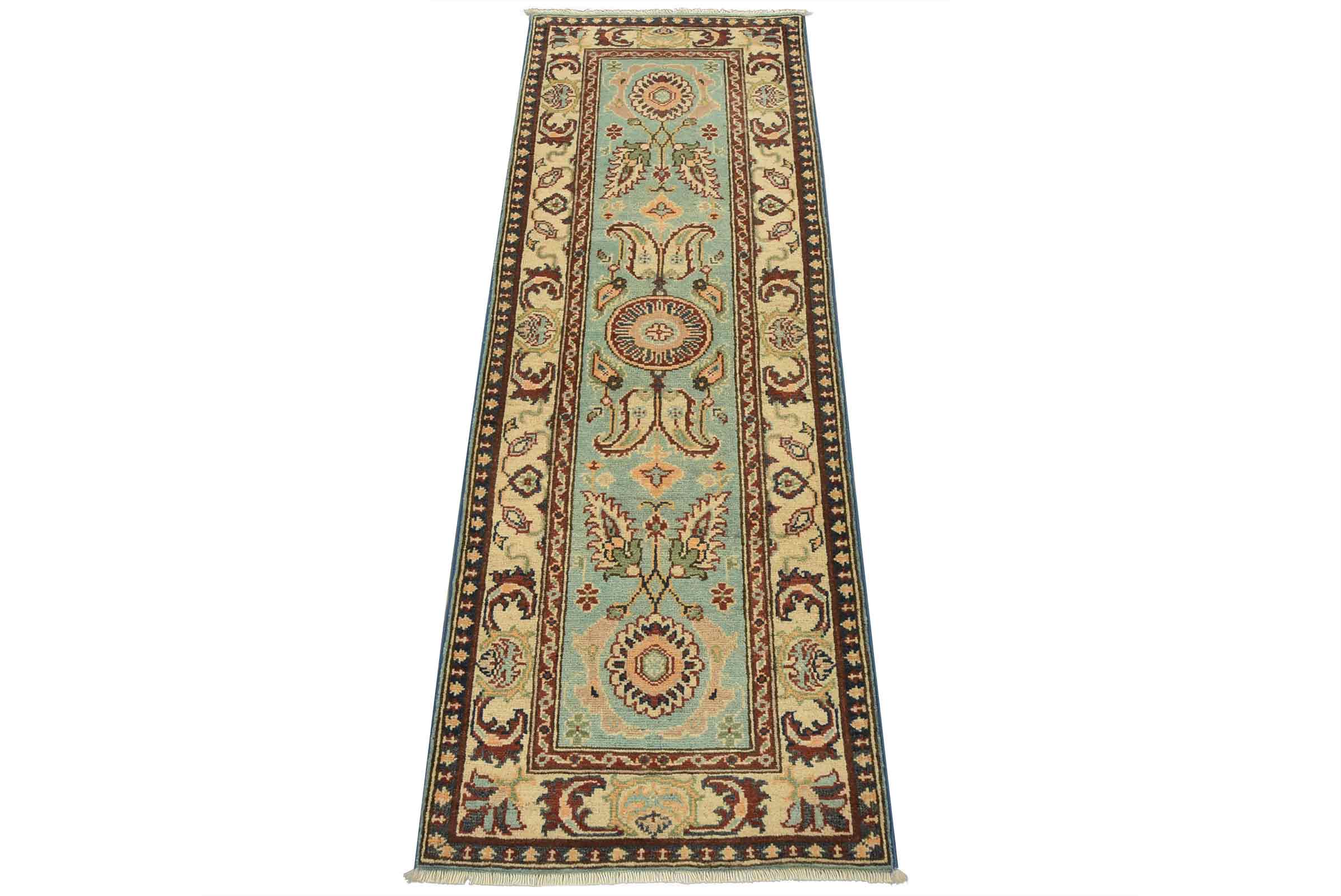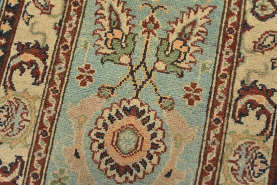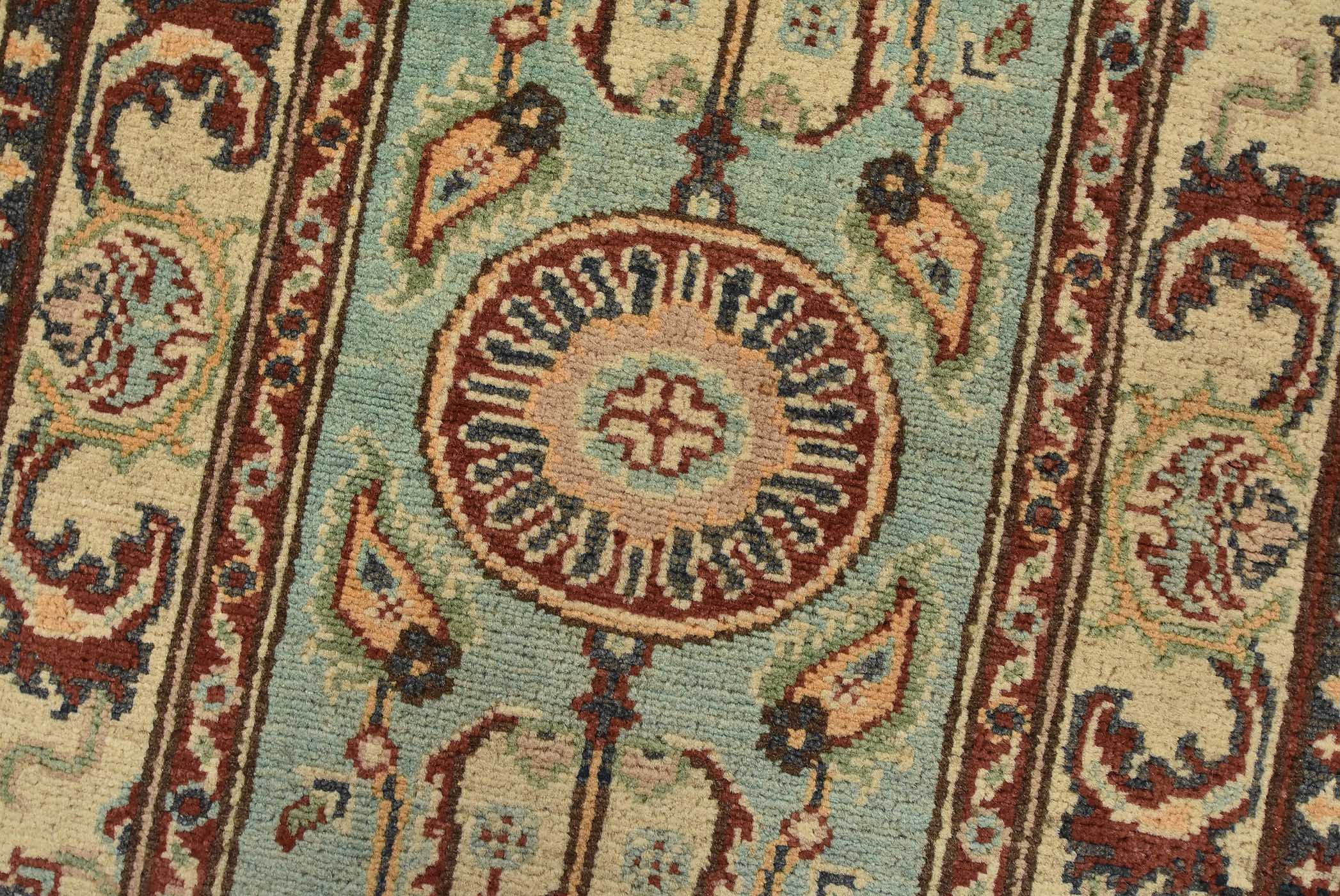 A traditional Caucasian Kazak runner hand-knotted with fine wool on a cotton foundation. This rug features botanical motifs set against a light blue background. It is new and in excellent condition.
