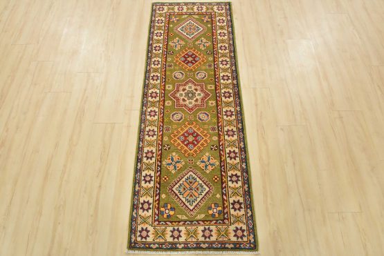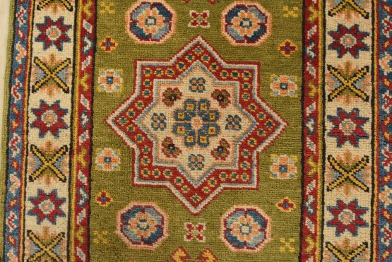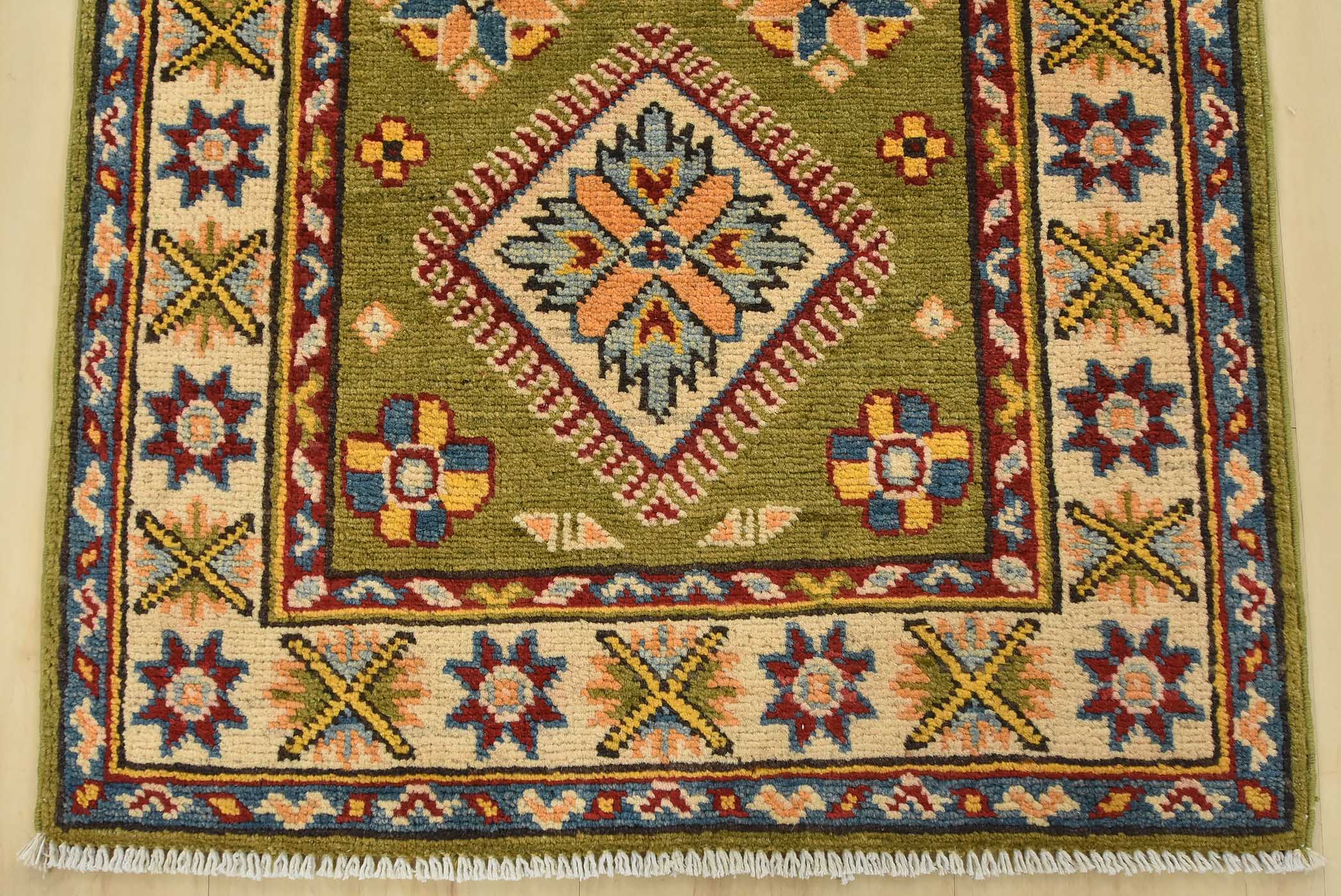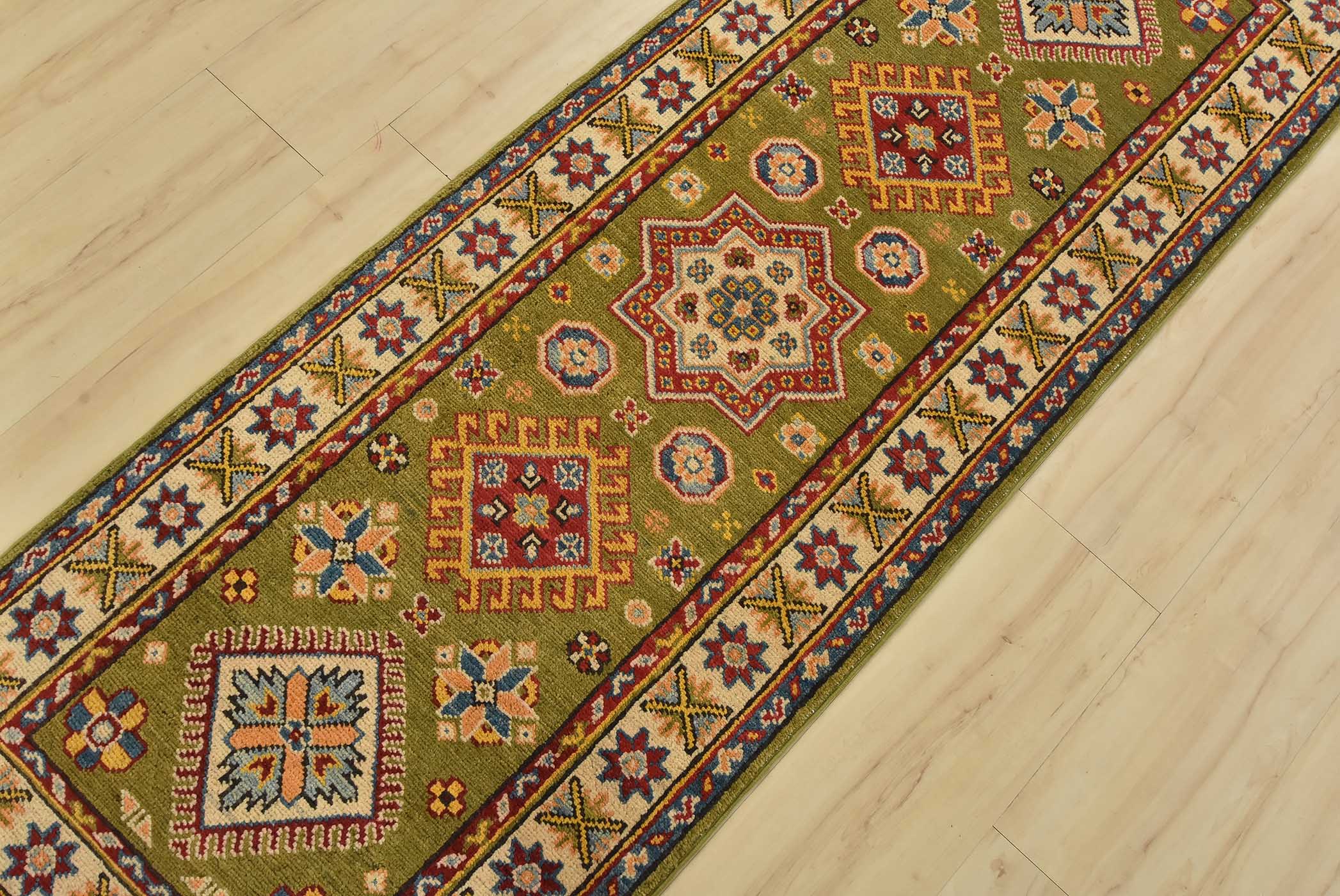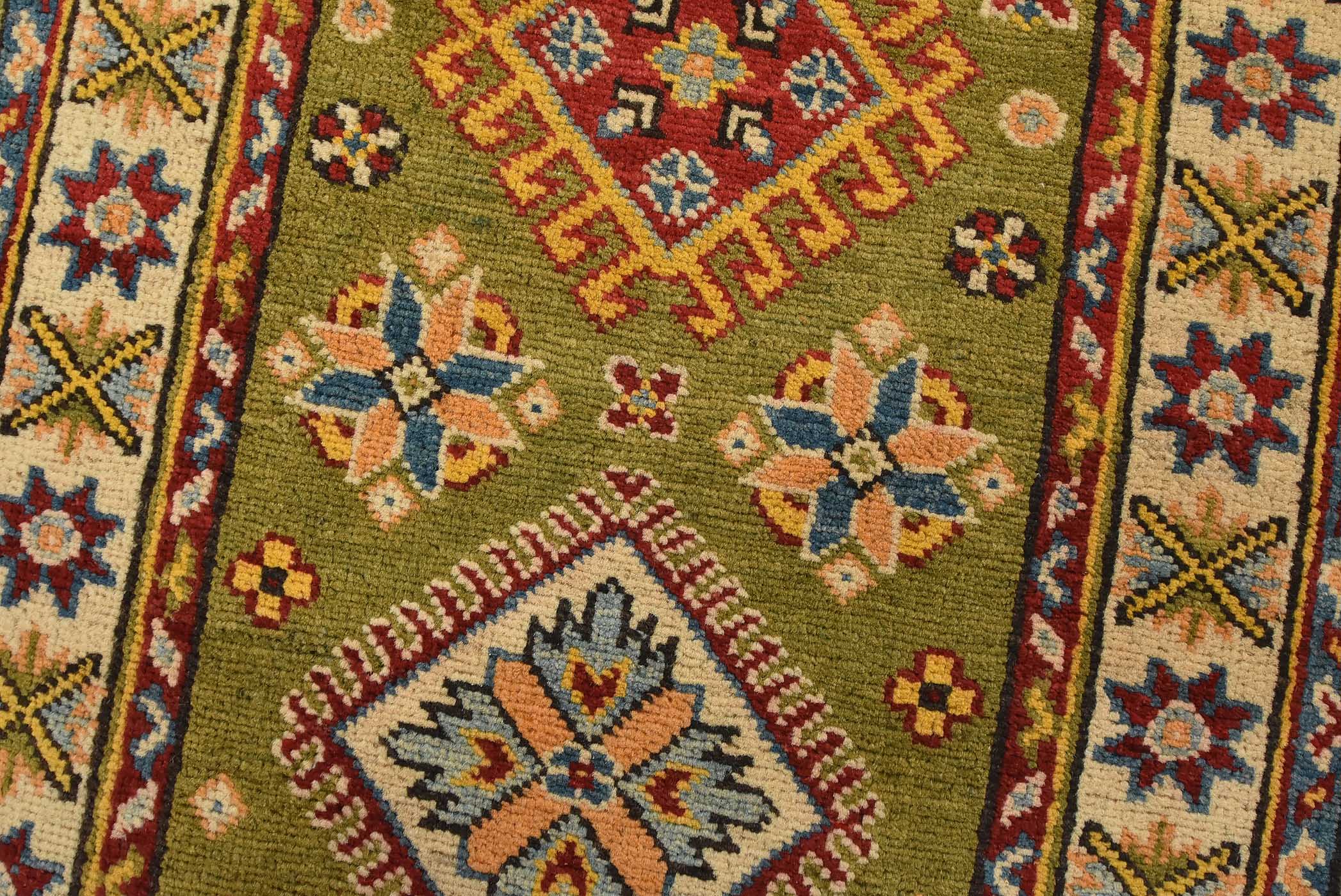 A tribal Caucasian Kazak runner hand-knotted with fine wool on a cotton foundation. This rug features a row of geometric medallions surrounded by small floral motifs set against a green background. It is new and in excellent condition.
