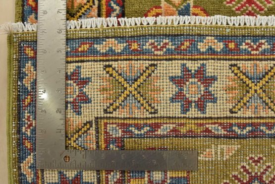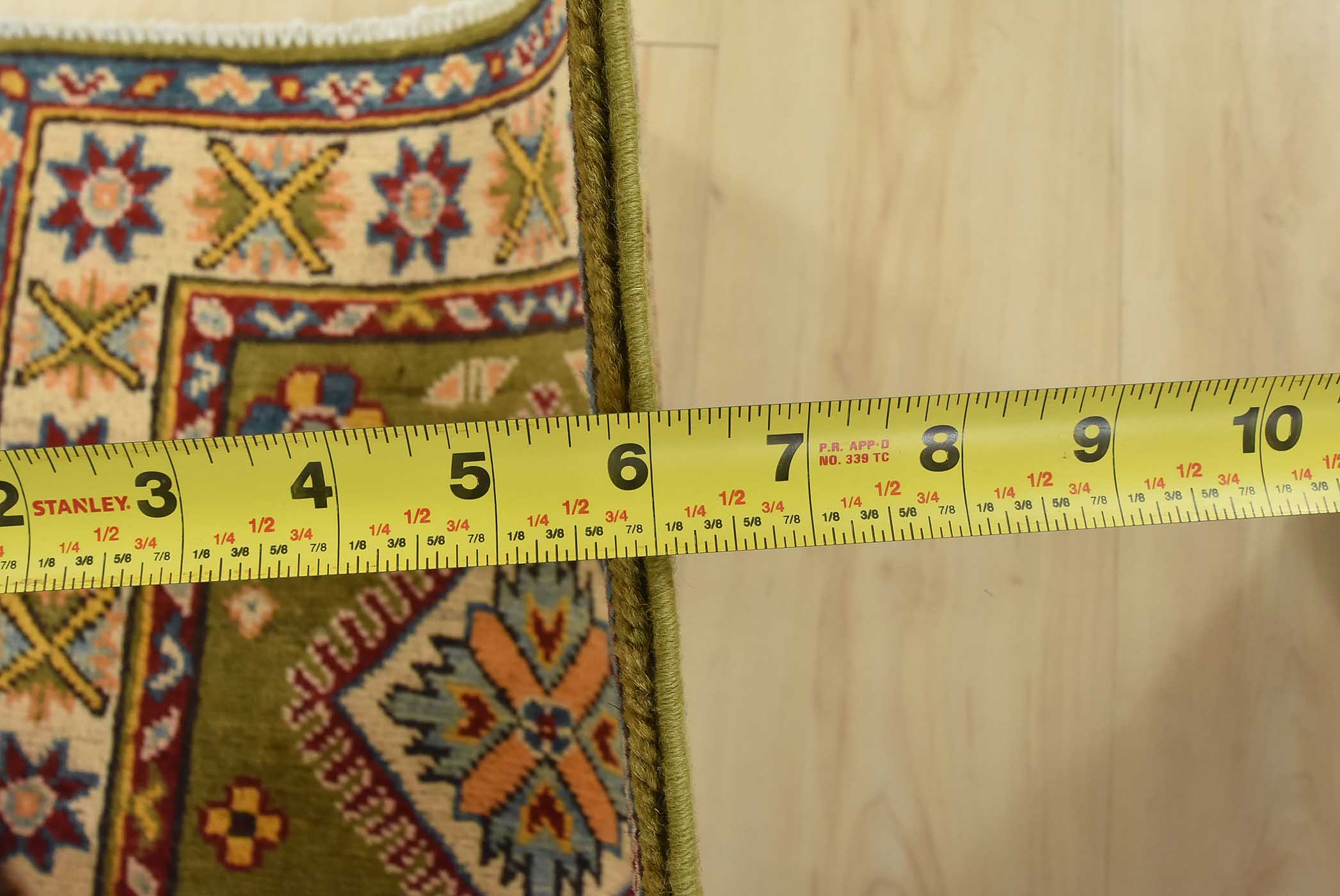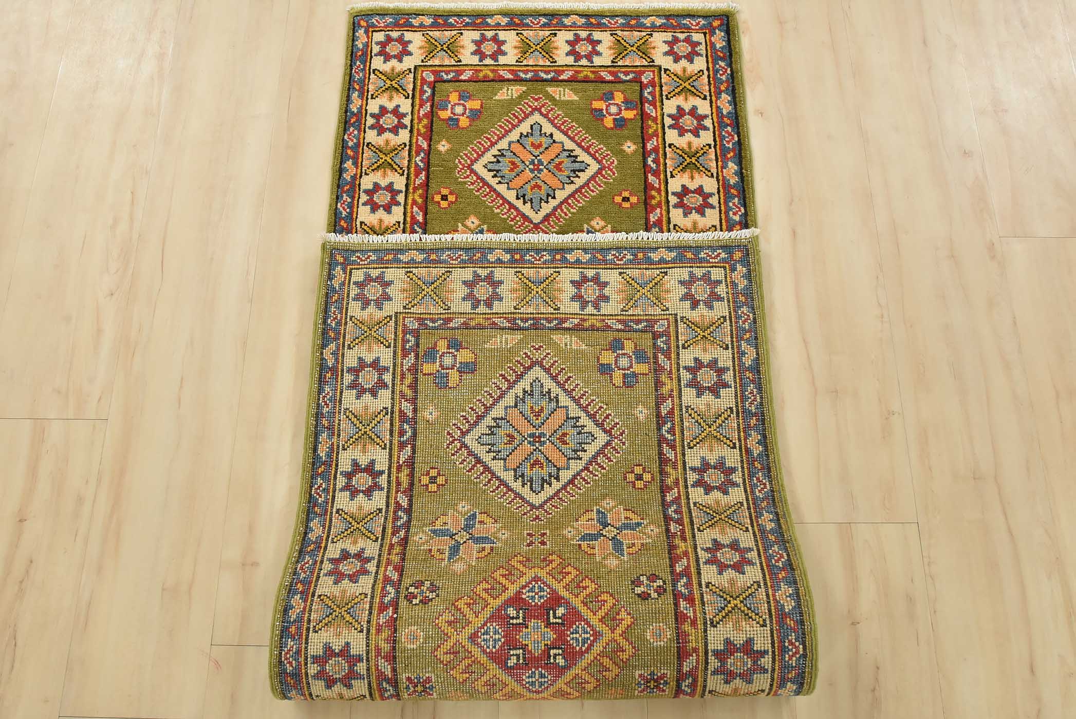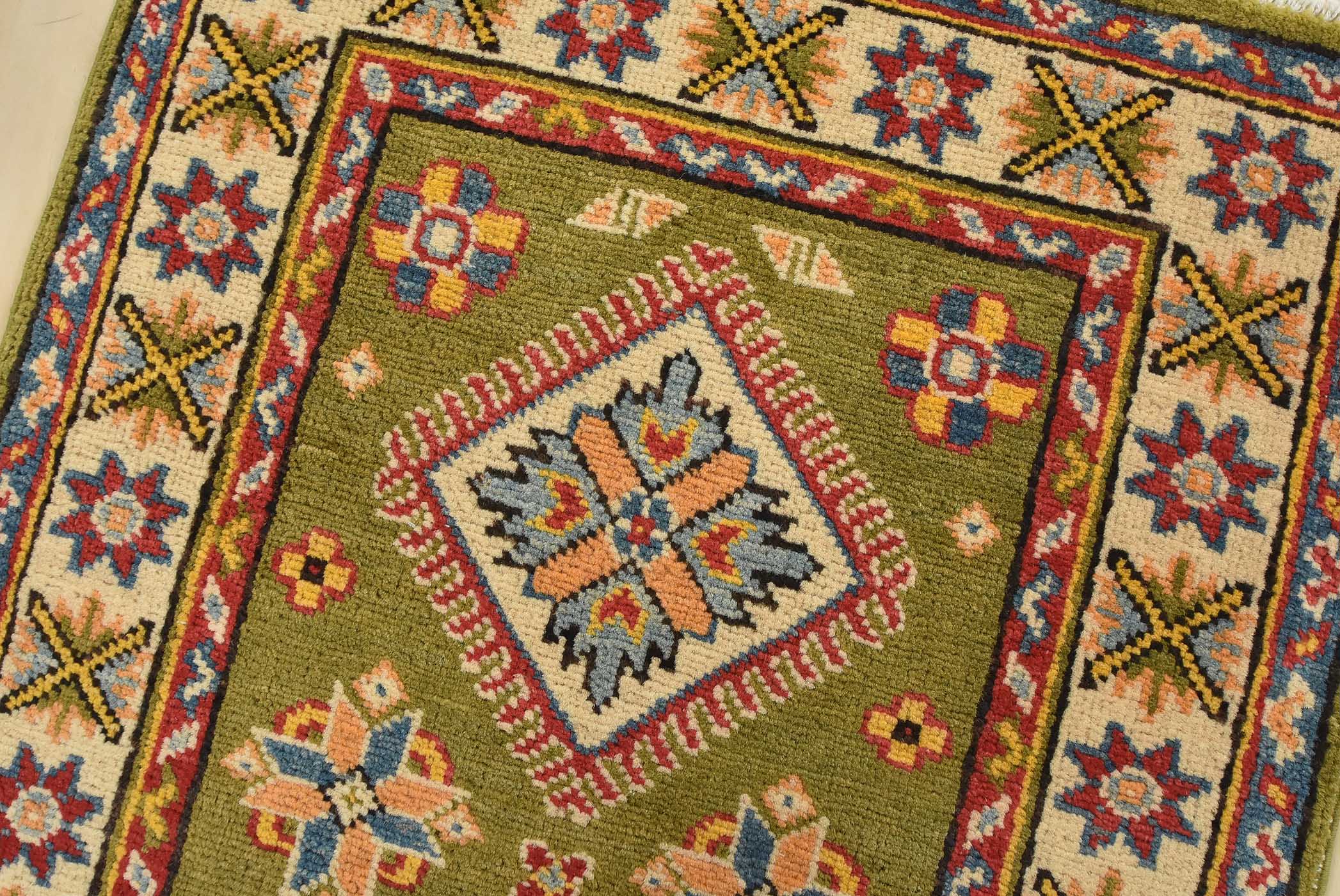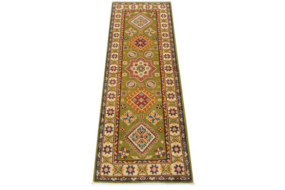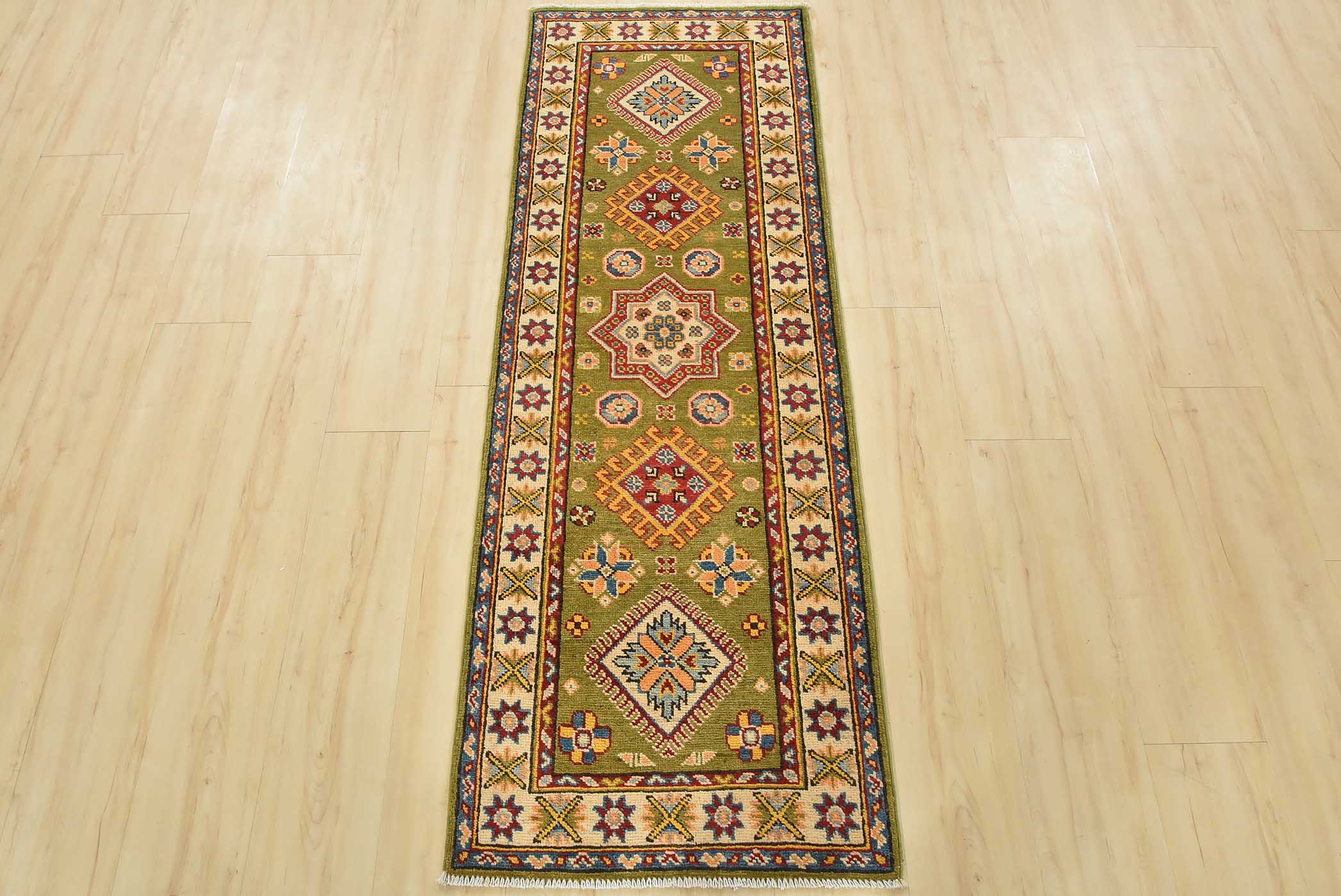 A tribal Caucasian Kazak runner hand-knotted with fine wool on a cotton foundation. This rug features a row of geometric medallions surrounded by small floral motifs set against a green background. It is new and in excellent condition.