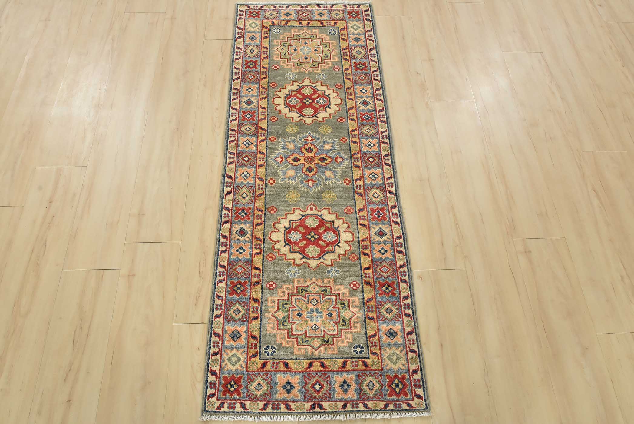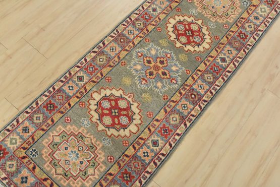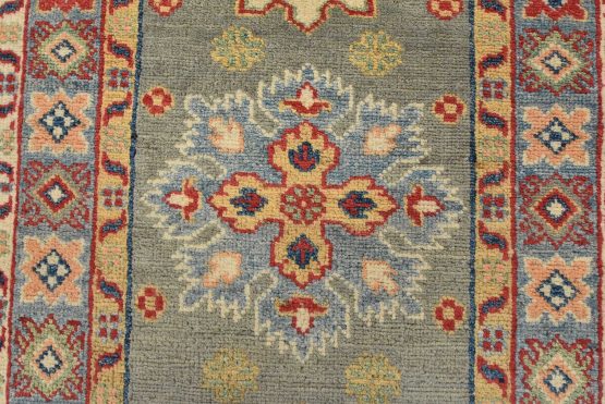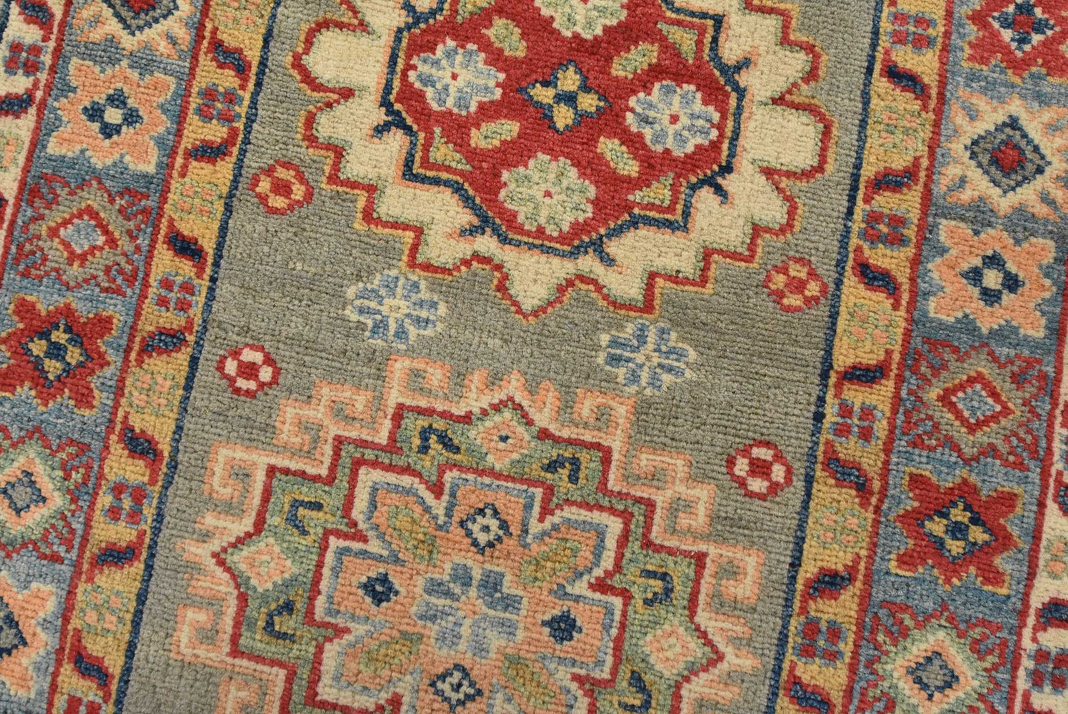 A tribal Caucasian Kazak runner hand-knotted with fine wool on a cotton foundation. This rug features a row of geometric medallions set against a gray background. It is new and in excellent condition.