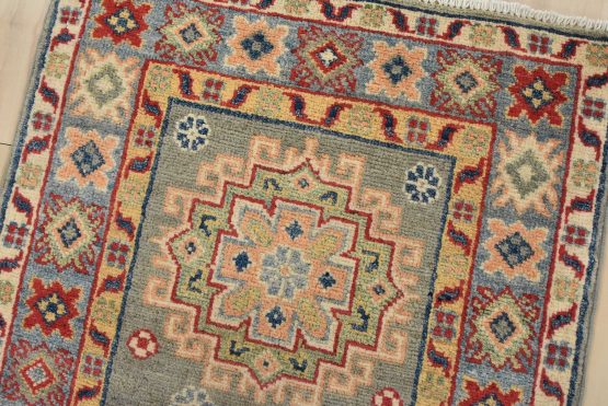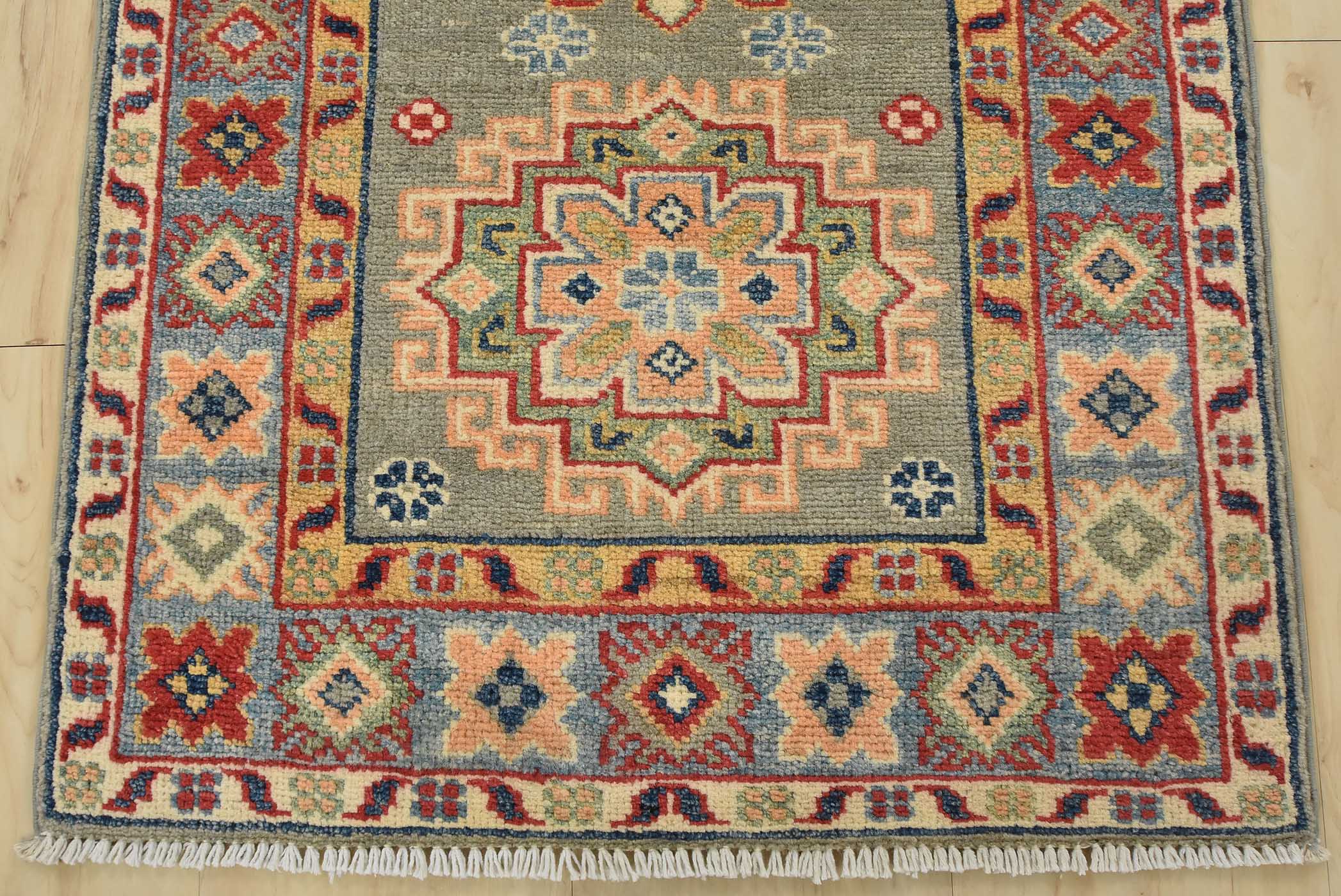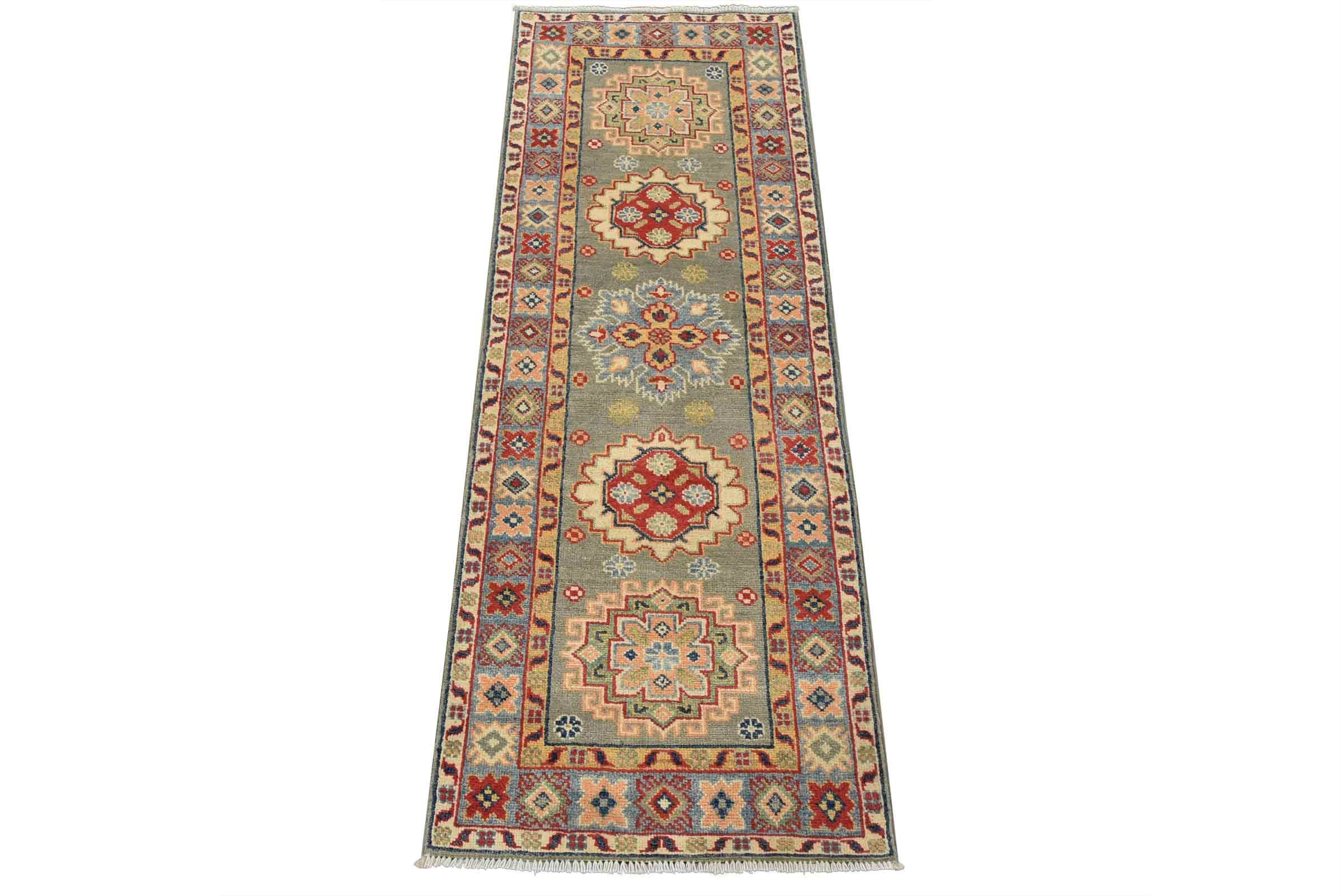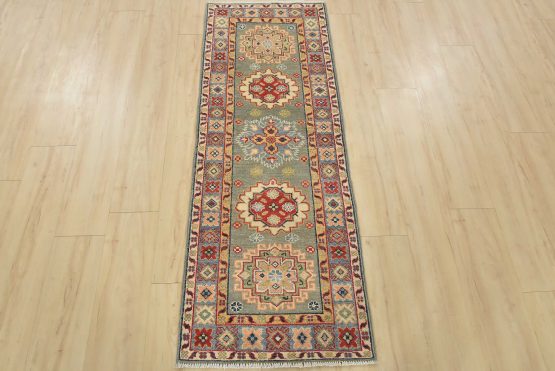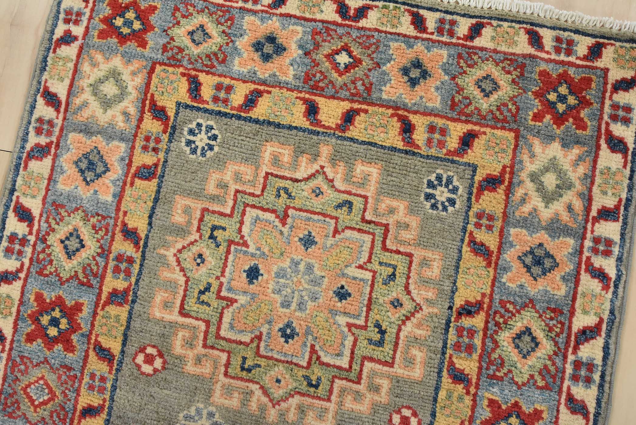 A tribal Caucasian Kazak runner hand-knotted with fine wool on a cotton foundation. This rug features a row of geometric medallions set against a gray background. It is new and in excellent condition.