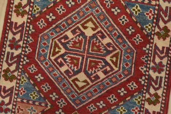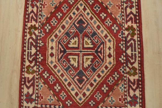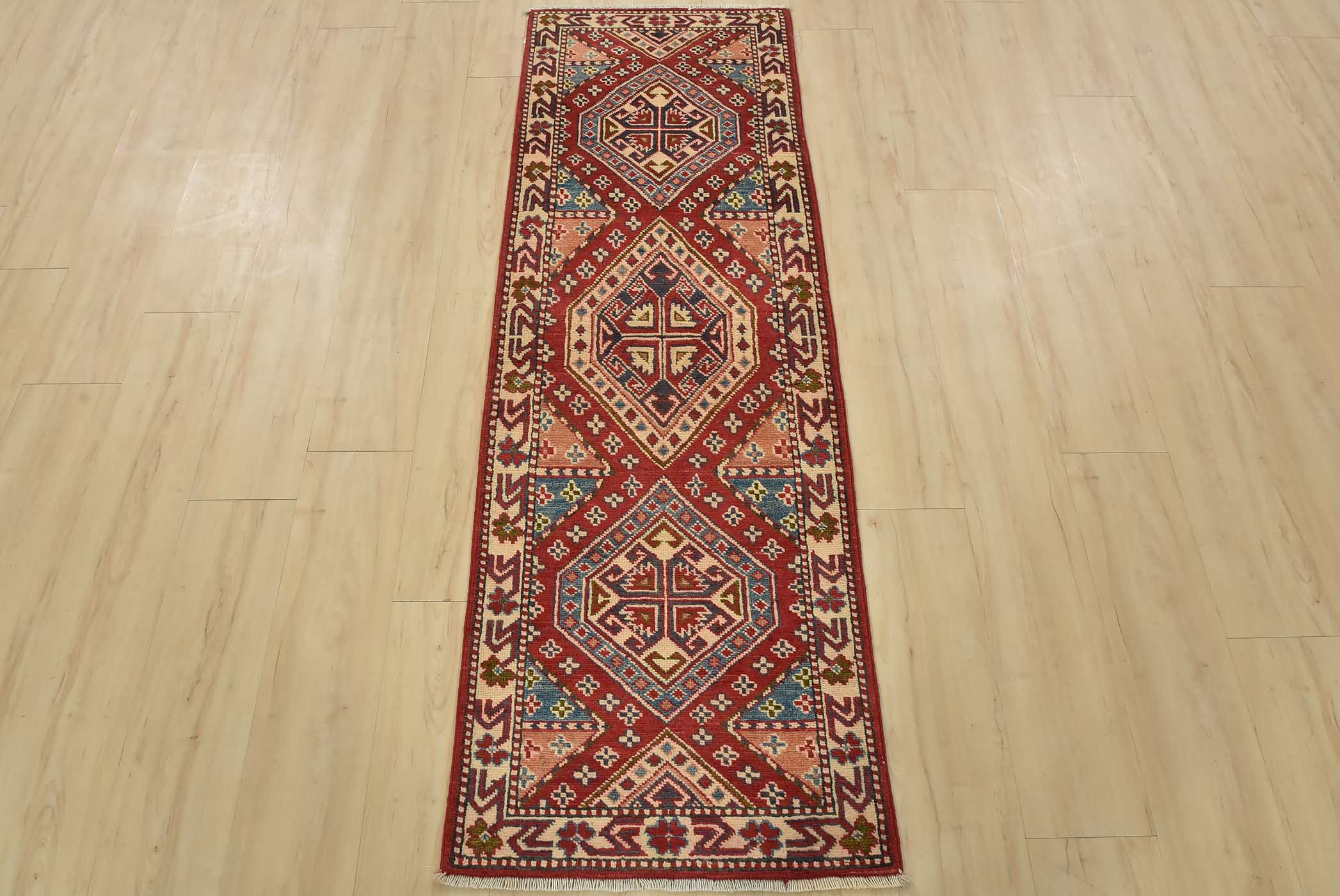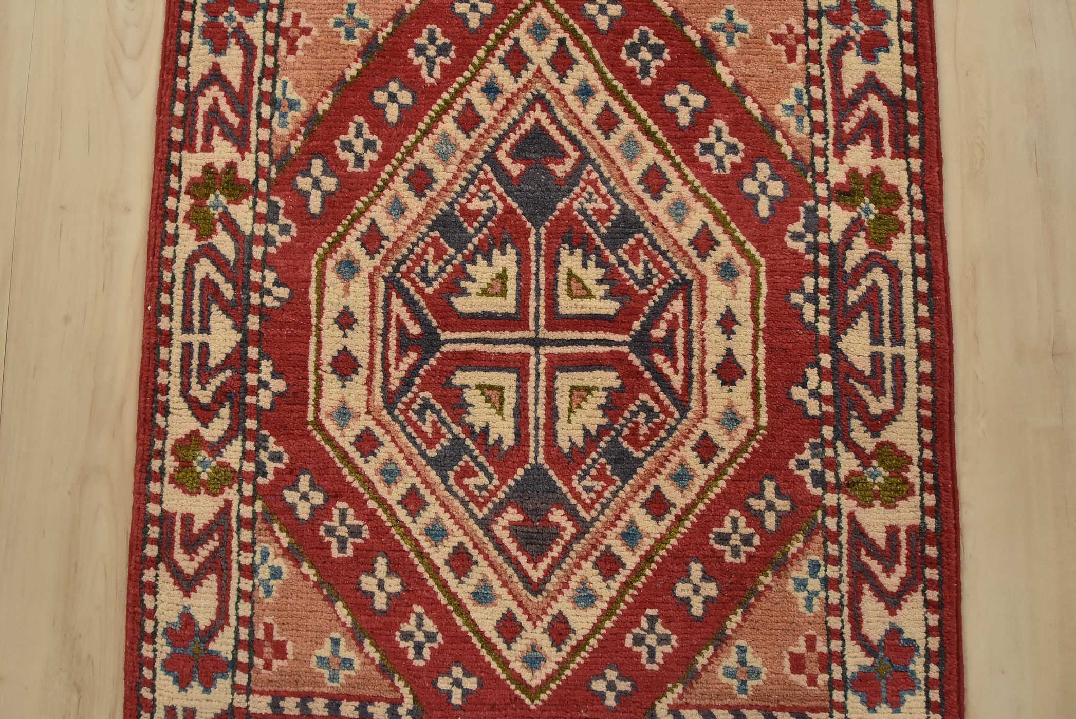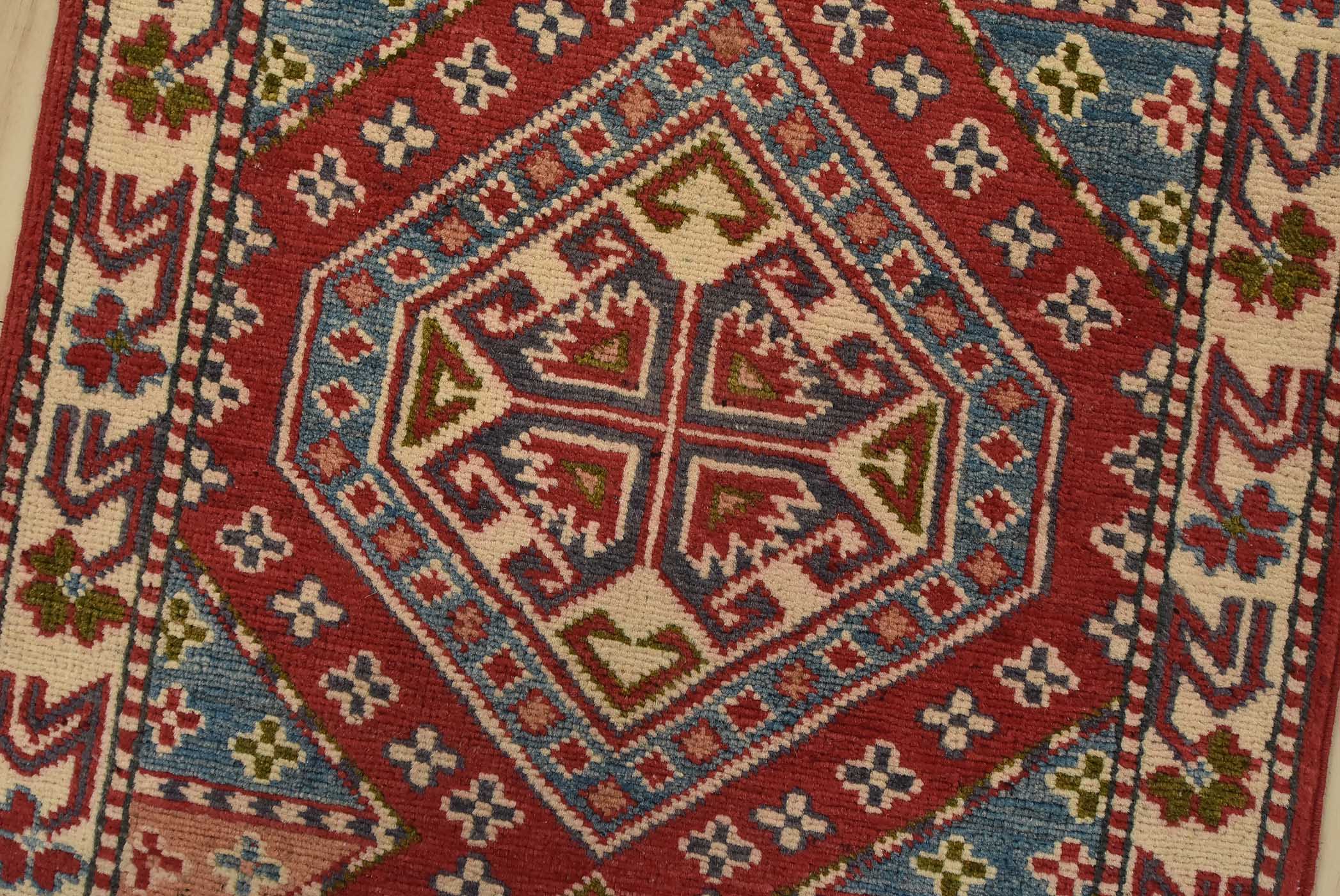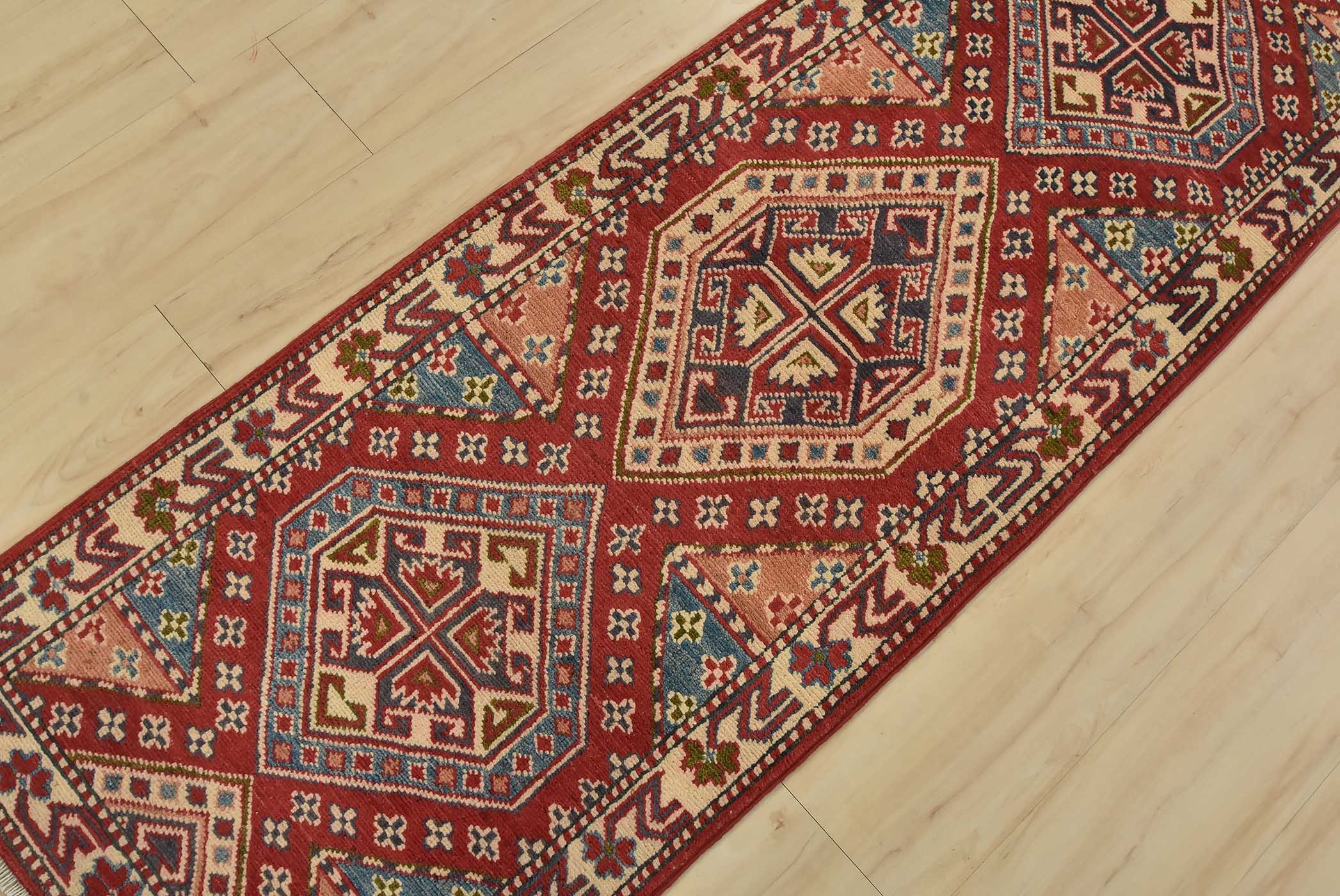 A tribal Caucasian Kazak runner hand-knotted with fine wool on a cotton foundation. This rug features geometric medallions set against a red background. It is new and in excellent condition.