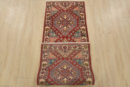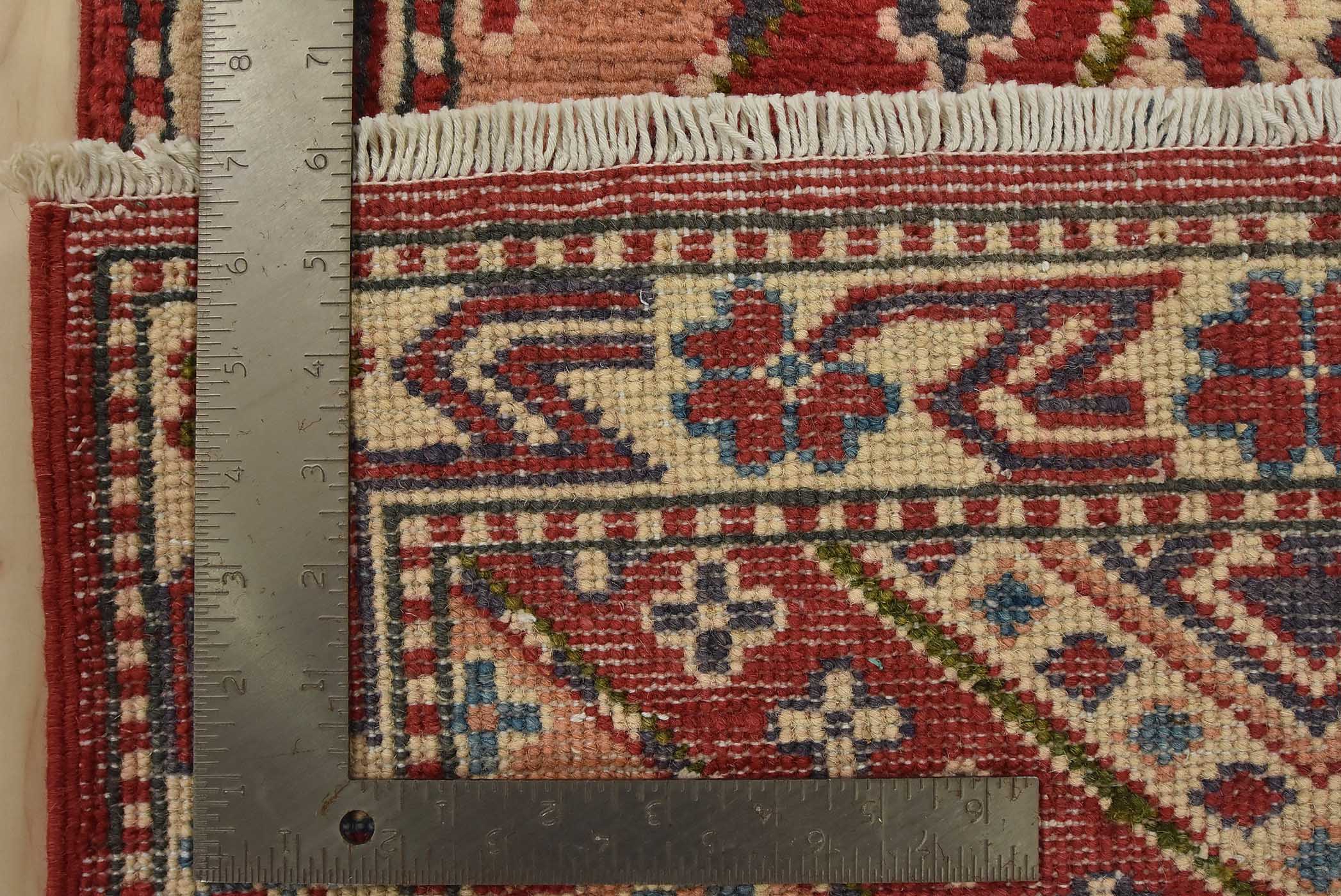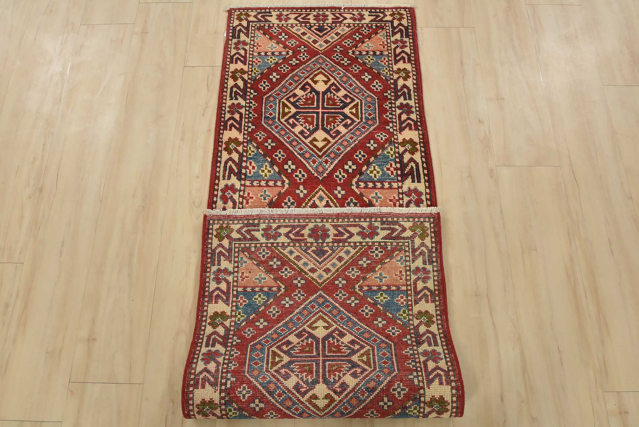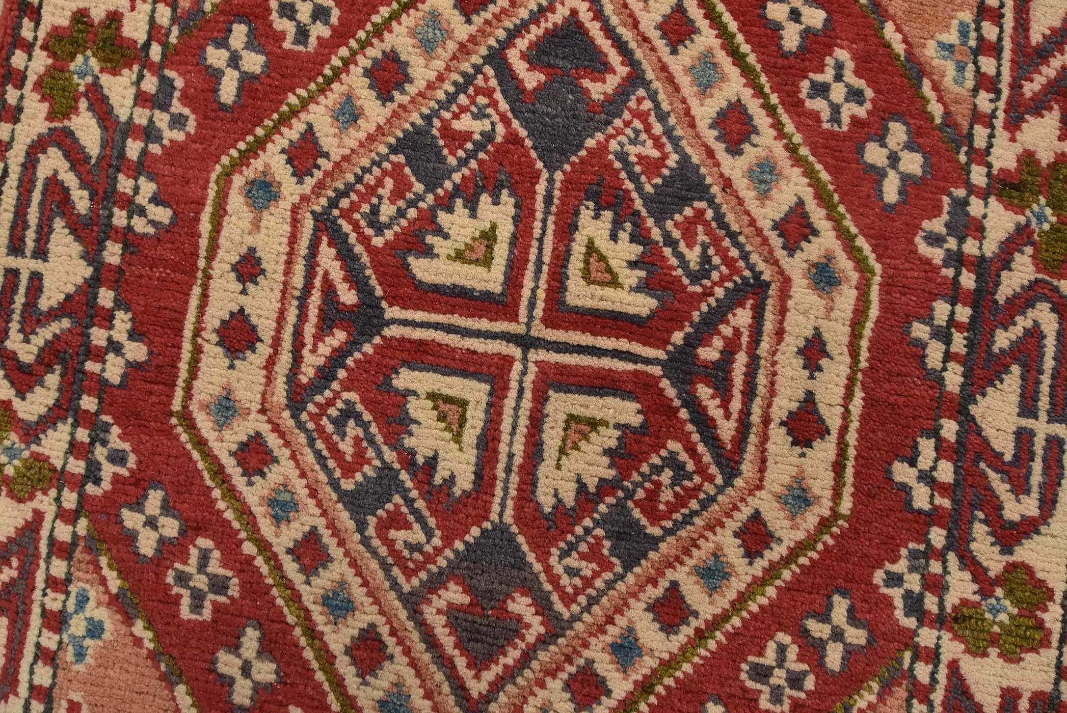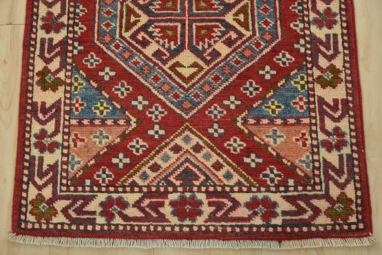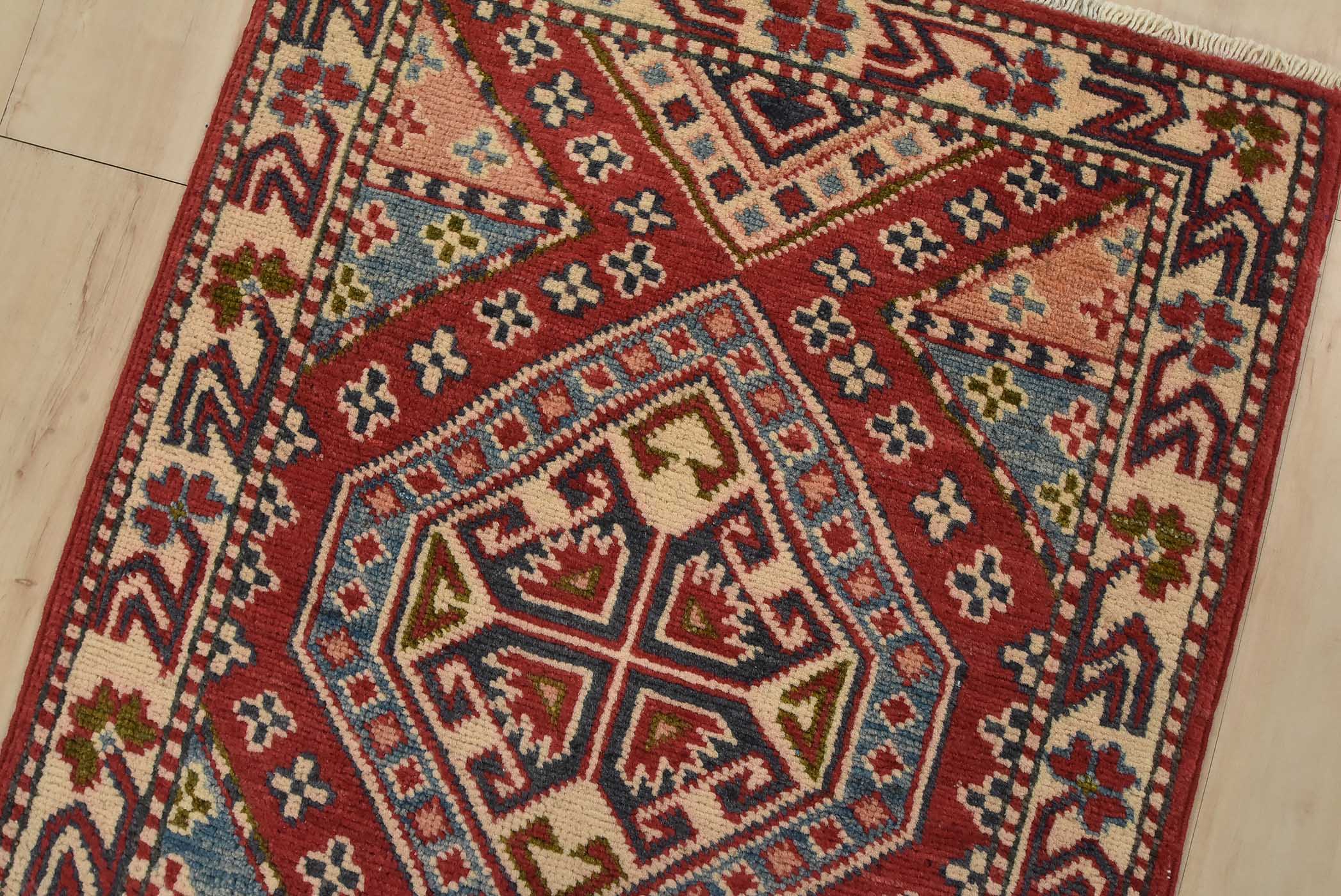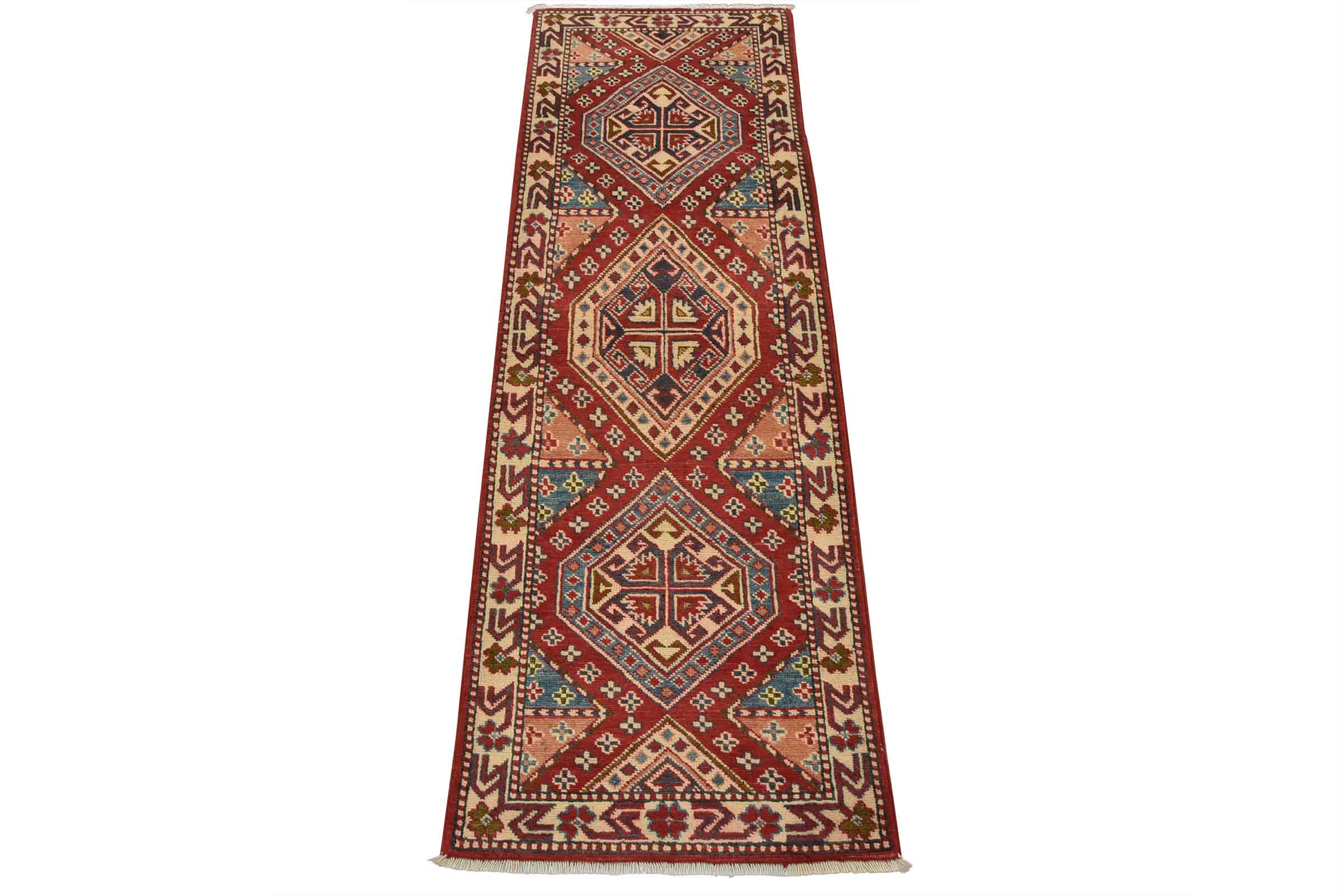 A tribal Caucasian Kazak runner hand-knotted with fine wool on a cotton foundation. This rug features geometric medallions set against a red background. It is new and in excellent condition.