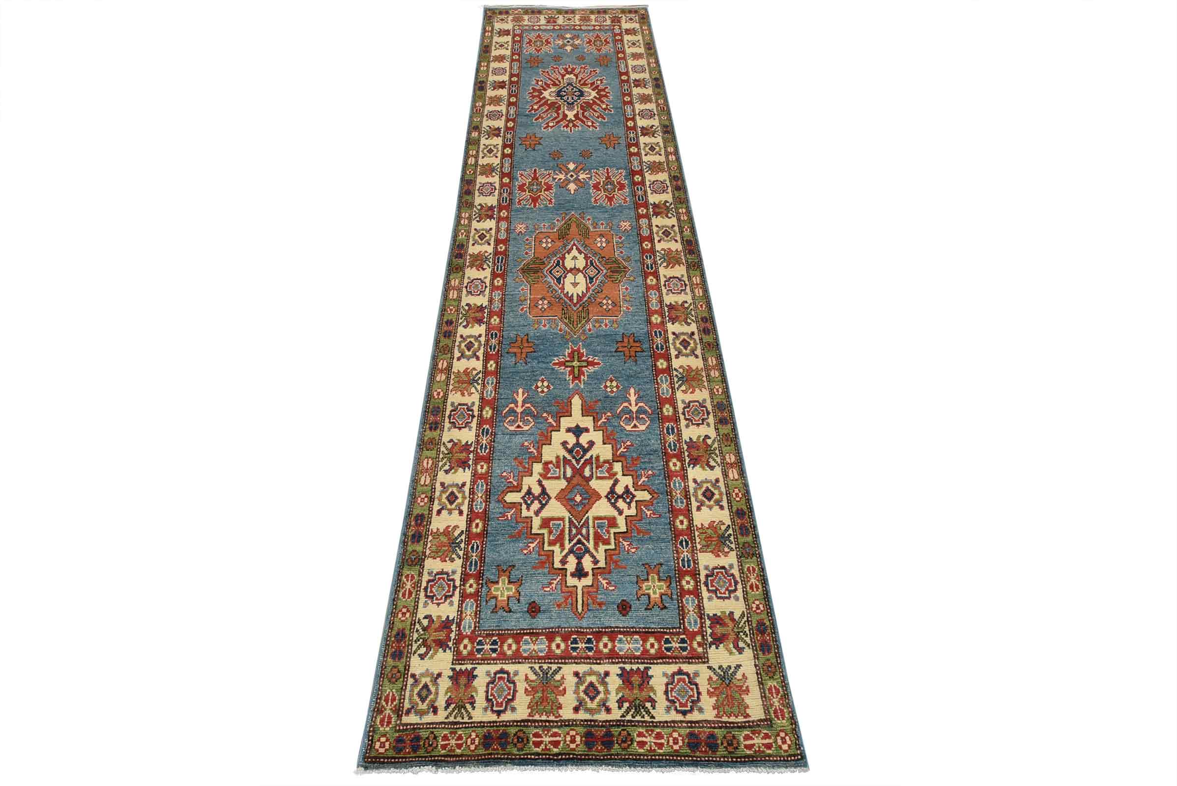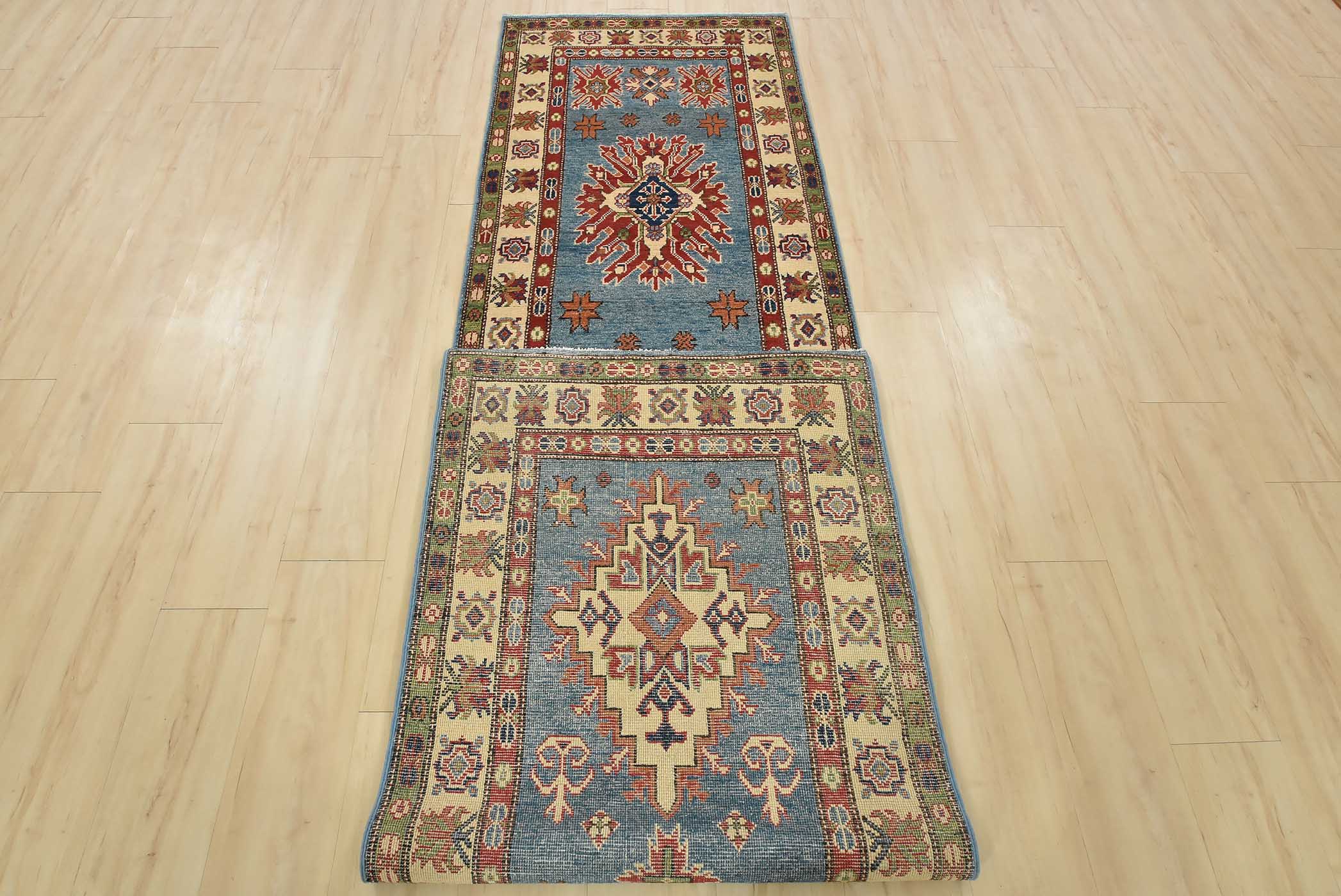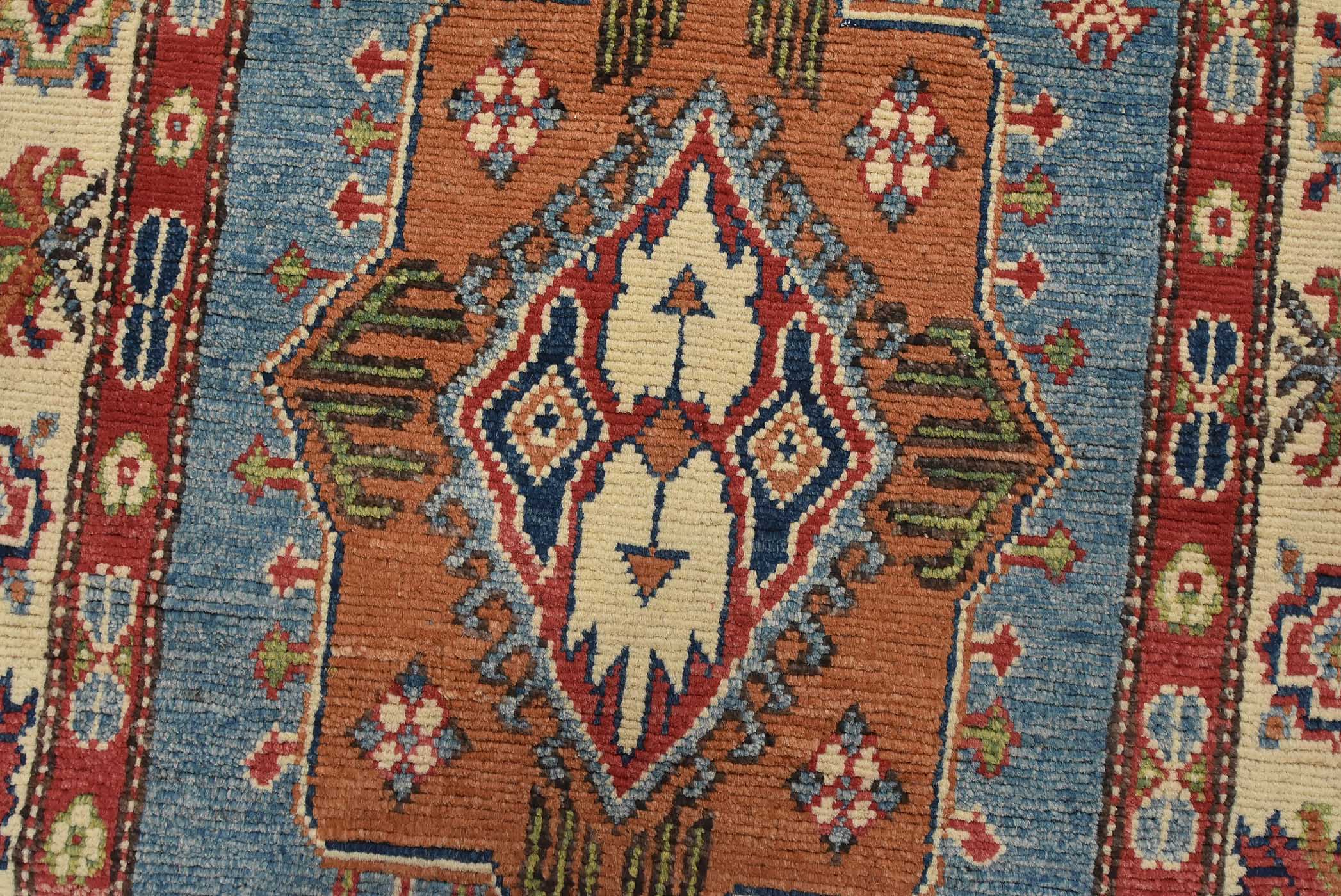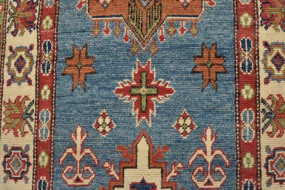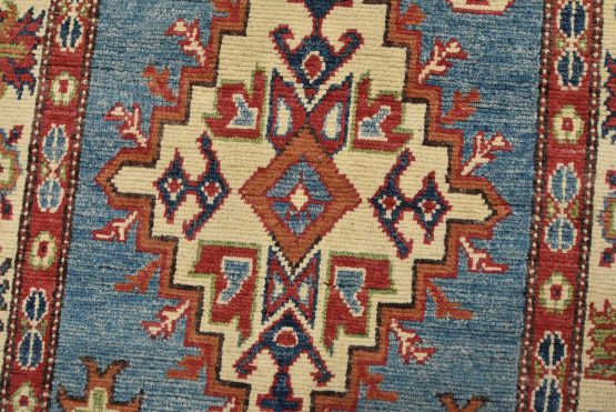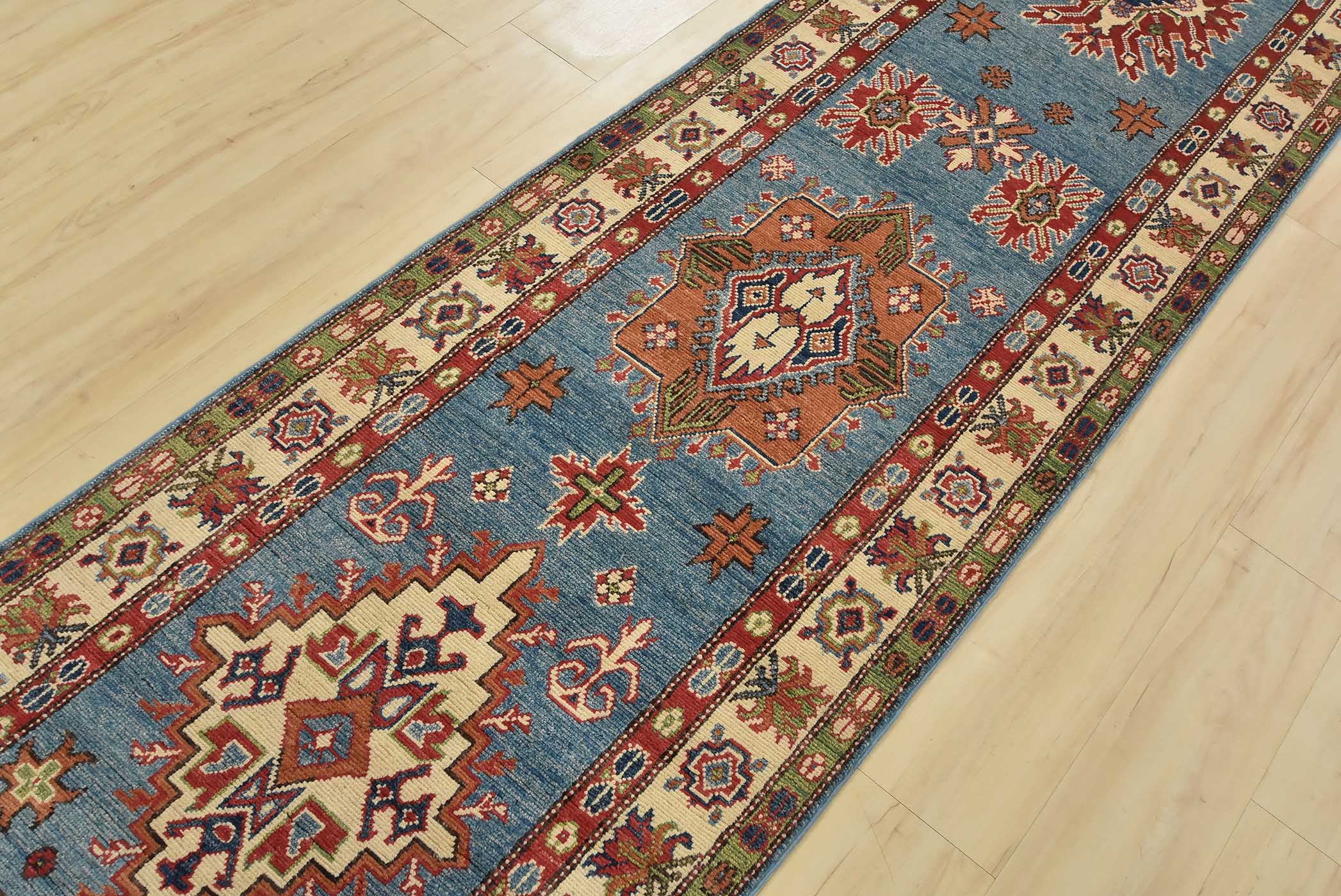 A tribal Caucasian Kazak runner hand-knotted with fine wool on a cotton foundation. This rug features geometric medallions surrounded by small geometric motifs set against a blue background. It is new and in excellent condition.
