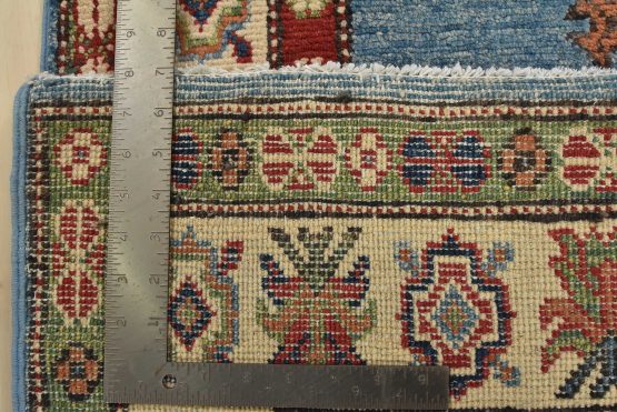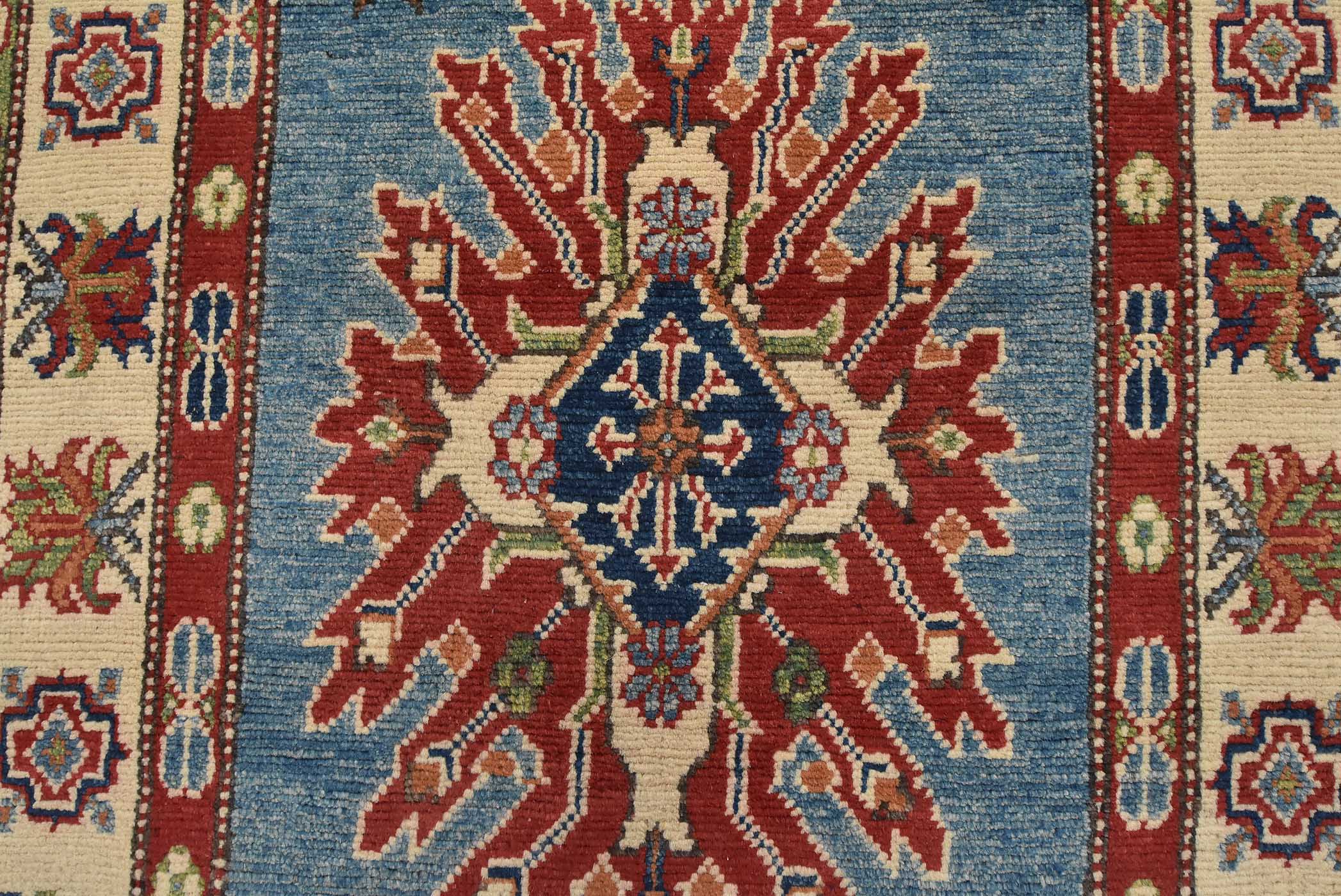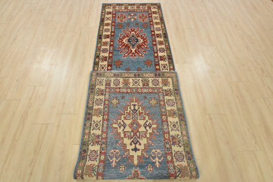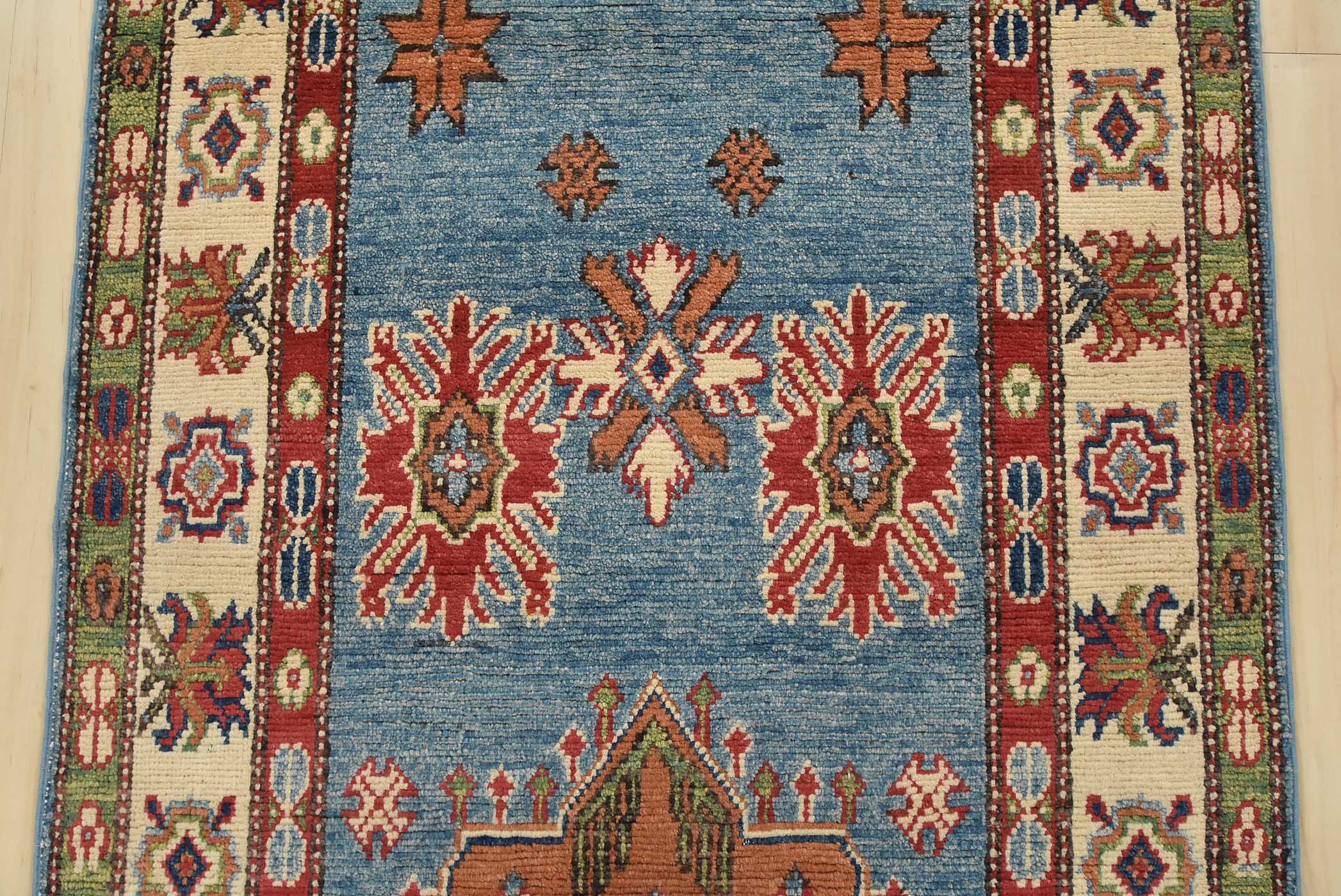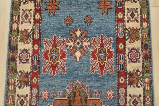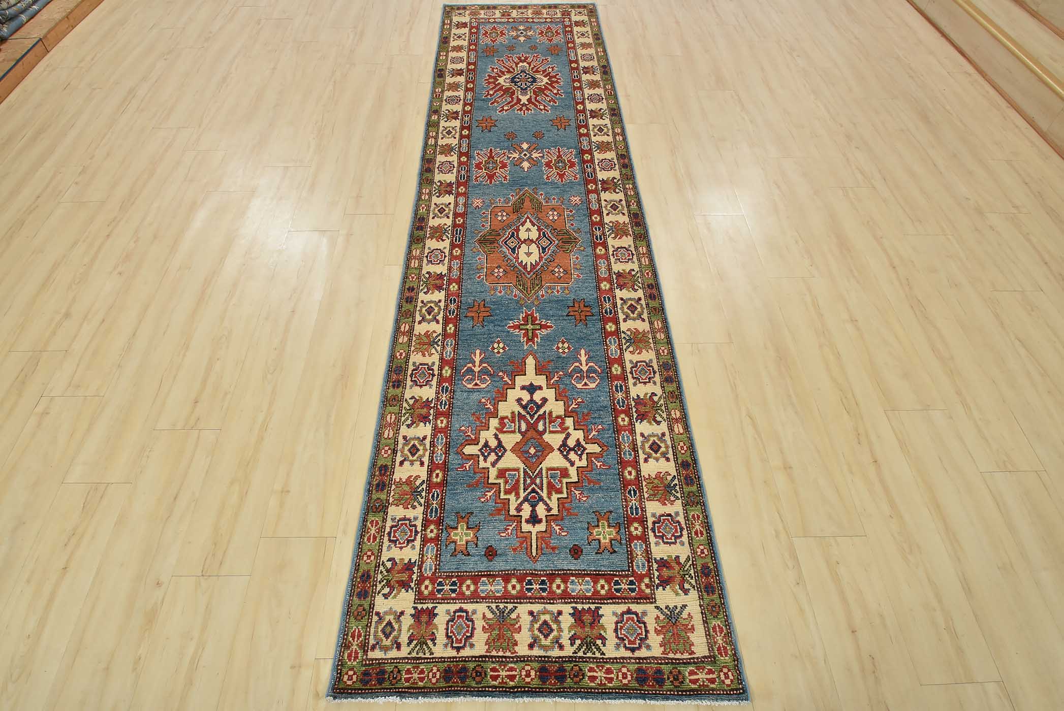 A tribal Caucasian Kazak runner hand-knotted with fine wool on a cotton foundation. This rug features geometric medallions surrounded by small geometric motifs set against a blue background. It is new and in excellent condition.
