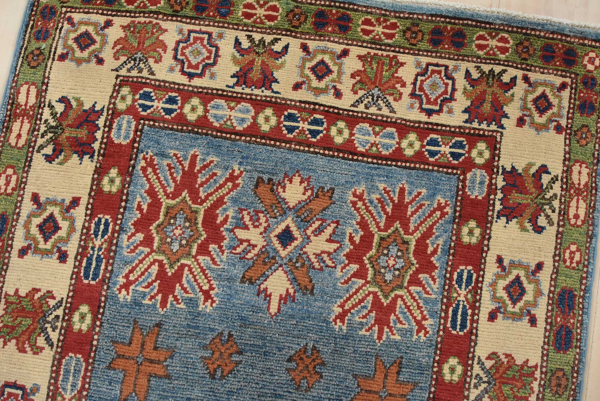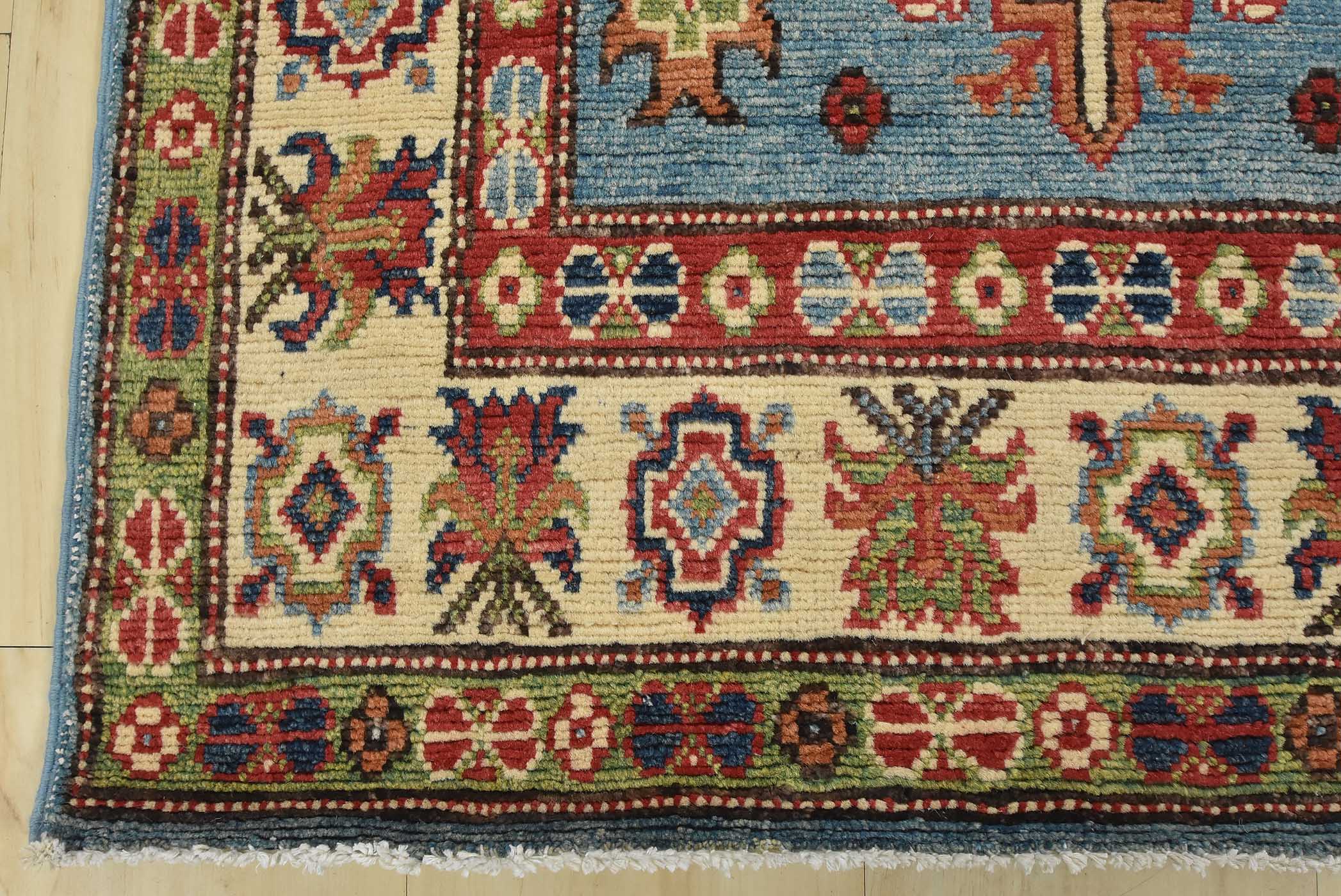 Original antique Kazak rugs from the Caucasus region inspire the creation of new Kazak rugs. These rugs are woven with fine wool using traditional Kazak patterns and finished with a low-cut pile to give them an authentic vintage look.