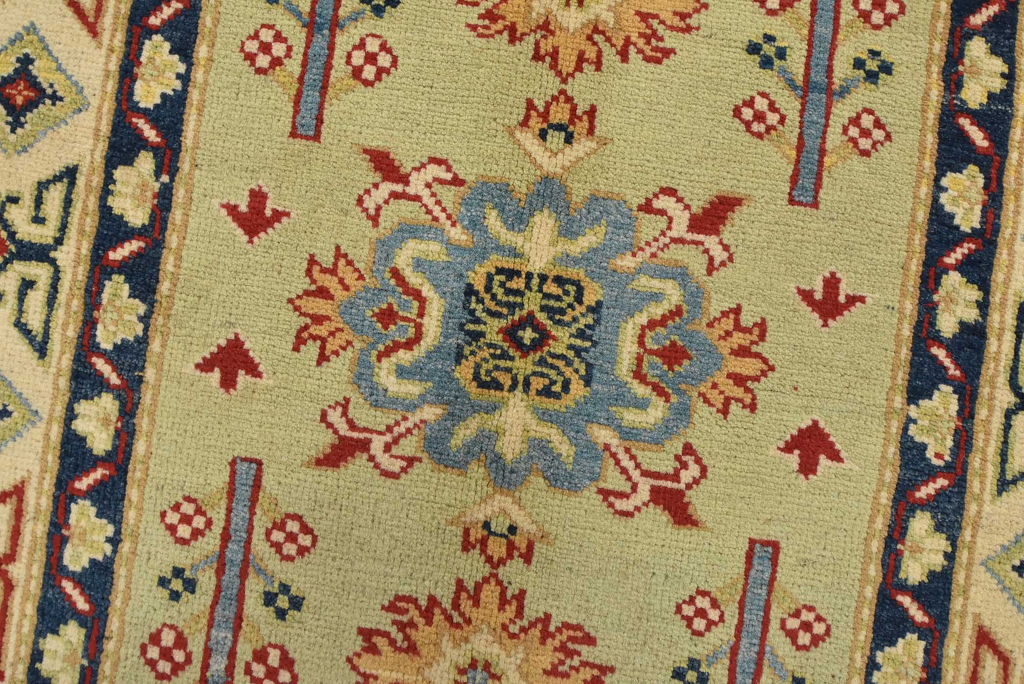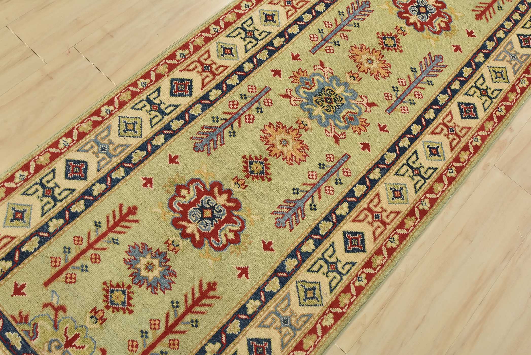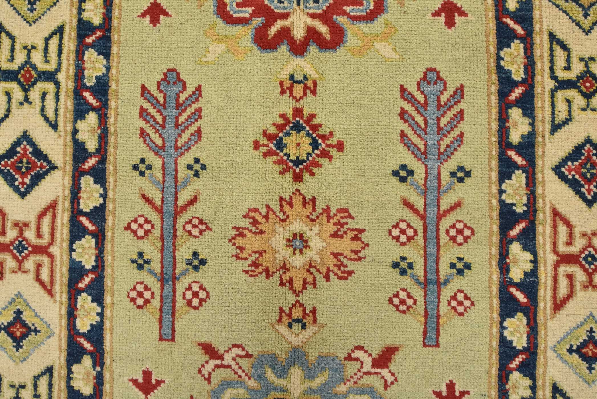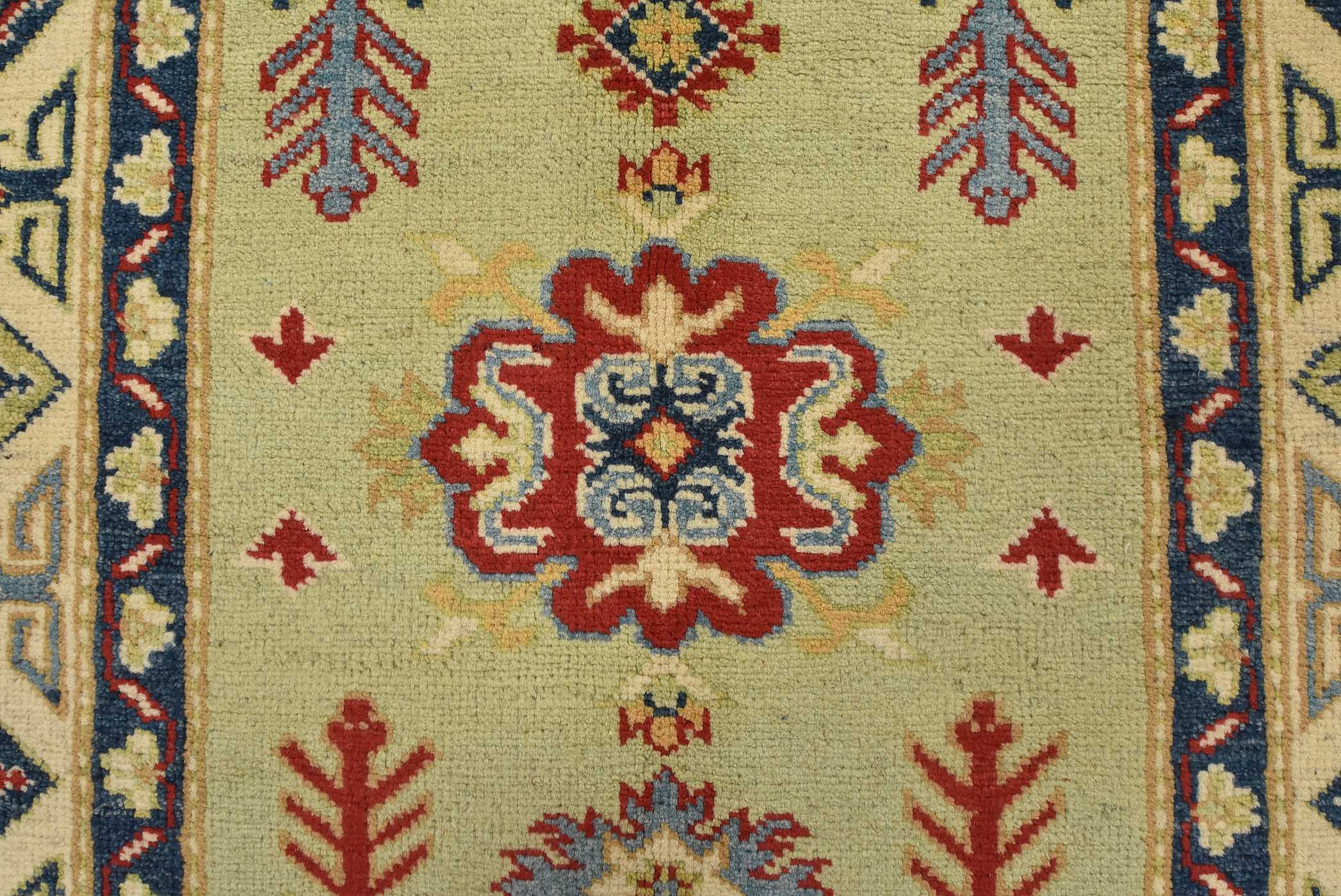 A tribal Caucasian Kazak runner hand-knotted with fine wool on a cotton foundation. This rug features medallions surrounded by geometric botanical motifs set against a light green background. It is new and in excellent condition.