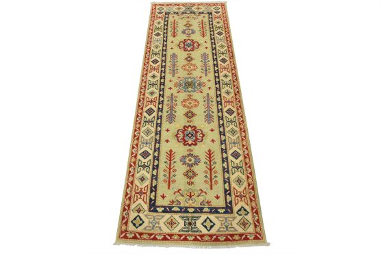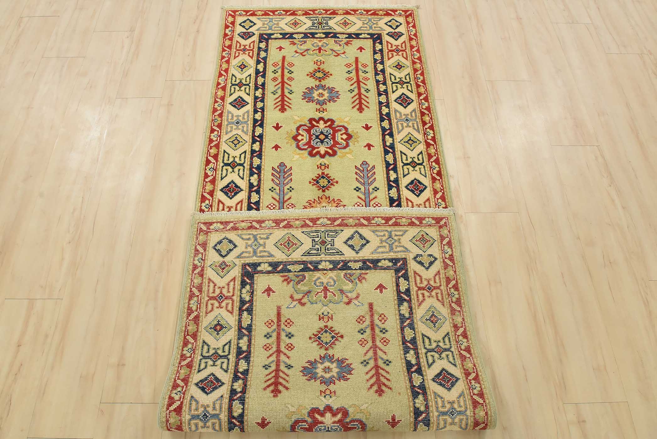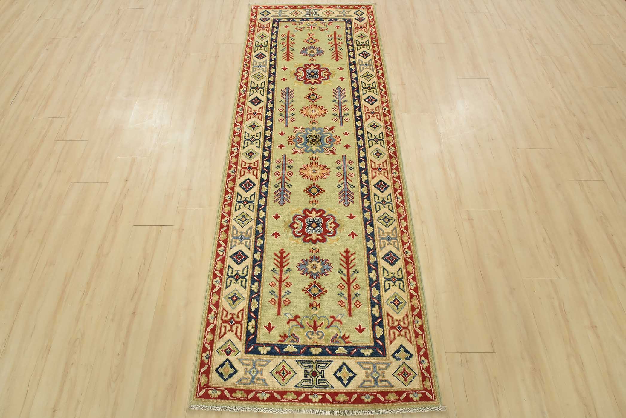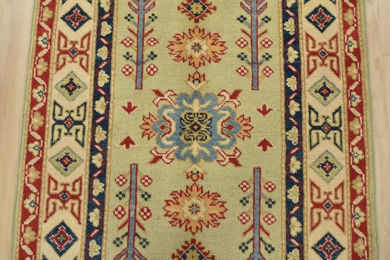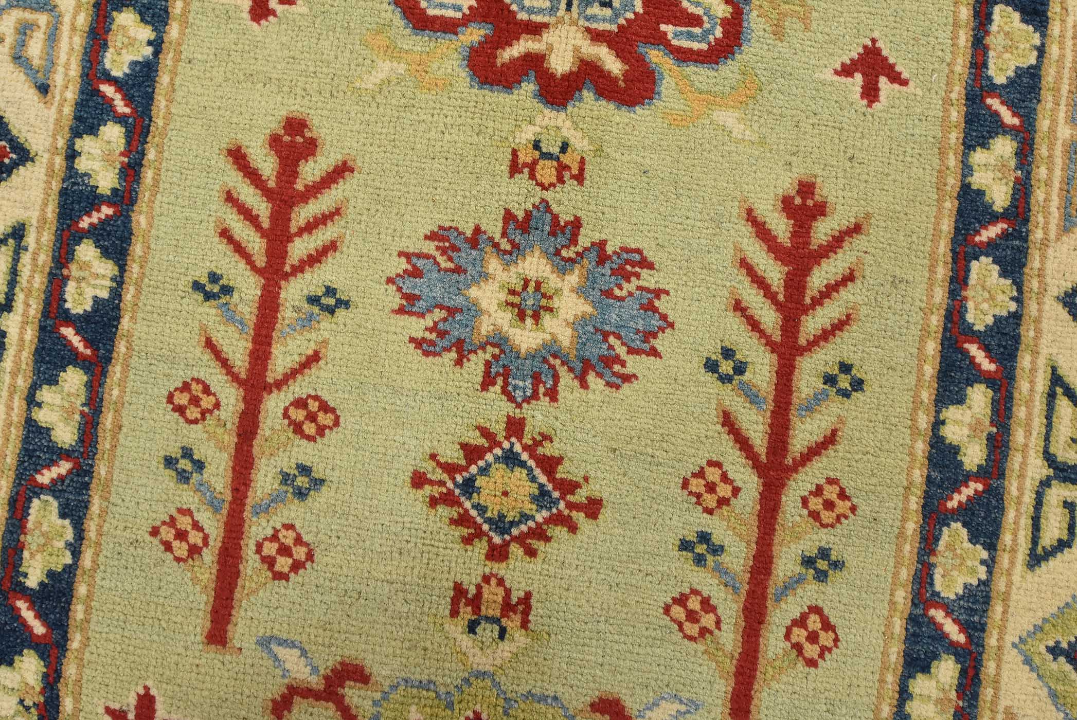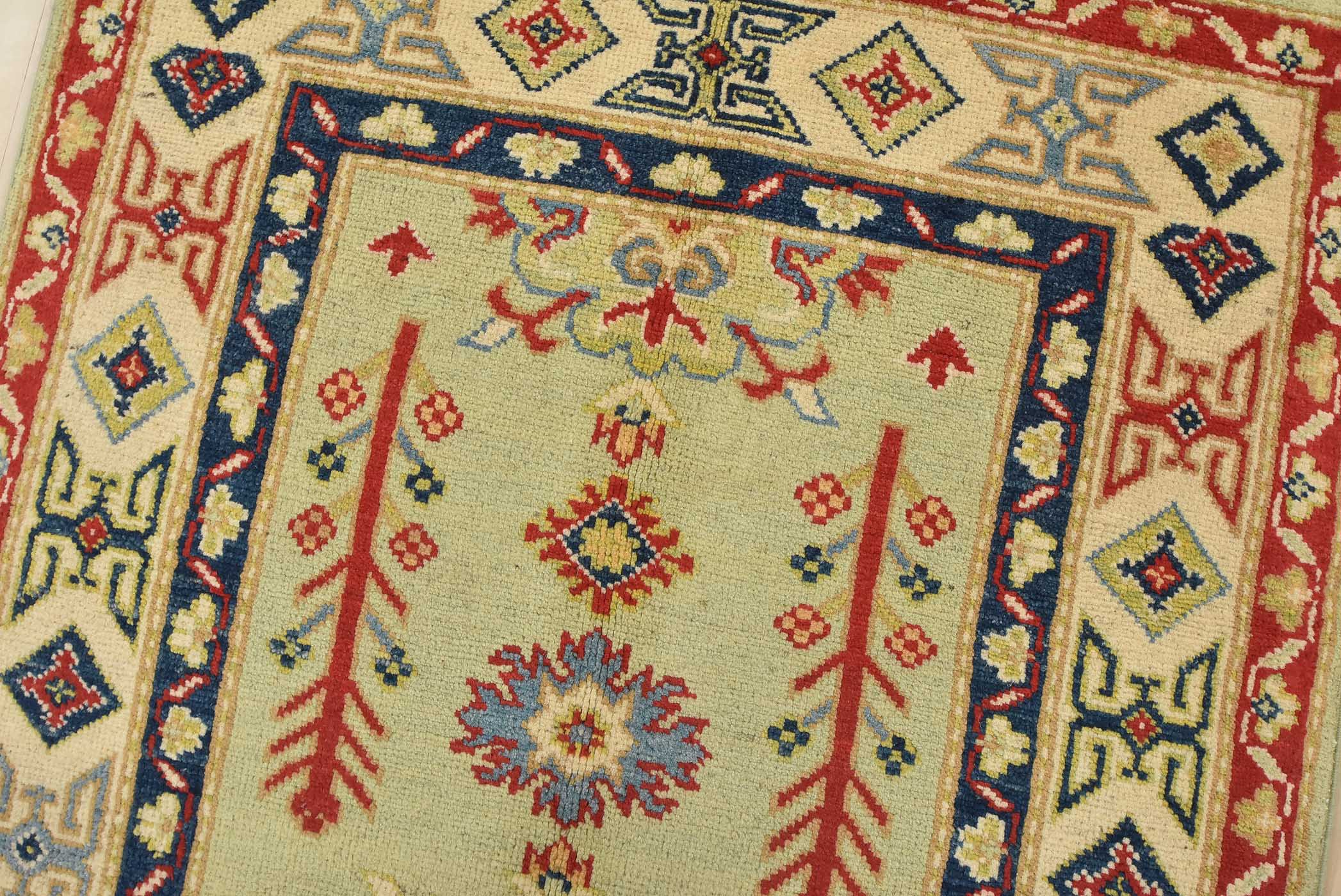 A tribal Caucasian Kazak runner hand-knotted with fine wool on a cotton foundation. This rug features medallions surrounded by geometric botanical motifs set against a light green background. It is new and in excellent condition.