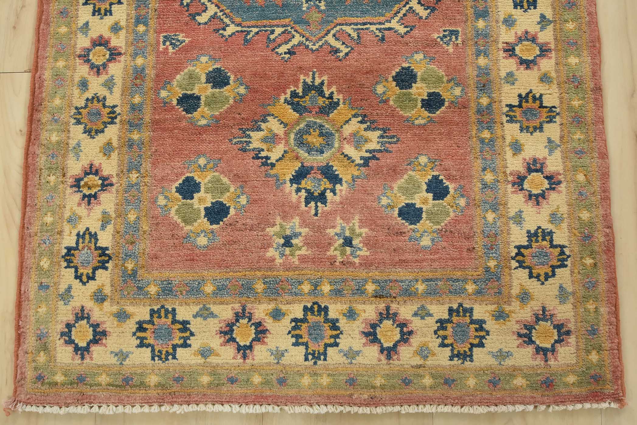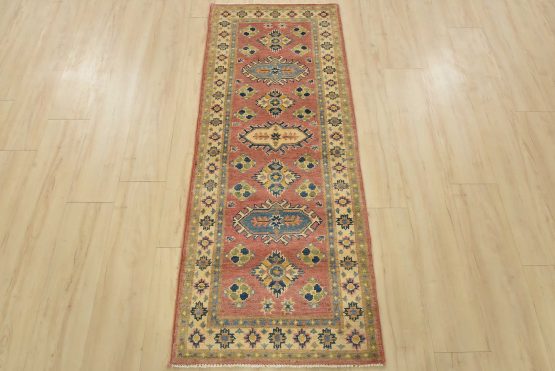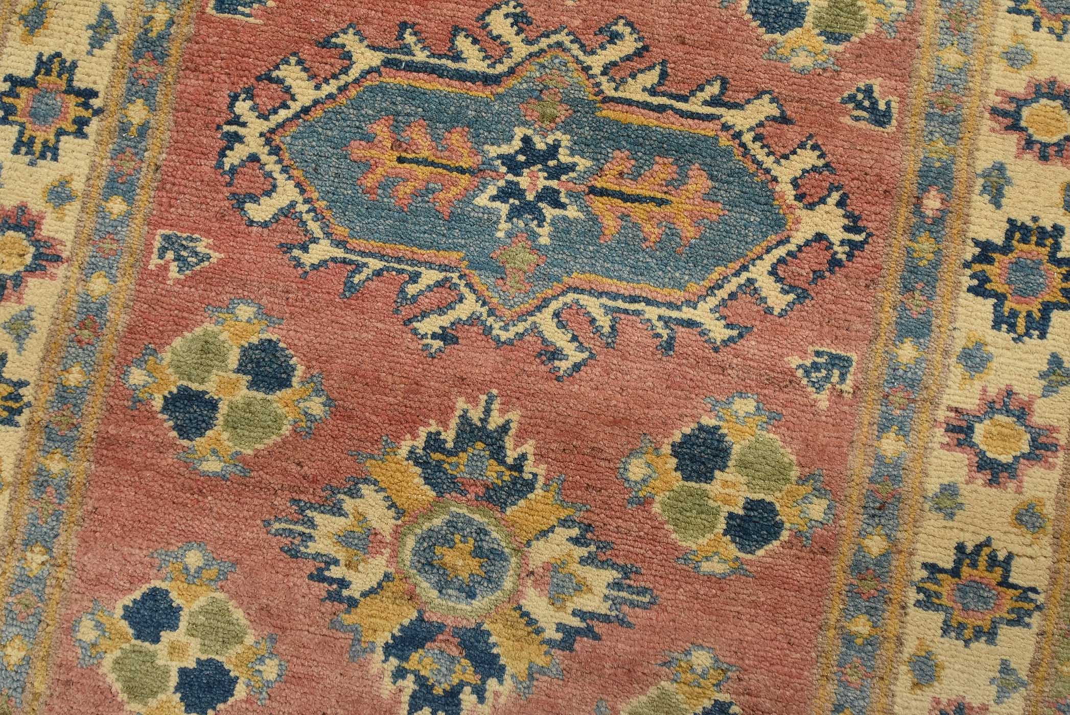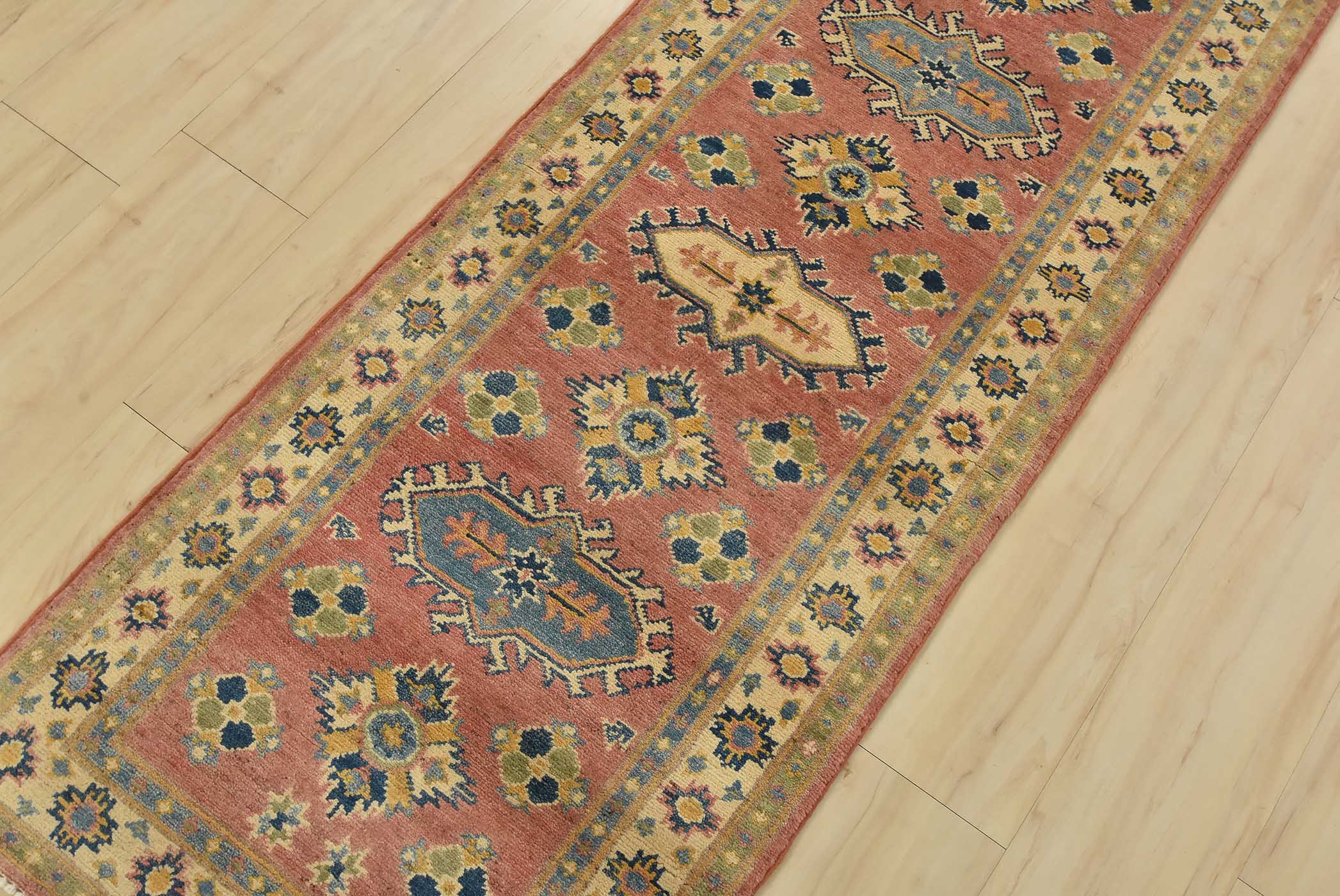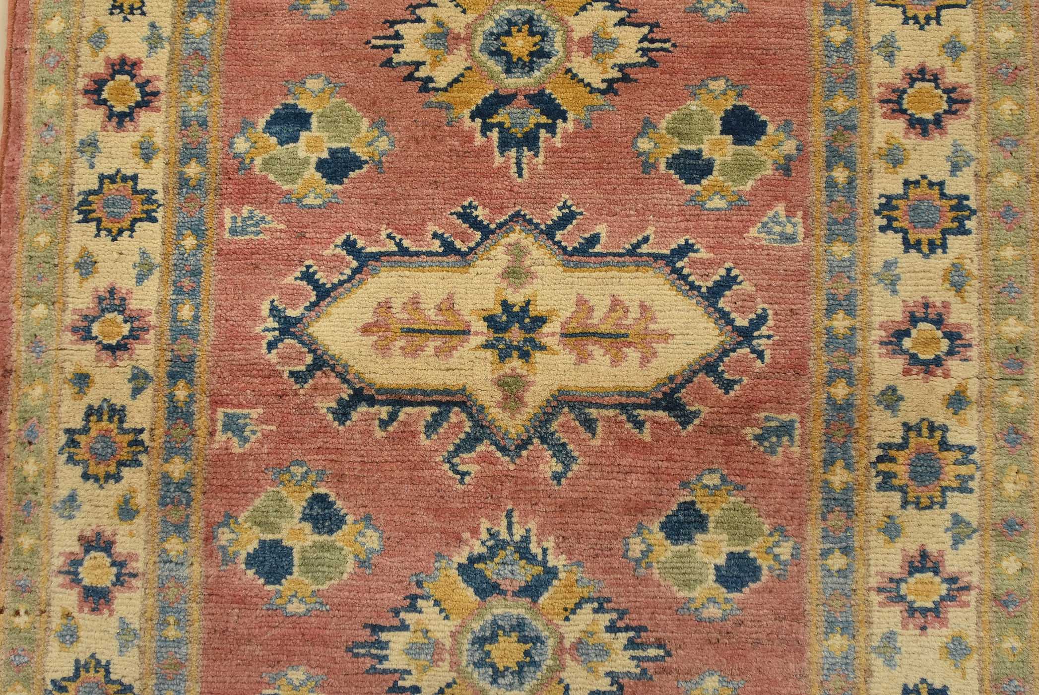 A tribal Caucasian Kazak runner hand-knotted with fine wool on a cotton foundation. This rug features geometric floral motifs set against a pink background. It is new and in excellent condition.