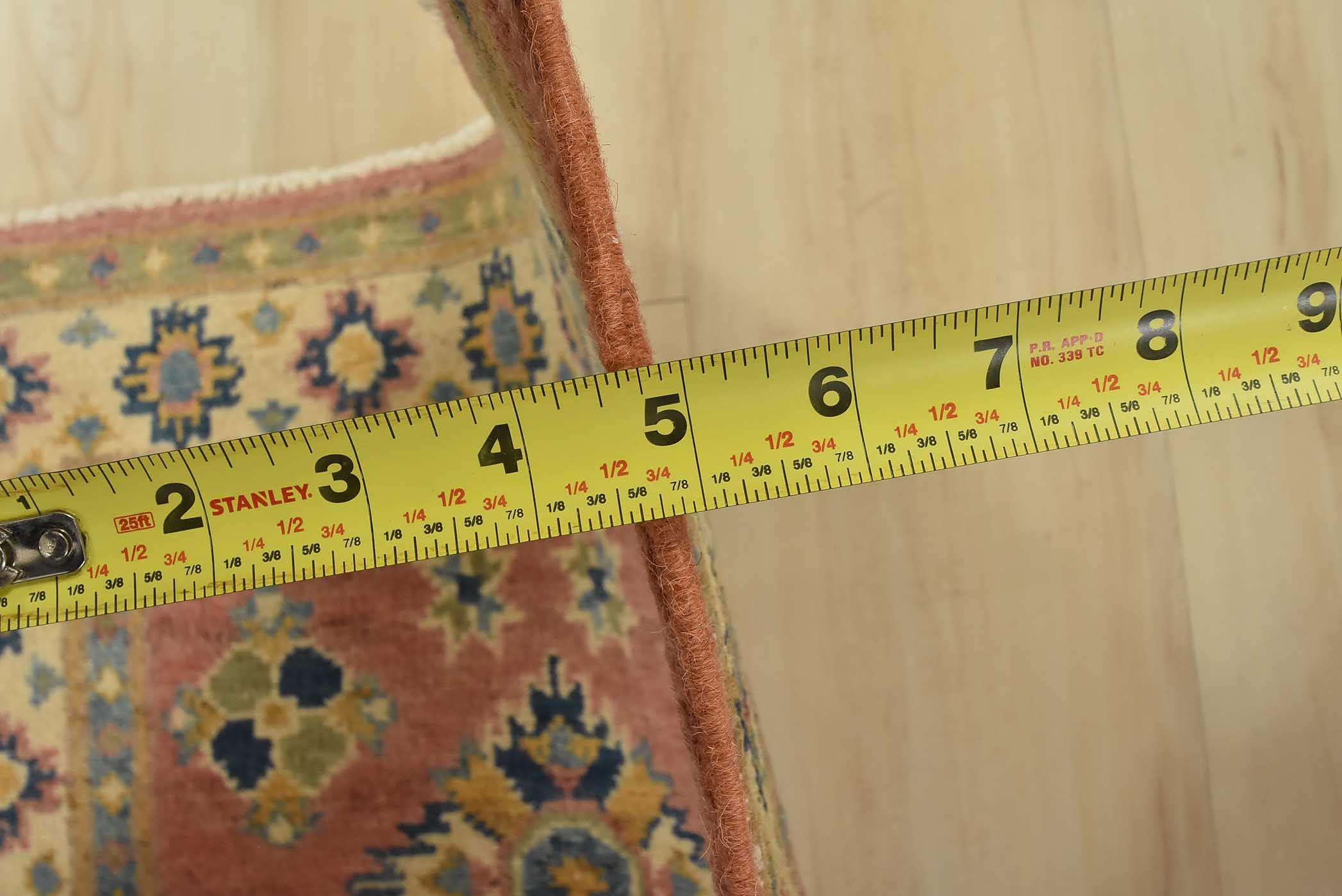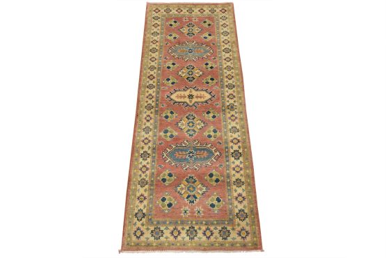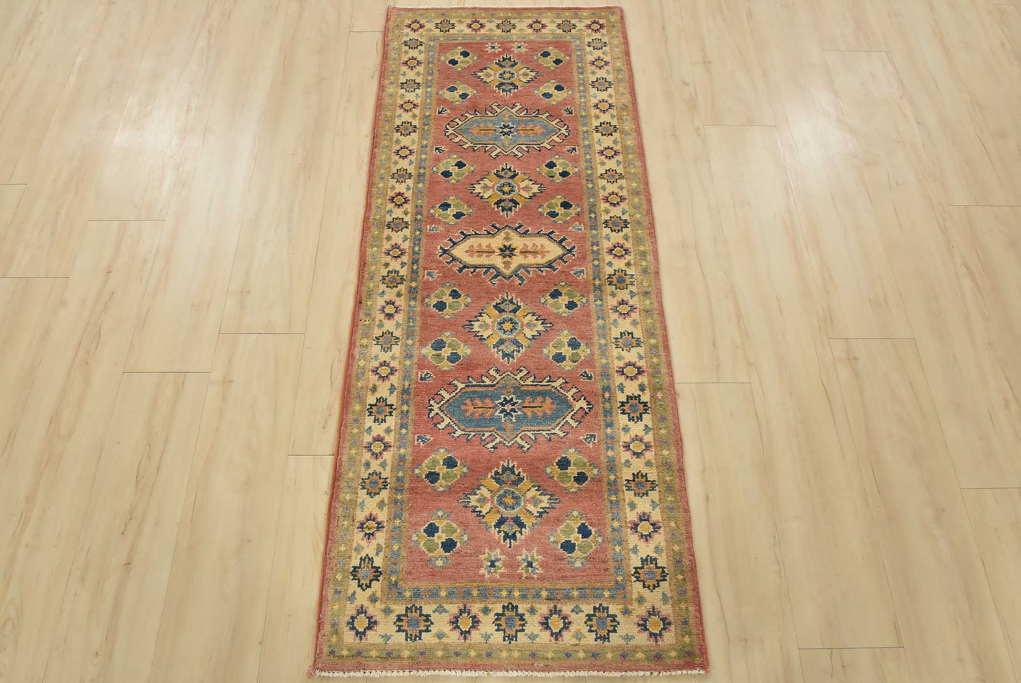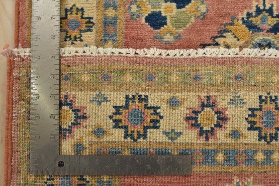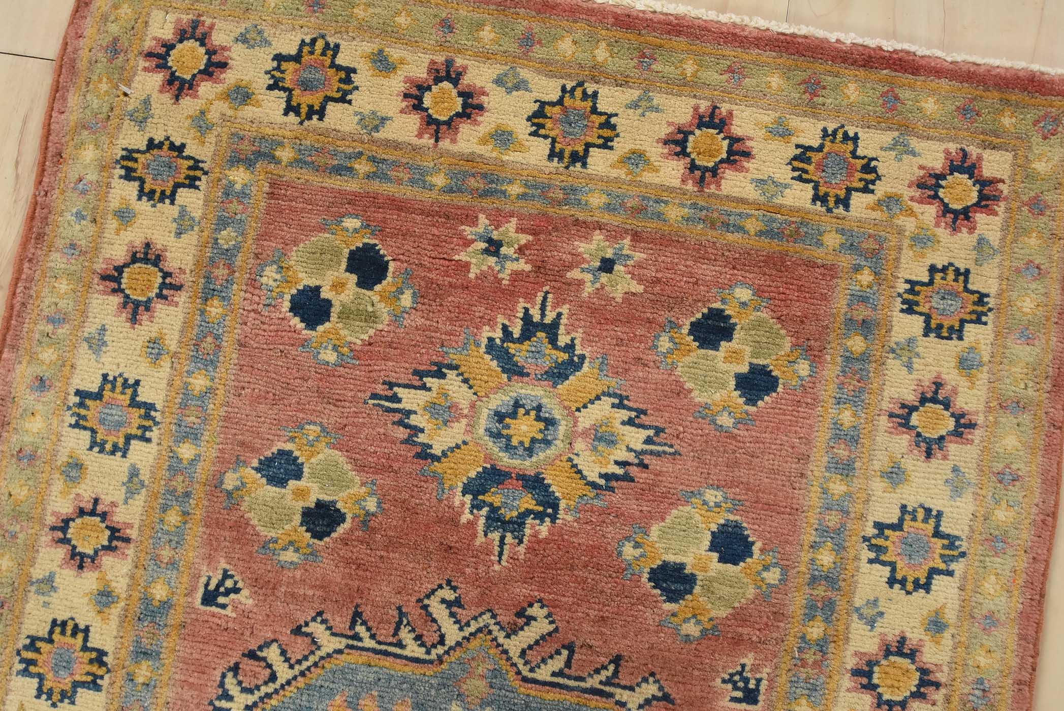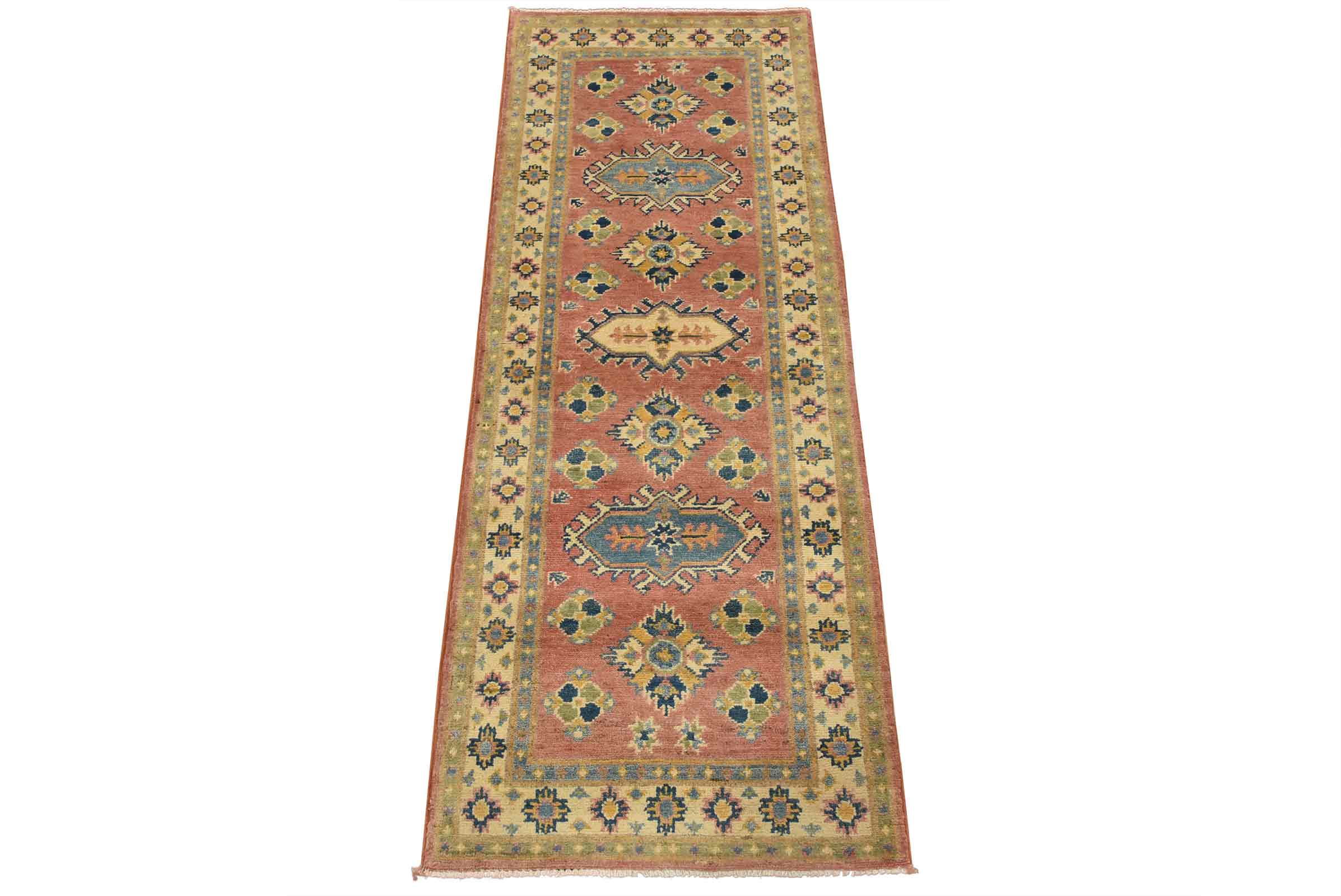 A tribal Caucasian Kazak runner hand-knotted with fine wool on a cotton foundation. This rug features geometric floral motifs set against a pink background. It is new and in excellent condition.