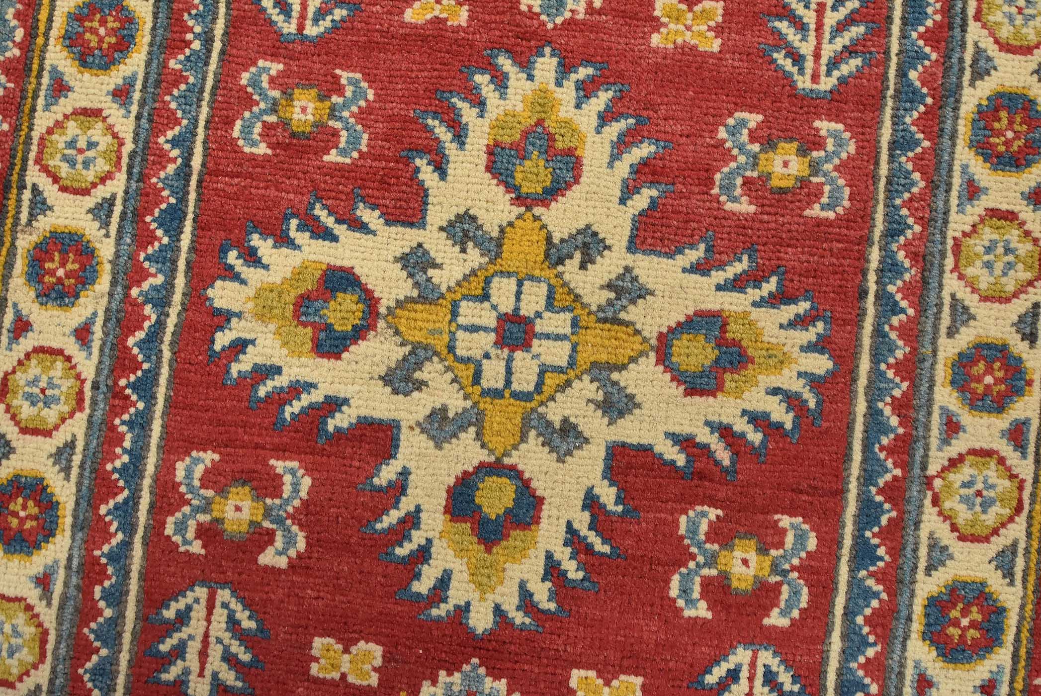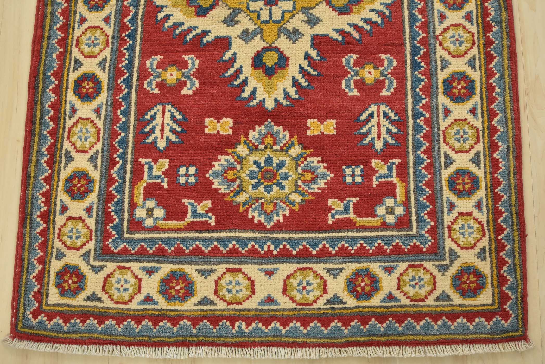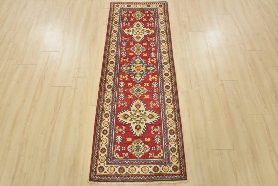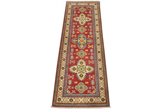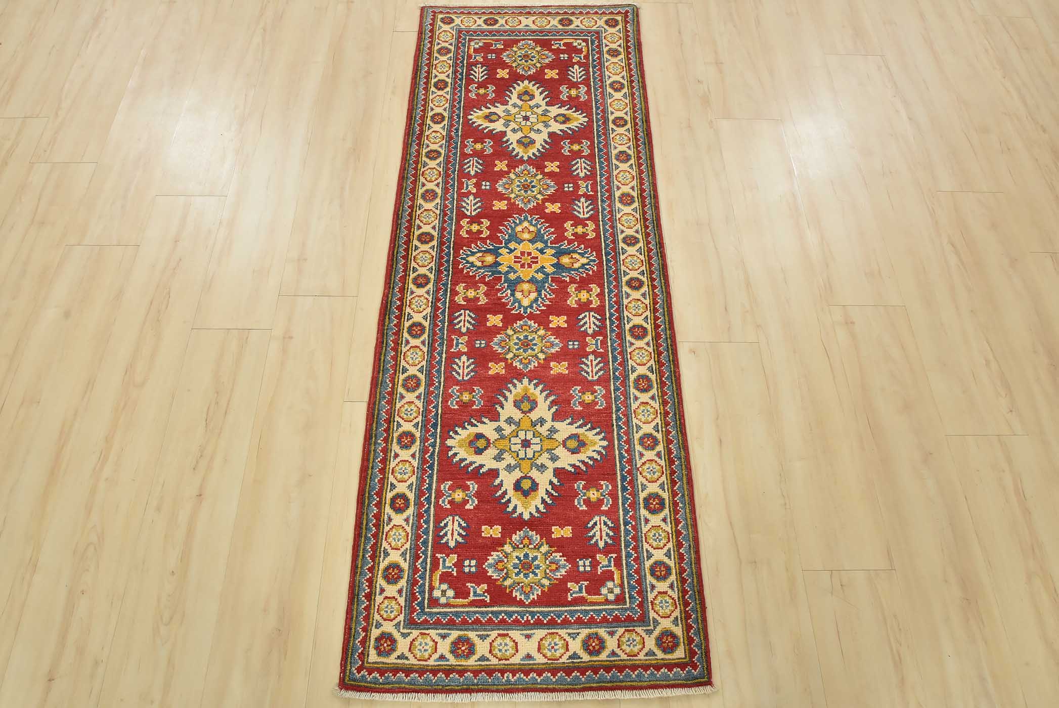 A tribal Caucasian Kazak runner hand-knotted with fine wool on a cotton foundation. This rug features geometric motifs set against a red background. It is new and in excellent condition.