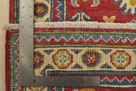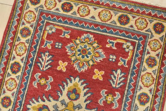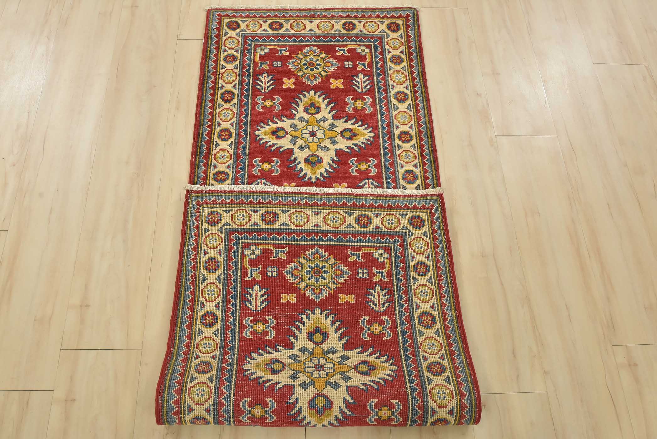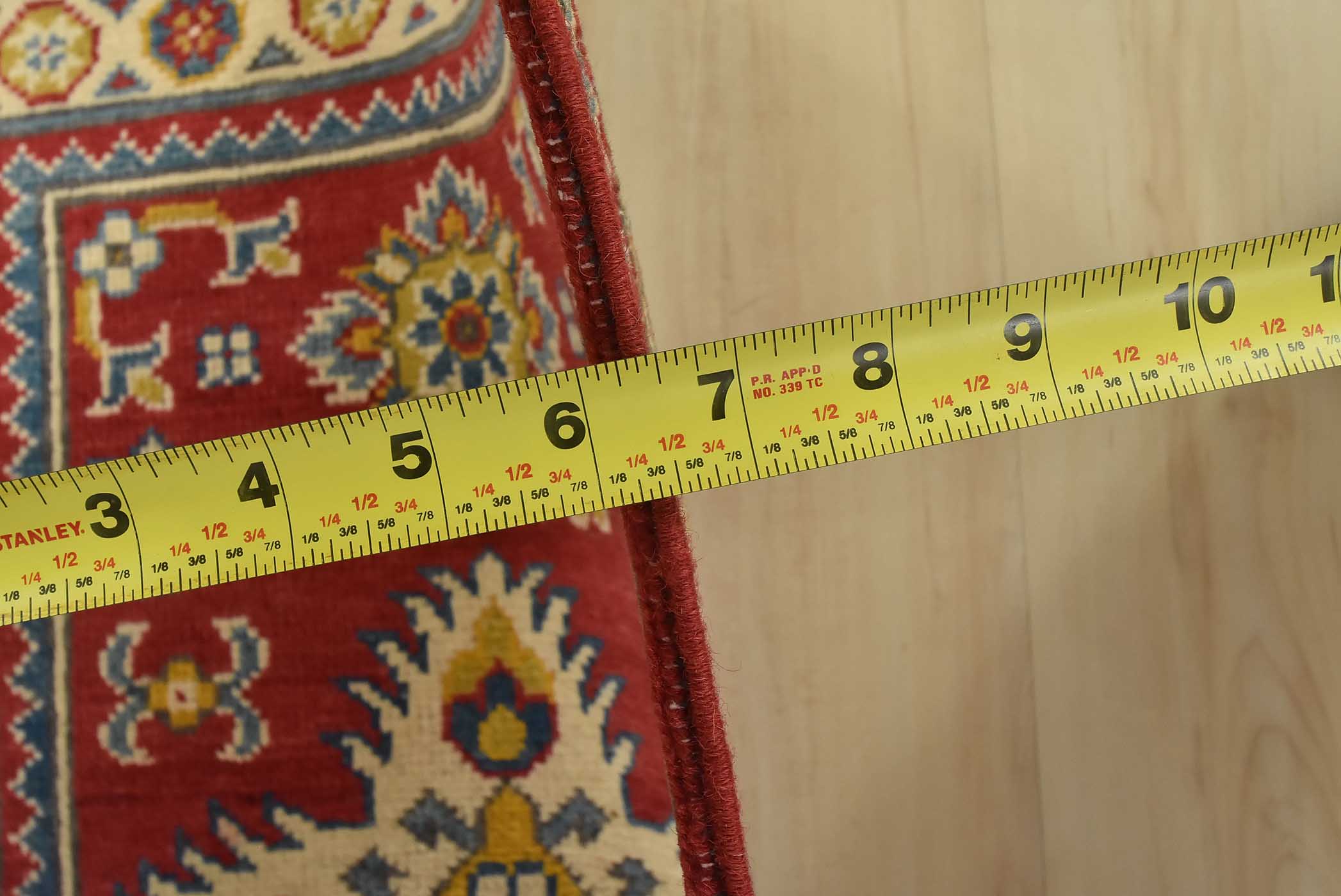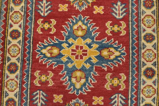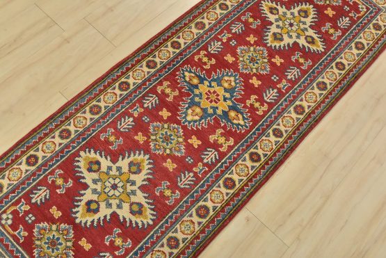 A tribal Caucasian Kazak runner hand-knotted with fine wool on a cotton foundation. This rug features geometric motifs set against a red background. It is new and in excellent condition.