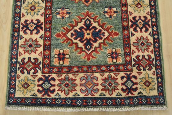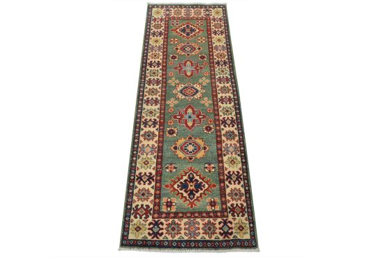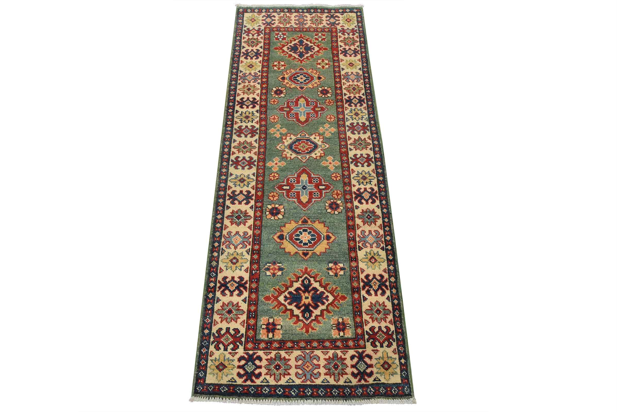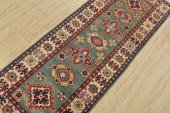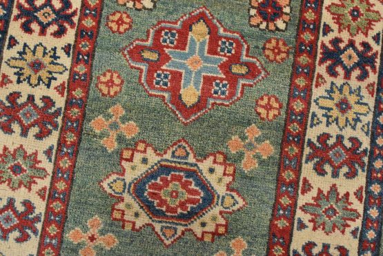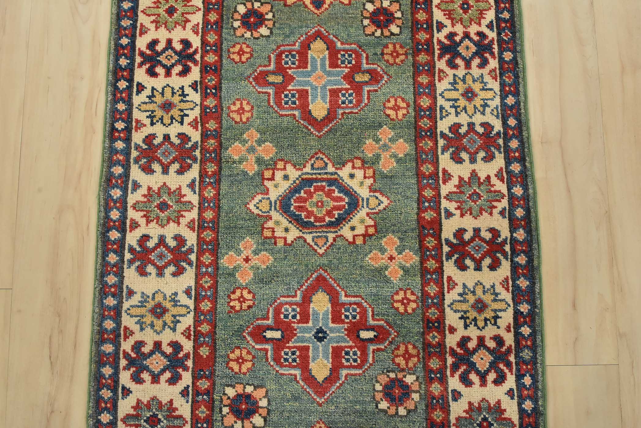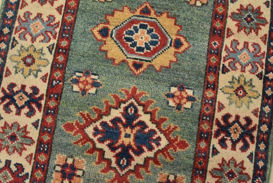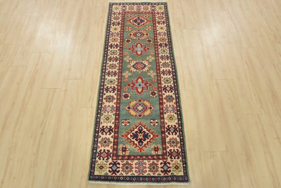 A tribal Caucasian Kazak runner hand-knotted with fine wool on a cotton foundation. This rug features a row of medallions surrounded by small geometric floral motifs set against a green background. It is new and in excellent condition.