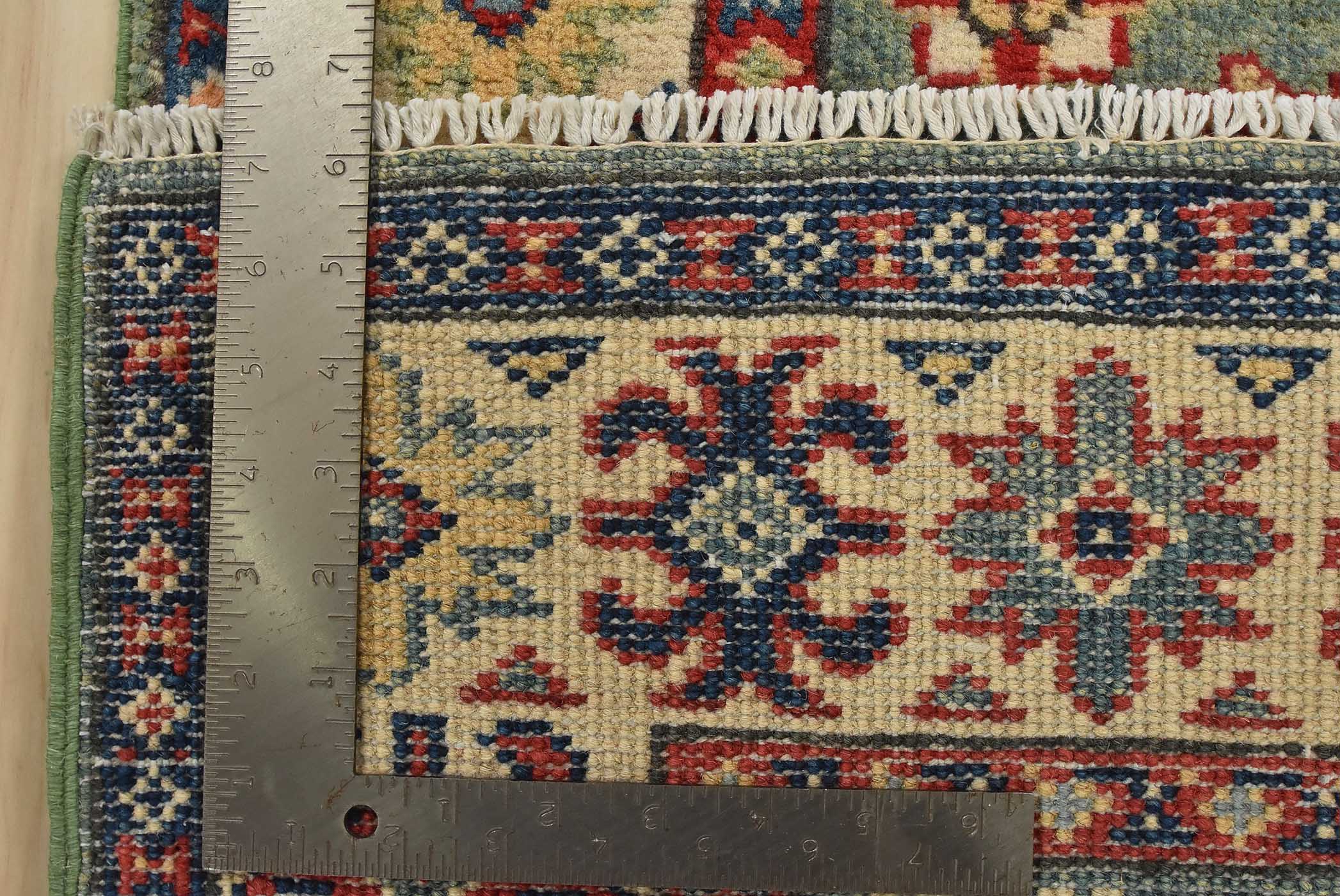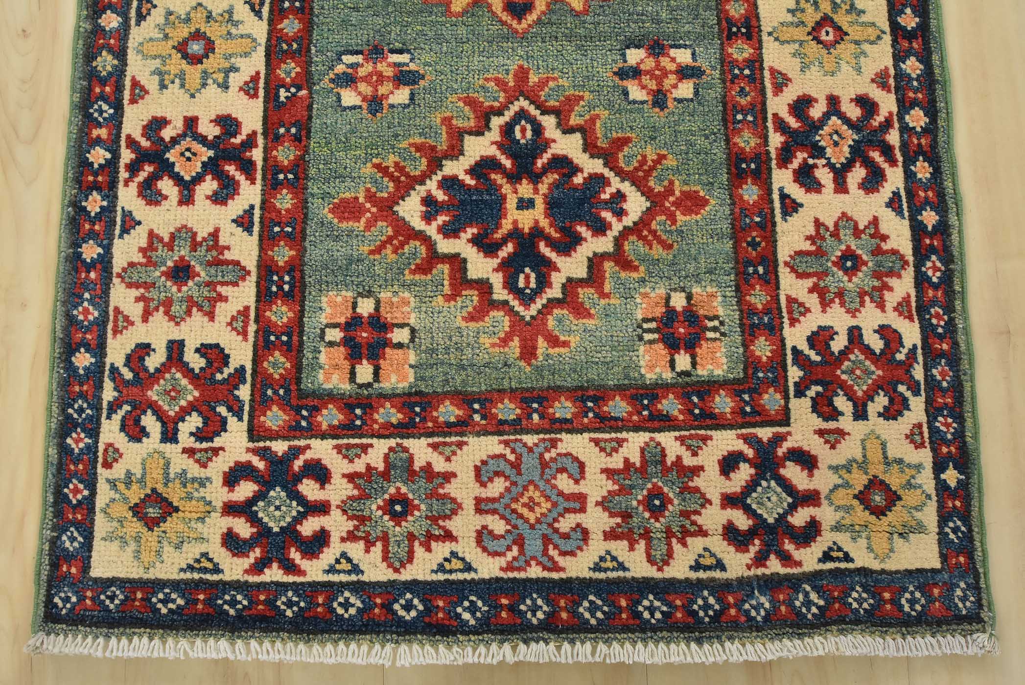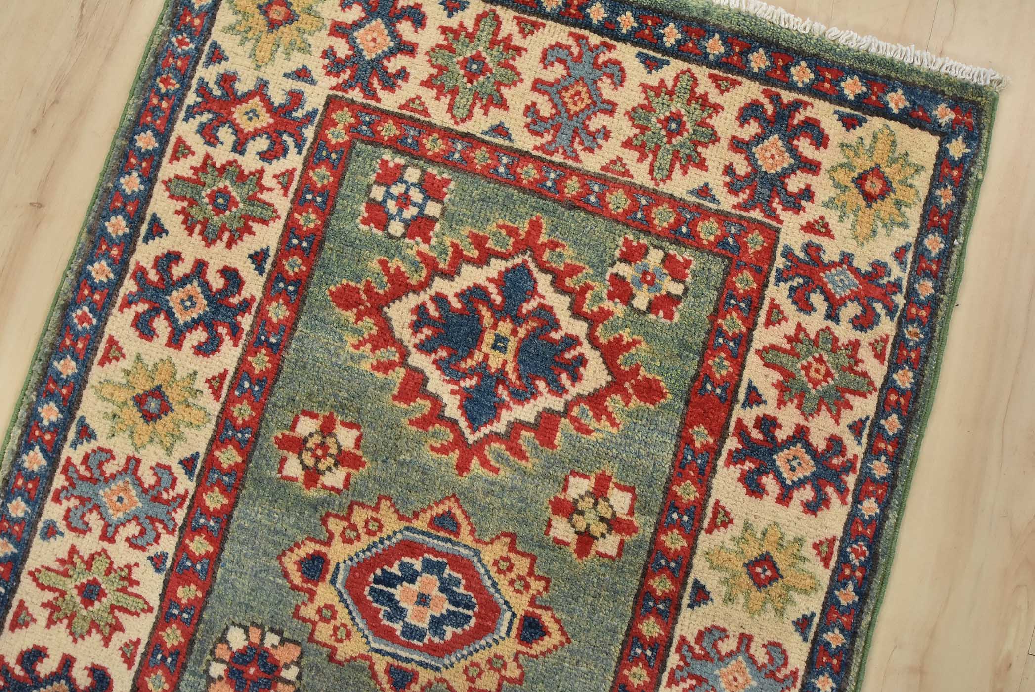 A tribal Caucasian Kazak runner hand-knotted with fine wool on a cotton foundation. This rug features a row of medallions surrounded by small geometric floral motifs set against a green background. It is new and in excellent condition.
