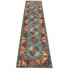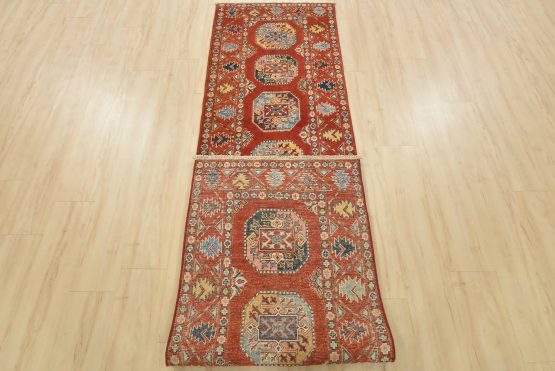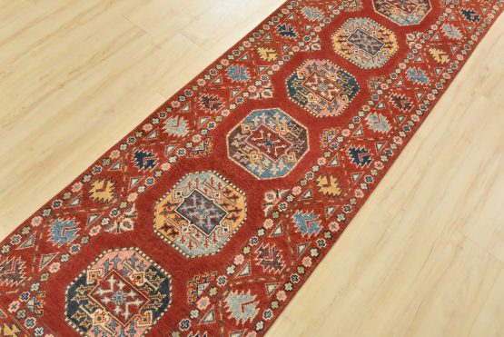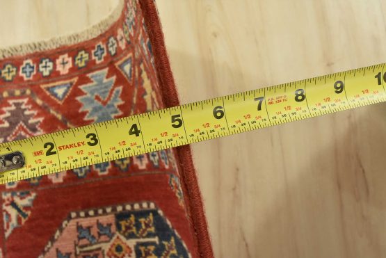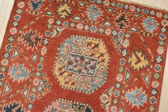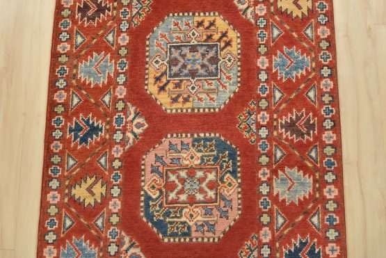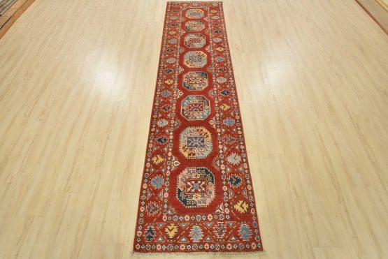 A tribal Caucasian Kazak runner hand-knotted with an all-wool pile on a cotton foundation. This oriental rug features a row of geometric medallions set against a red background. It is new and in excellent condition.