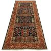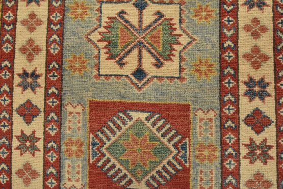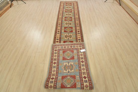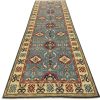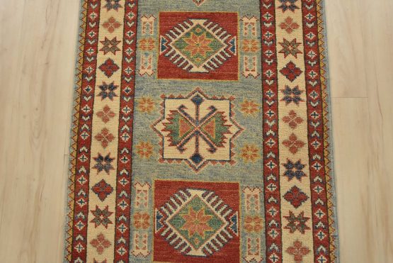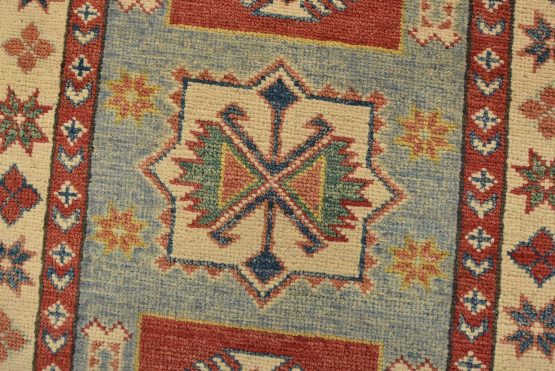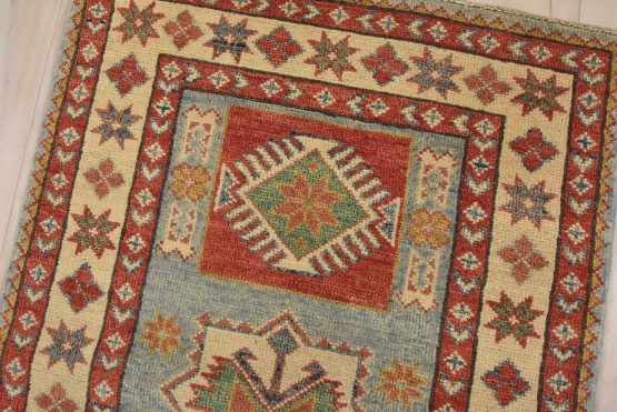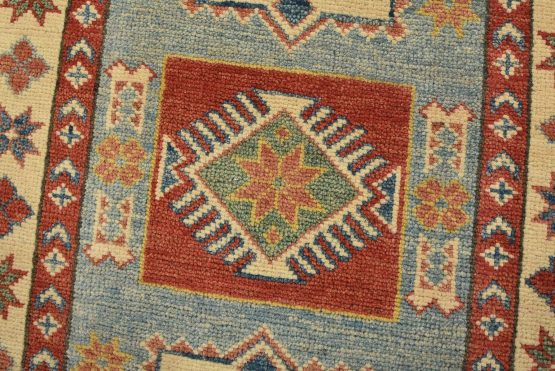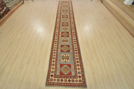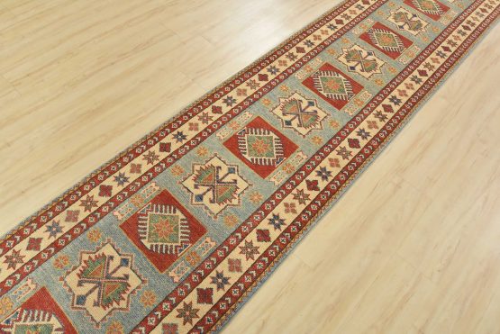 A tribal Caucasian Kazak runner hand-knotted with an all-wool pile on a cotton foundation. This oriental rug features a row of geometric medallions surrounded by geometric flowers set against a light blue background. It is new and in excellent condition.
