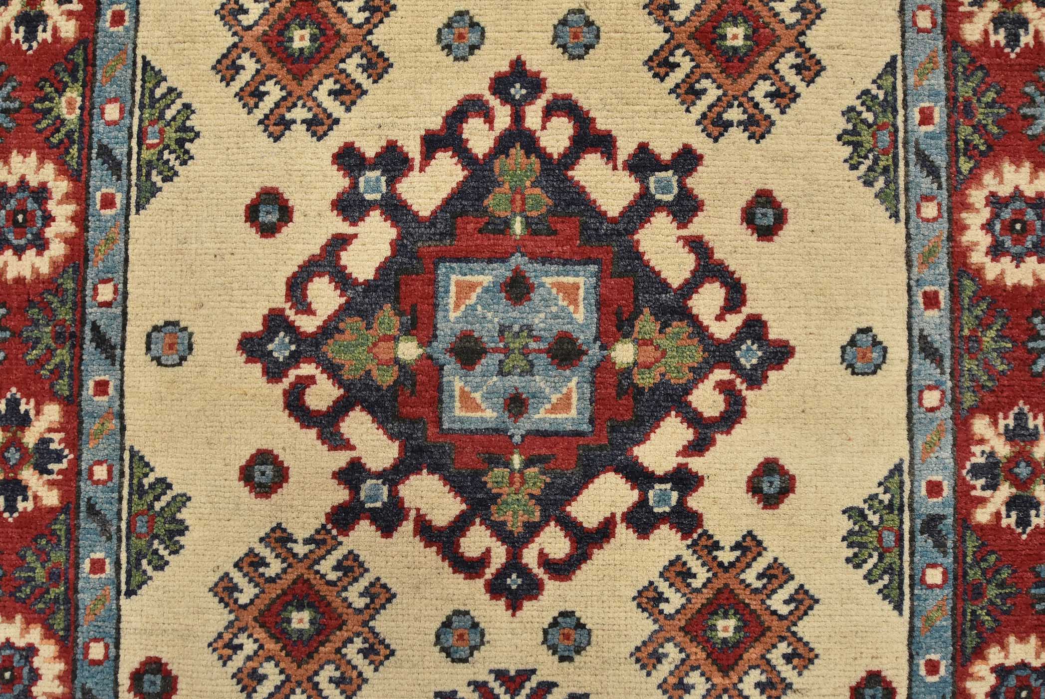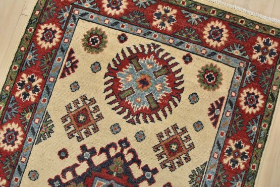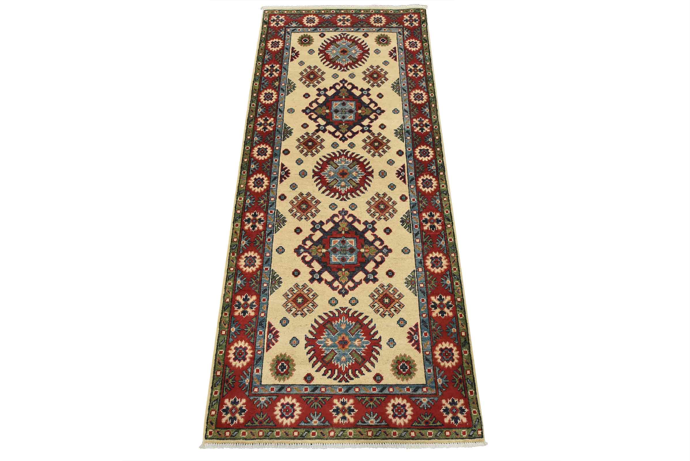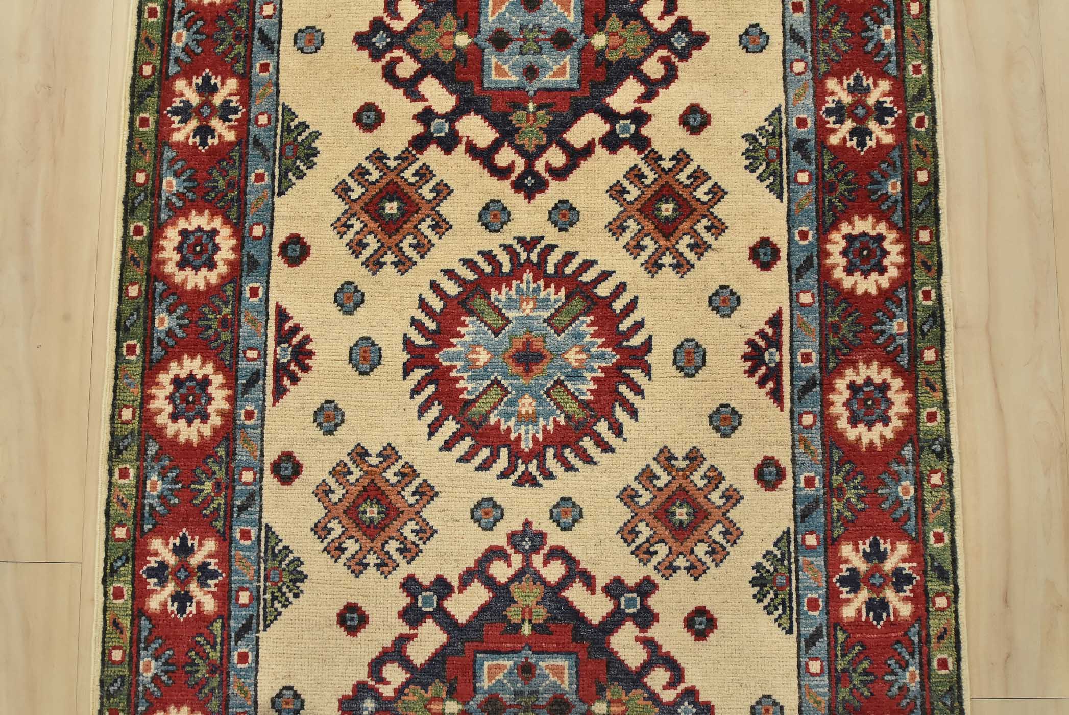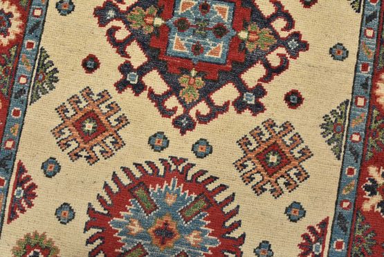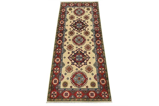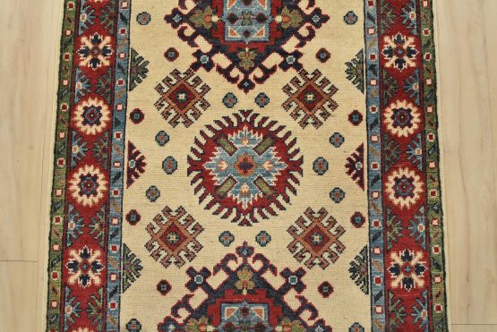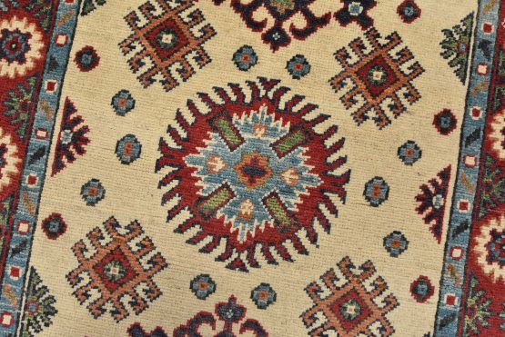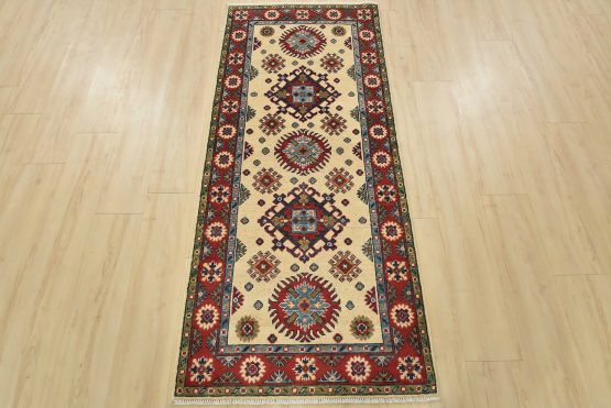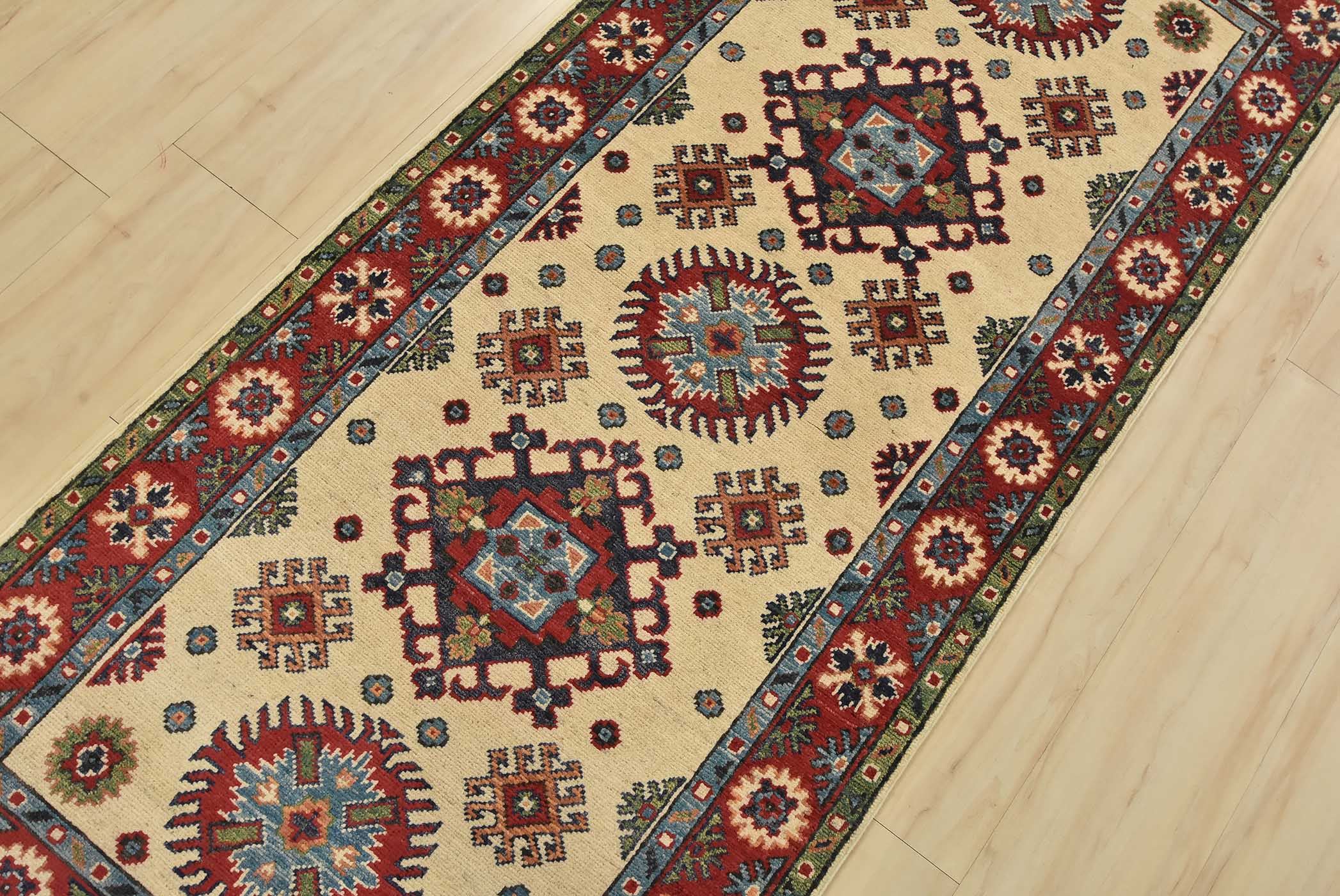 A tribal Caucasian Kazak runner hand-knotted with fine wool on a cotton foundation. This rug features a row of medallions surrounded by small geometric motifs set against a beige background. It is new and in excellent condition.