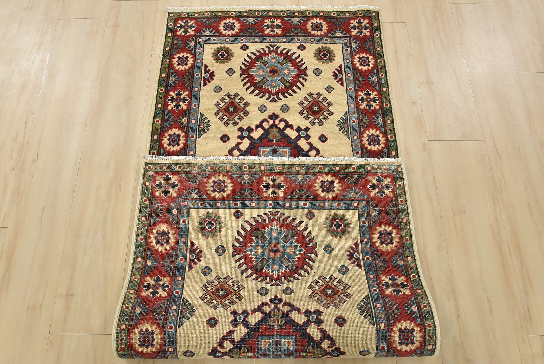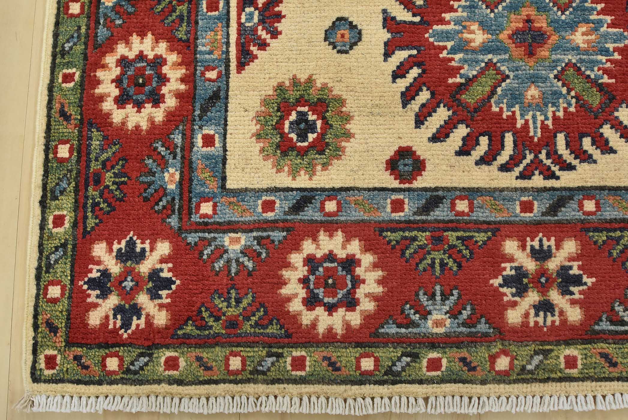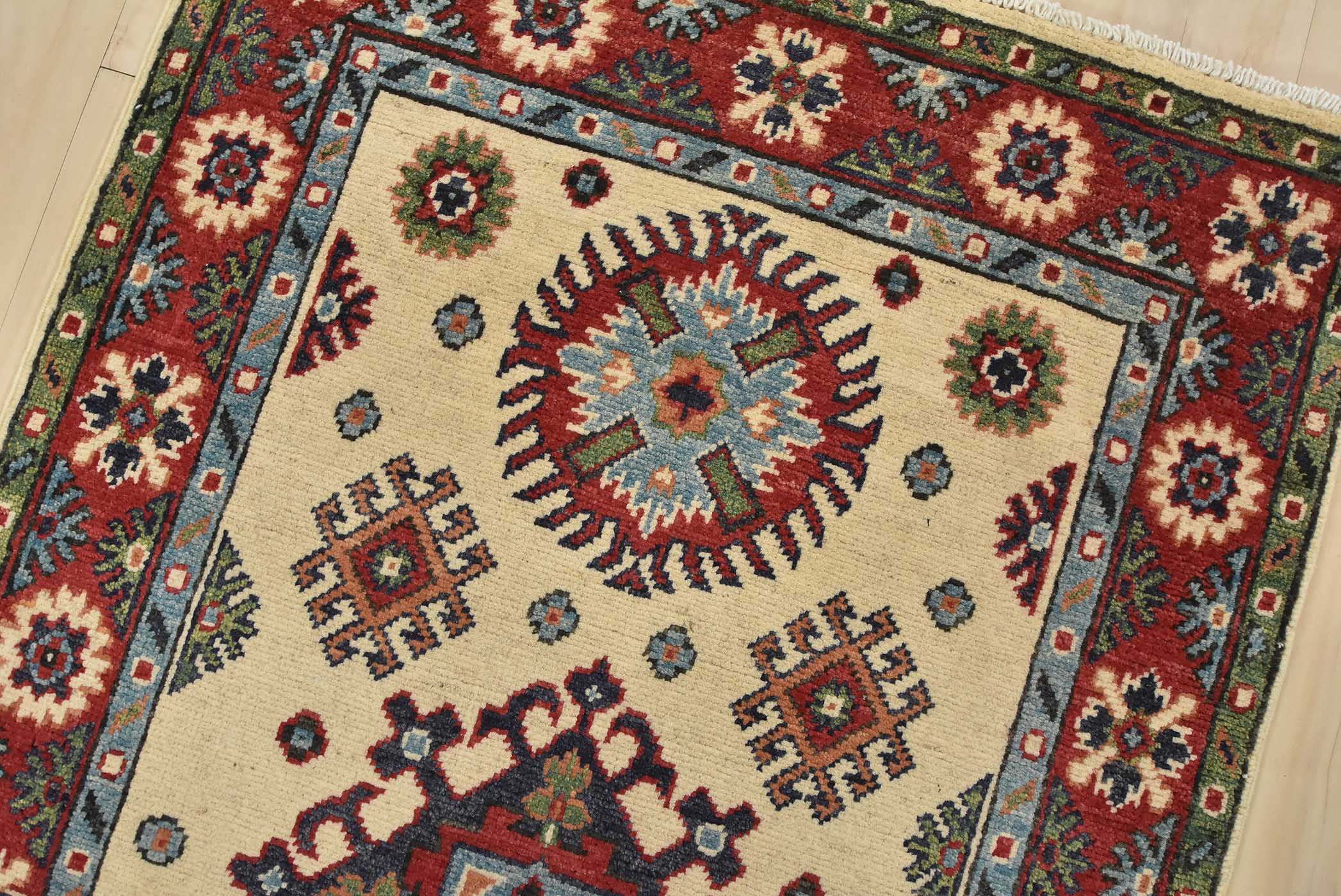 Original antique Kazak rugs from the Caucasus region inspire the creation of new Kazak rugs. These rugs are woven with fine wool using traditional Kazak patterns and finished with a low-cut pile to give them an authentic vintage look.
