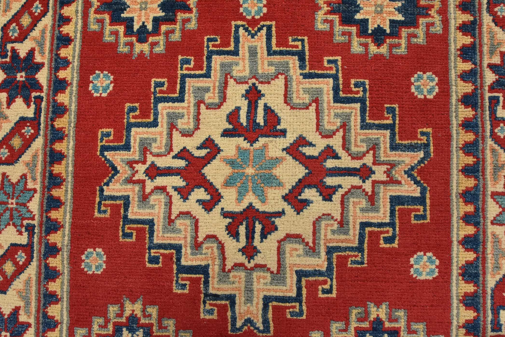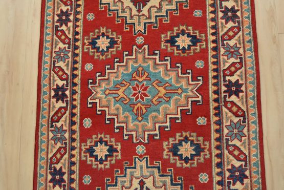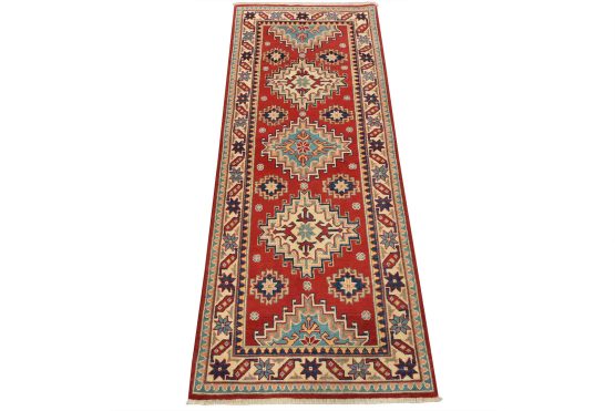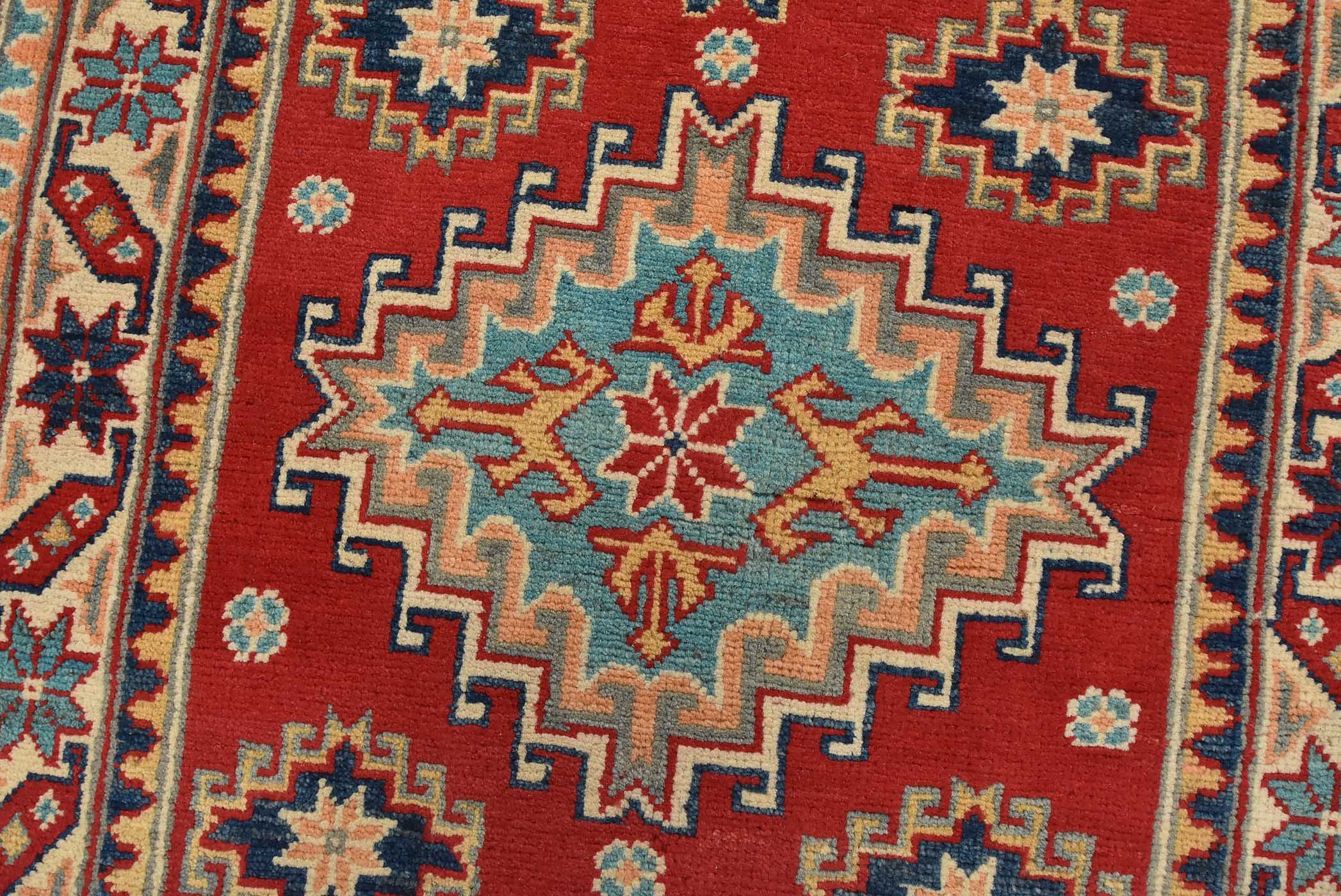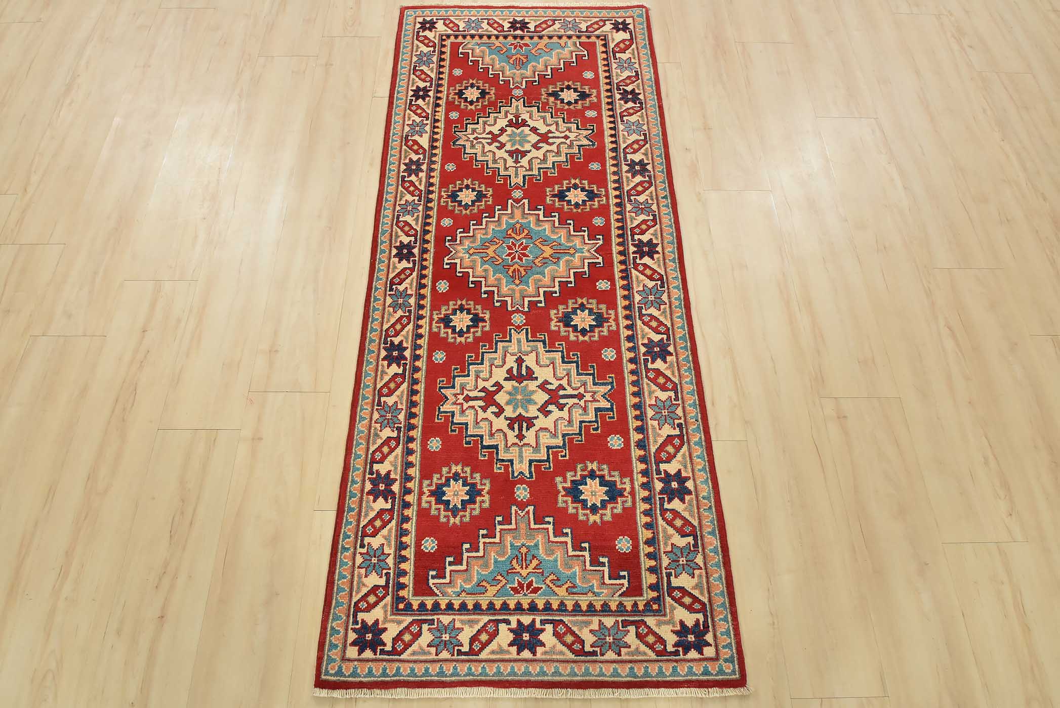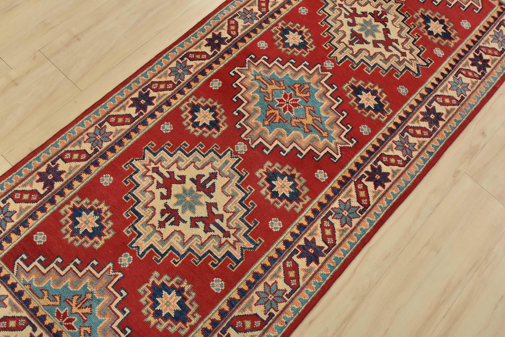 A tribal Caucasian Kazak runner hand-knotted with fine wool on a cotton foundation. This rug features a row of geometric medallions surrounded by small geometric motifs set against a red background. It is new and in excellent condition.