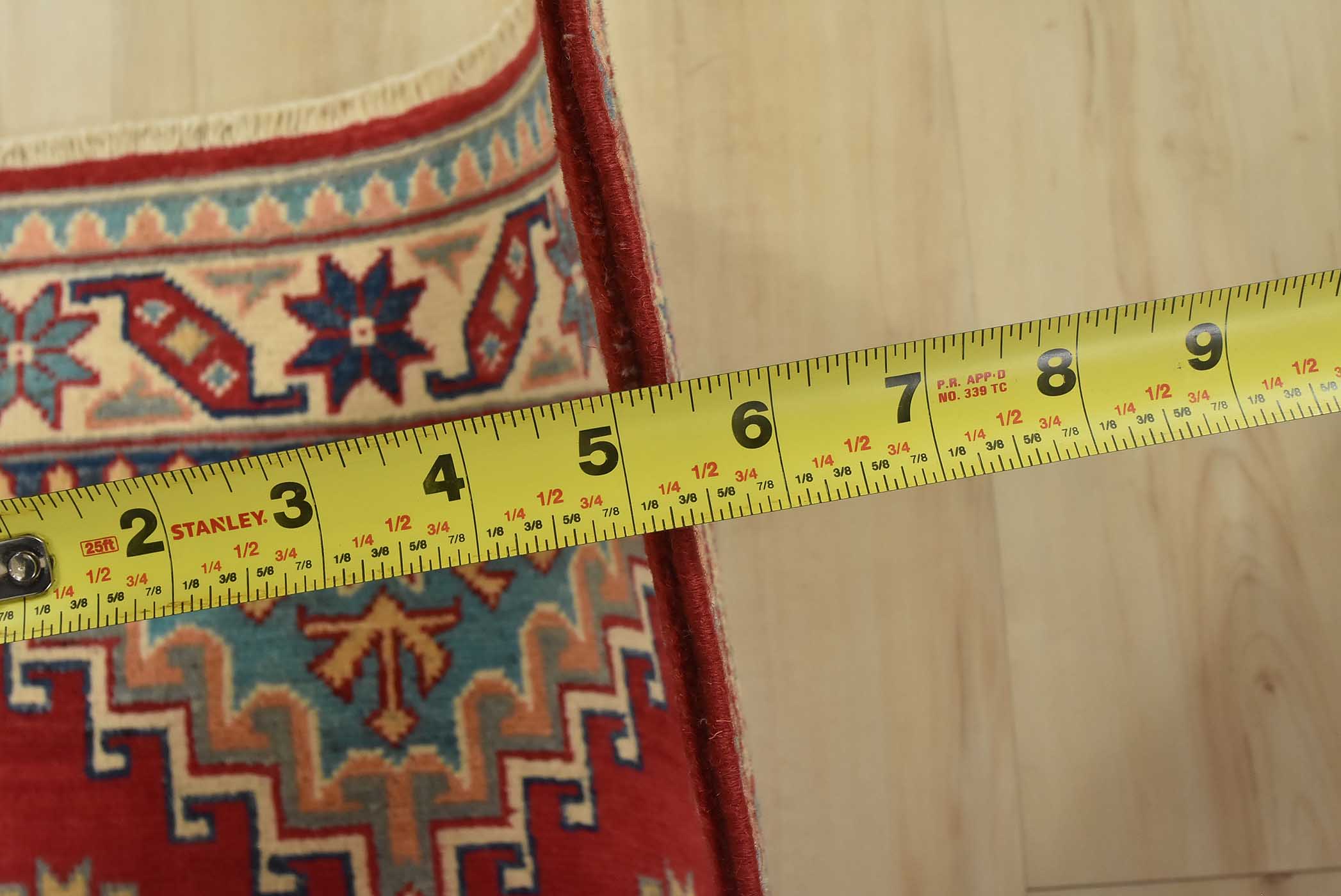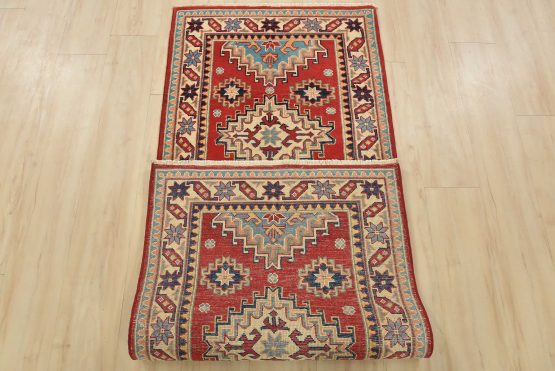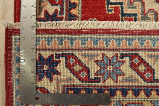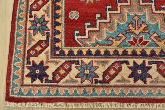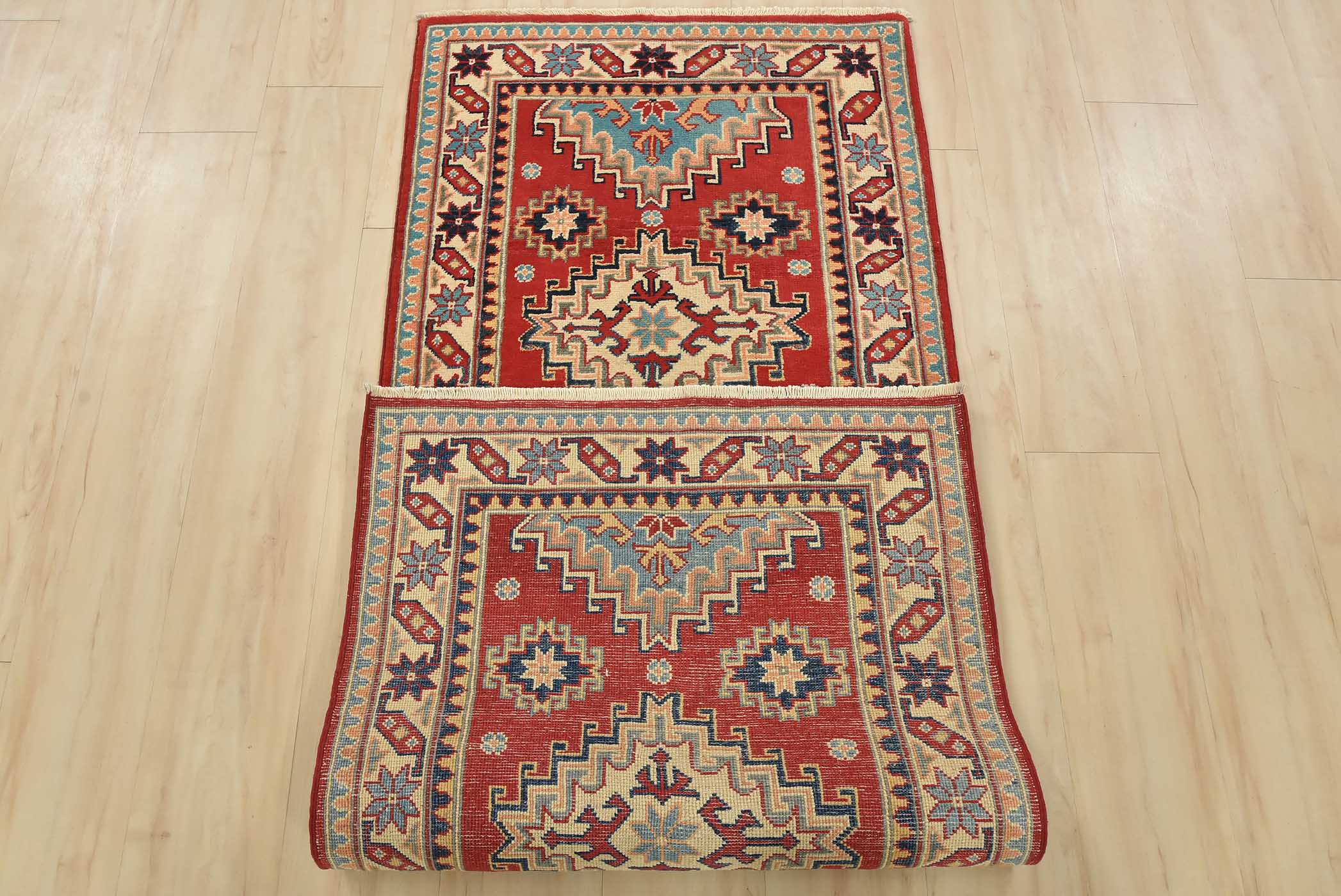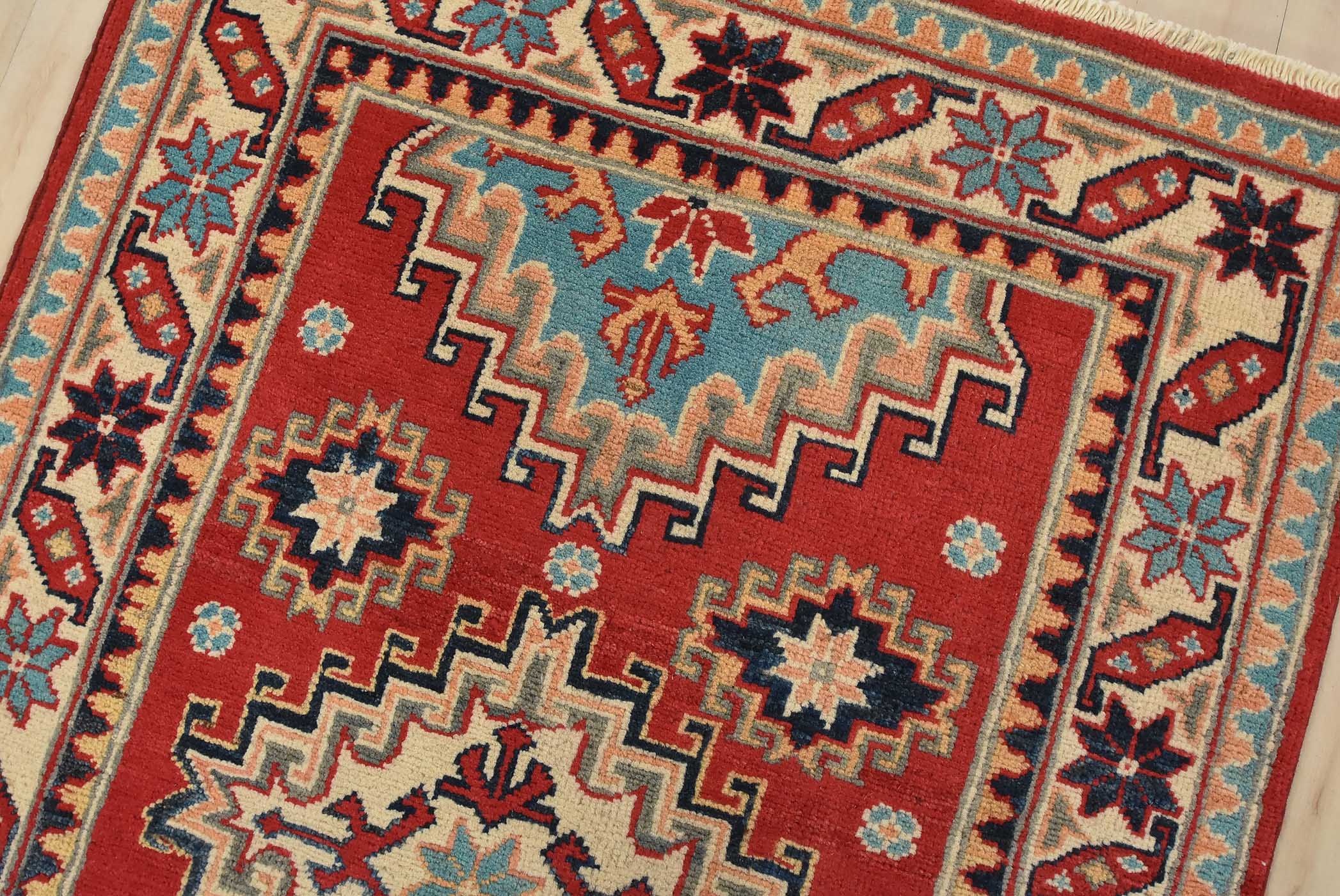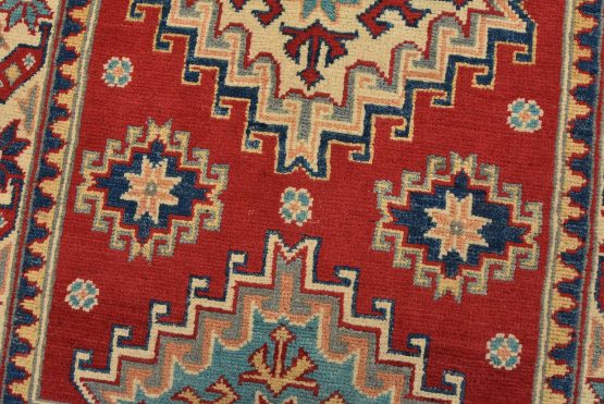 A tribal Caucasian Kazak runner hand-knotted with fine wool on a cotton foundation. This rug features a row of geometric medallions surrounded by small geometric motifs set against a red background. It is new and in excellent condition.