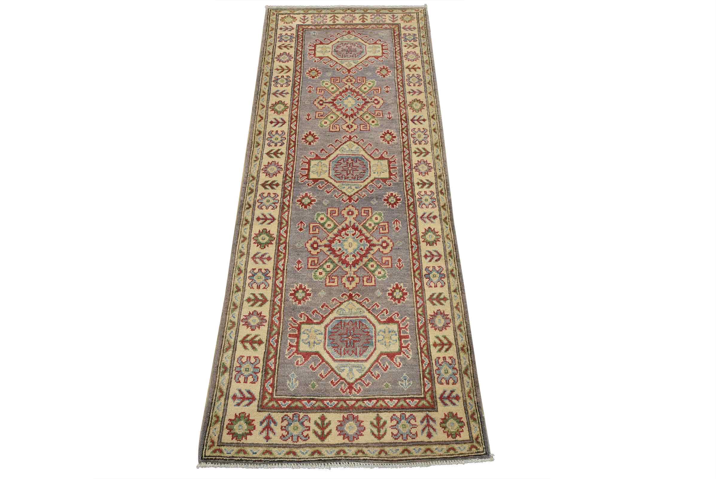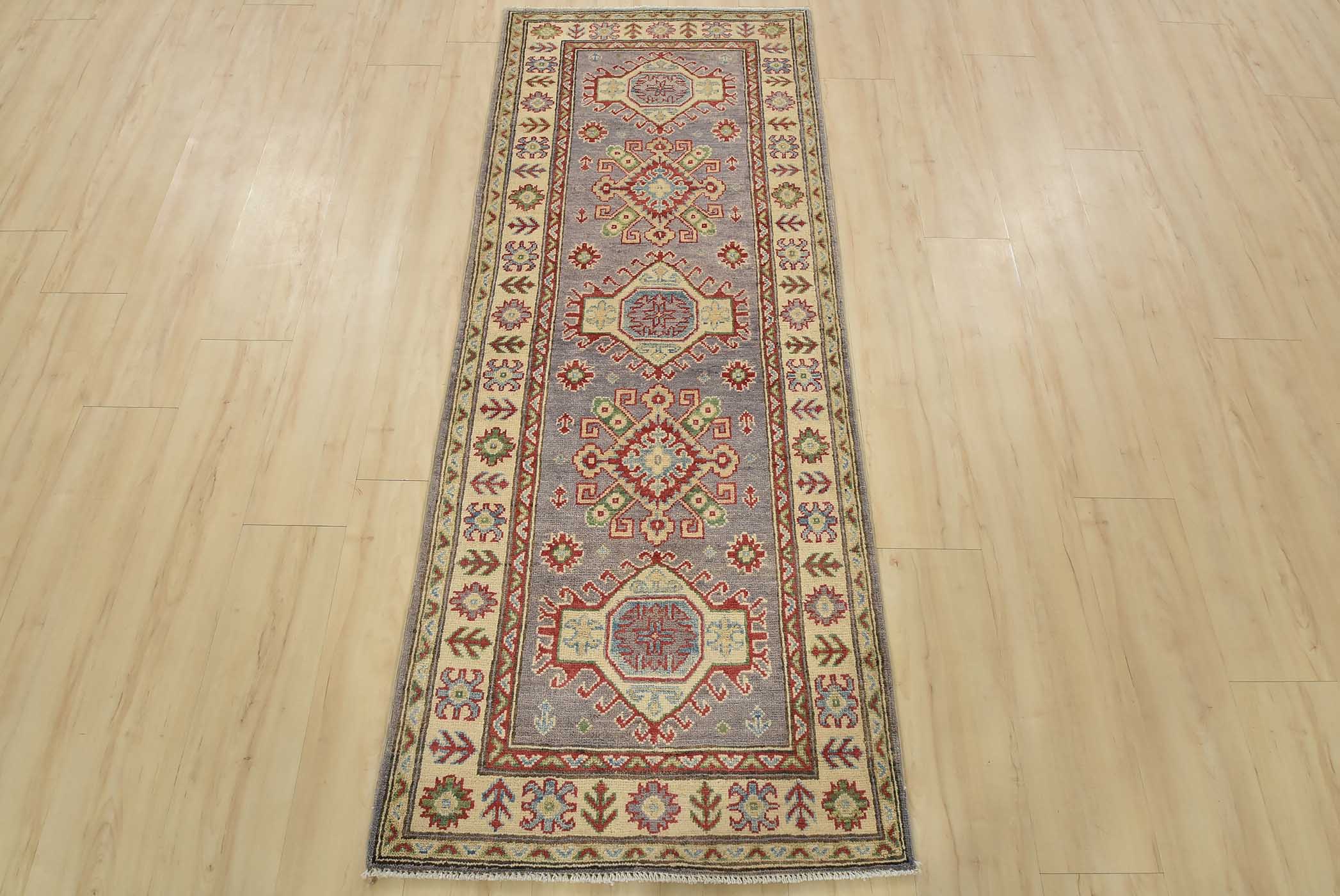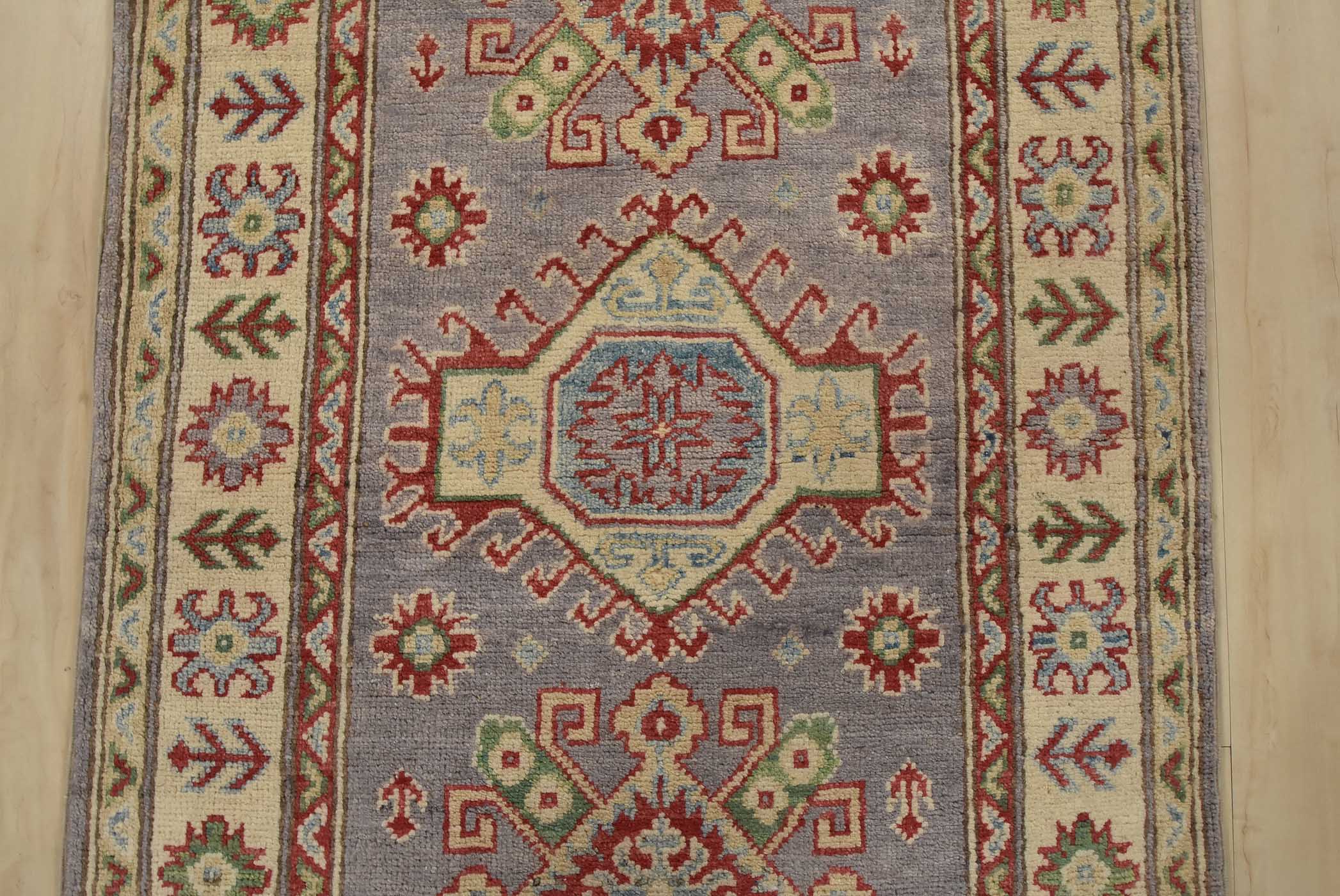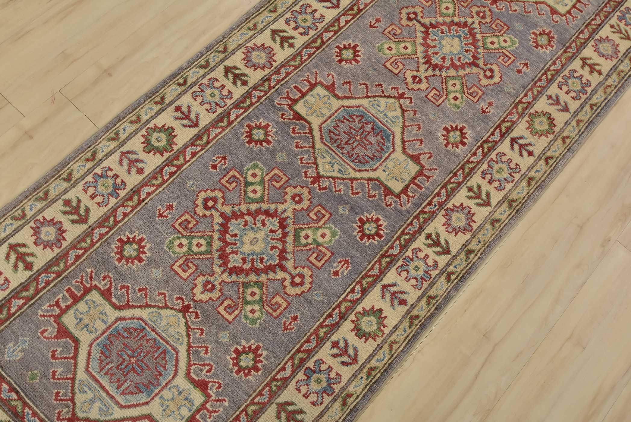 A tribal Caucasian Kazak runner hand-knotted with fine wool on a cotton foundation. This rug features a row of geometric medallions set against a lilac background. It is new and in excellent condition.