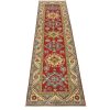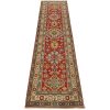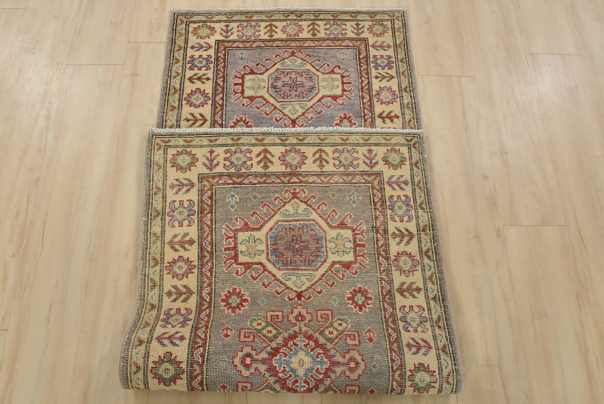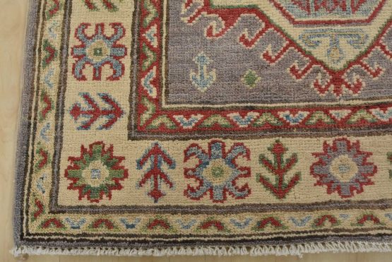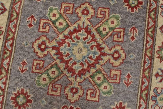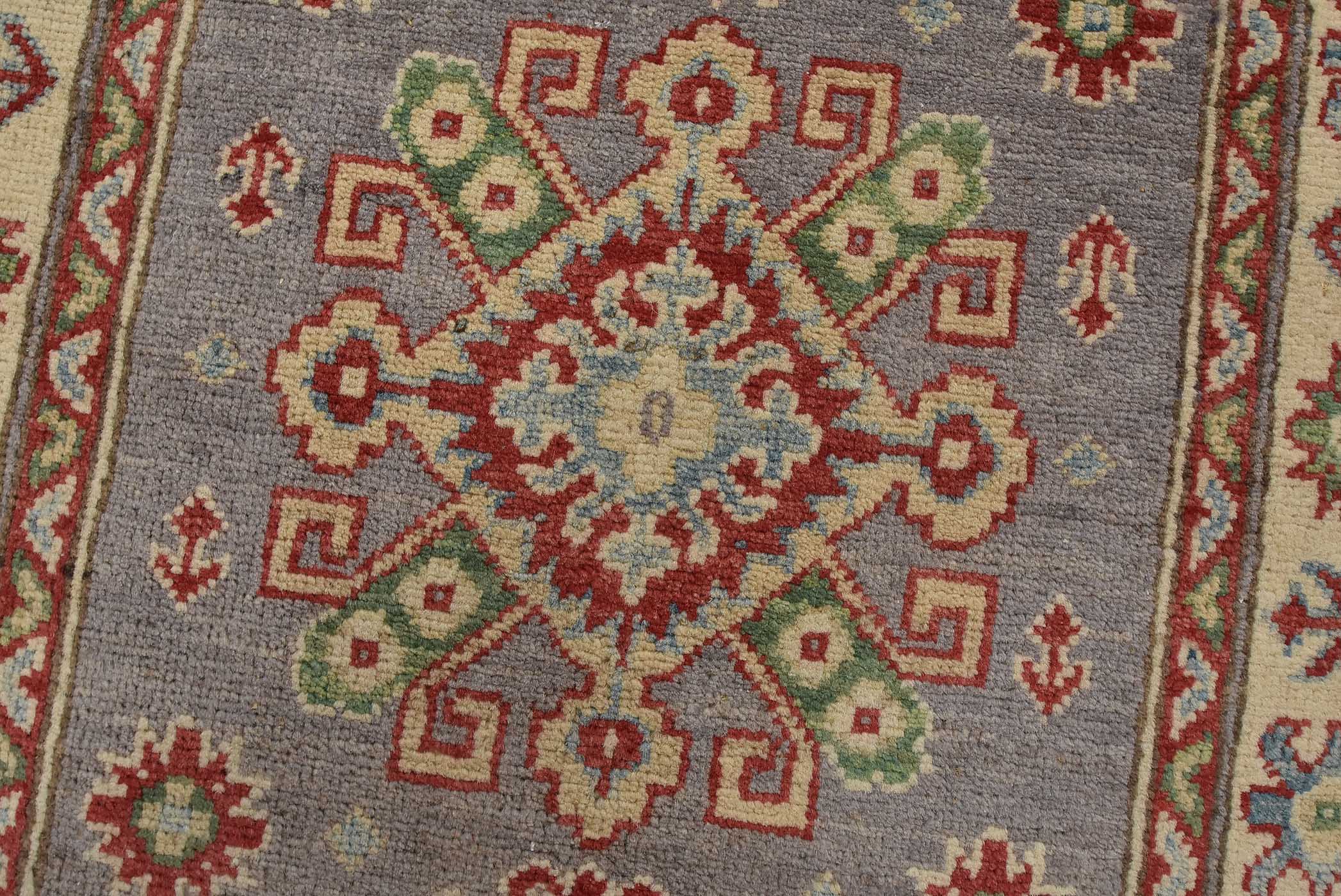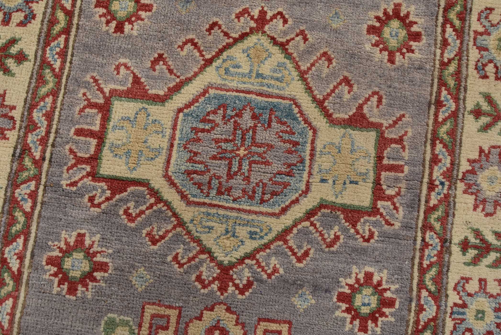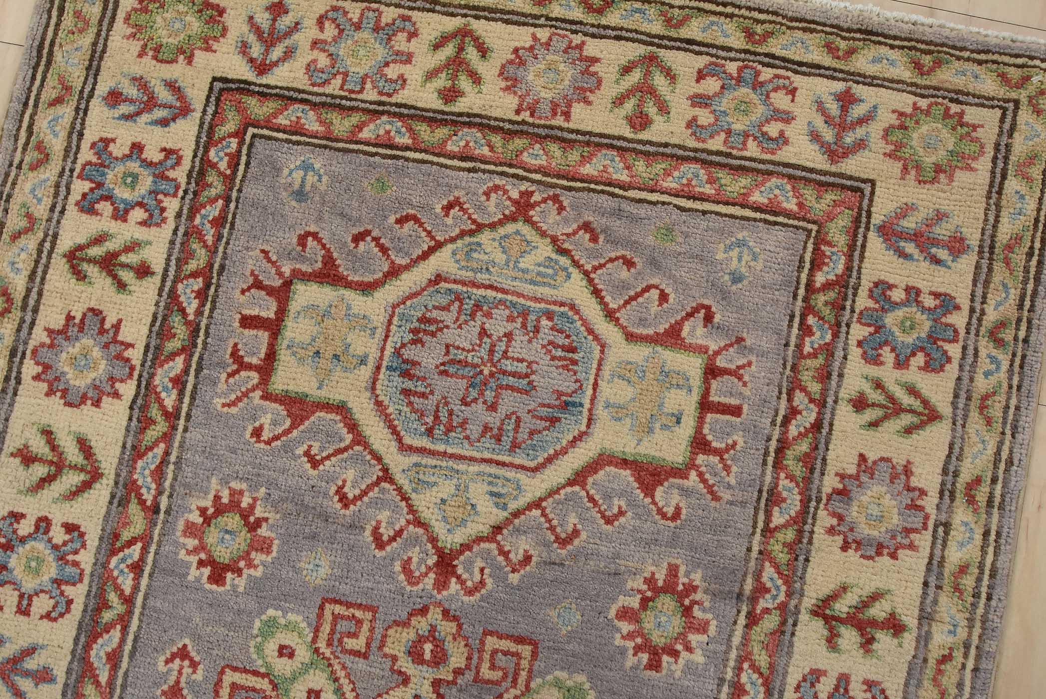 A tribal Caucasian Kazak runner hand-knotted with fine wool on a cotton foundation. This rug features a row of geometric medallions set against a lilac background. It is new and in excellent condition.