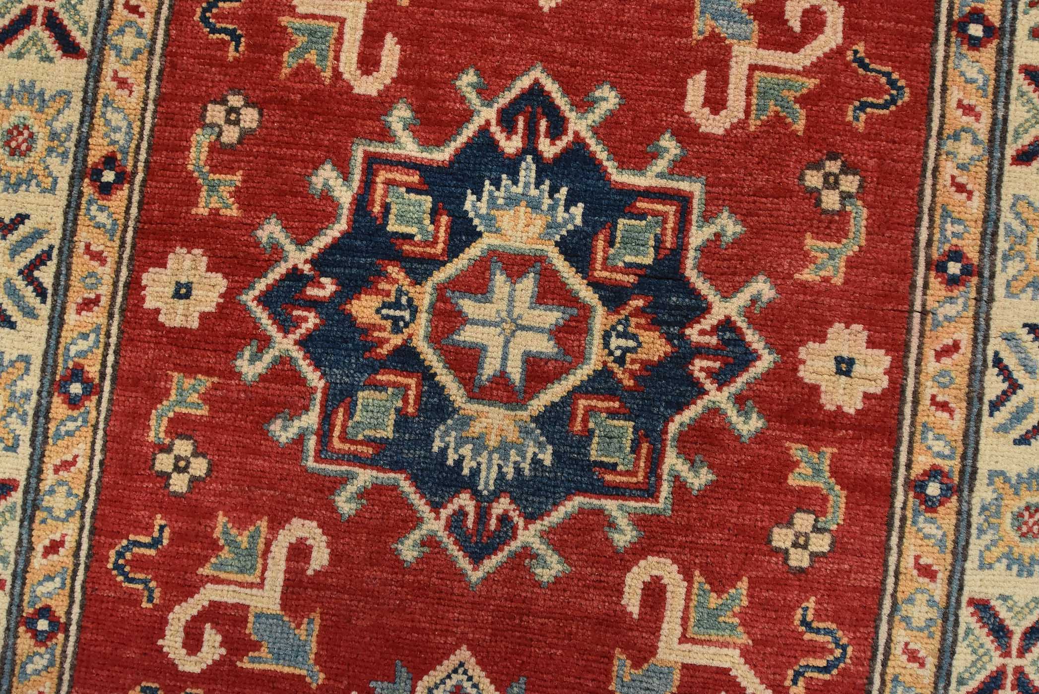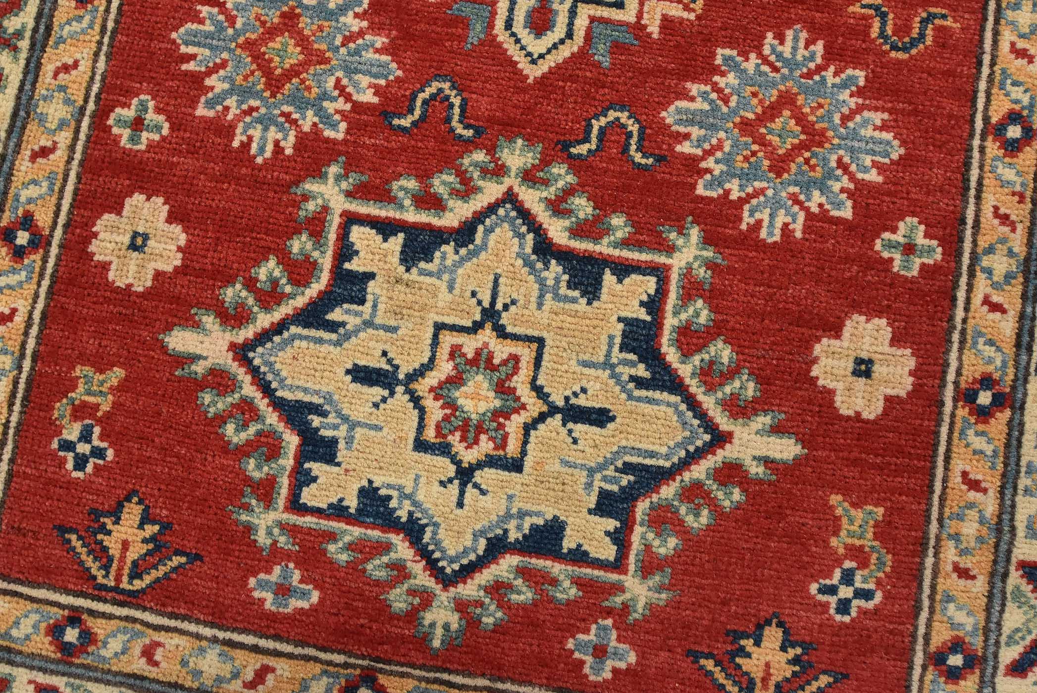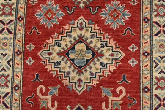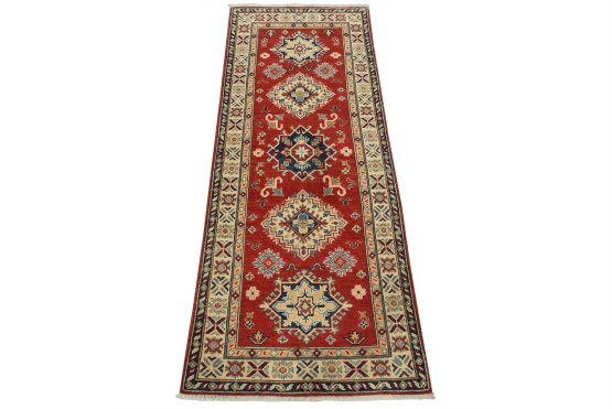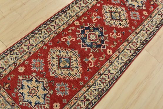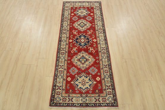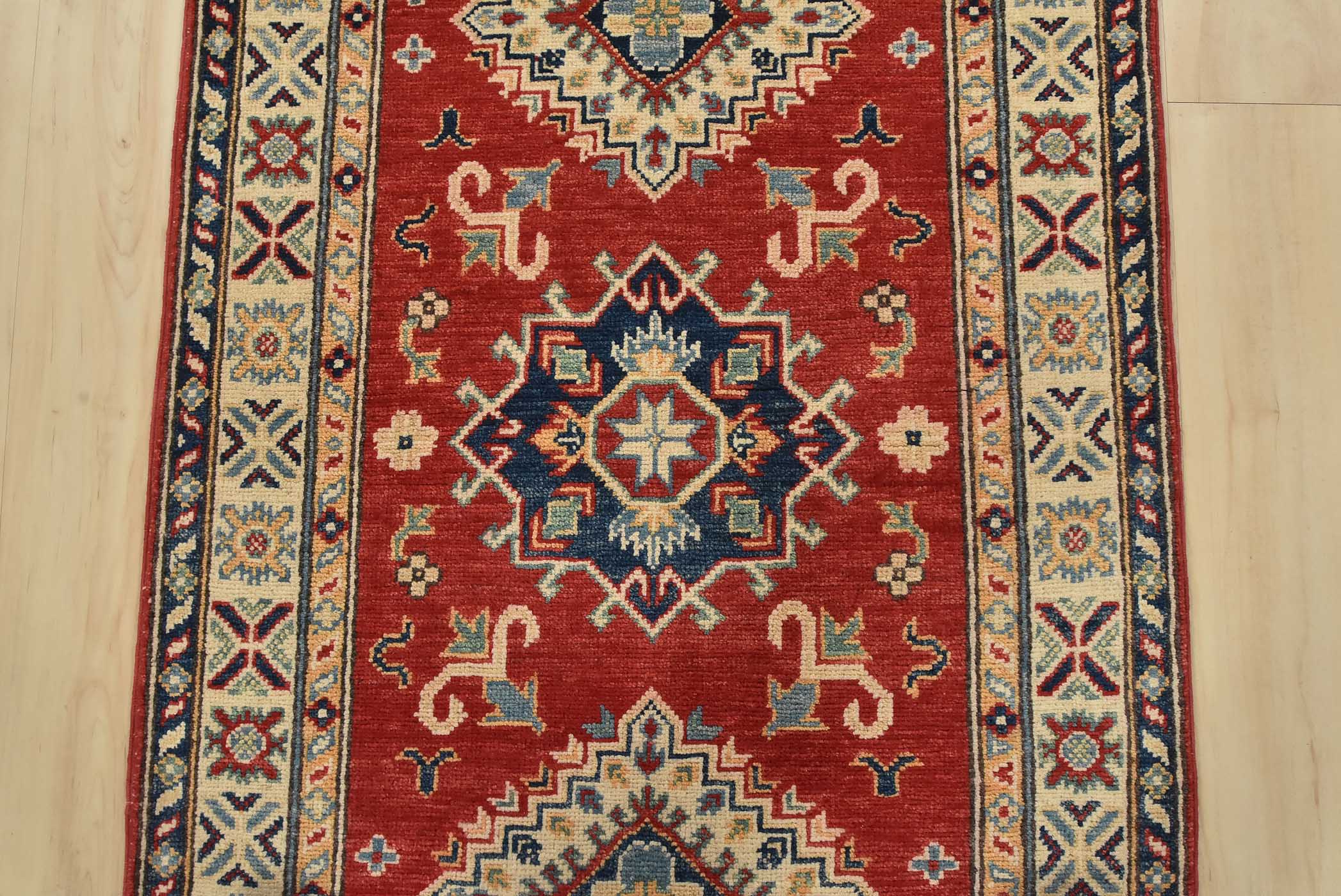A tribal Caucasian Kazak runner hand-knotted with fine wool on a cotton foundation. This rug features geometric medallions surrounded by small geometric floral motifs set against a red background. It is new and in excellent condition.